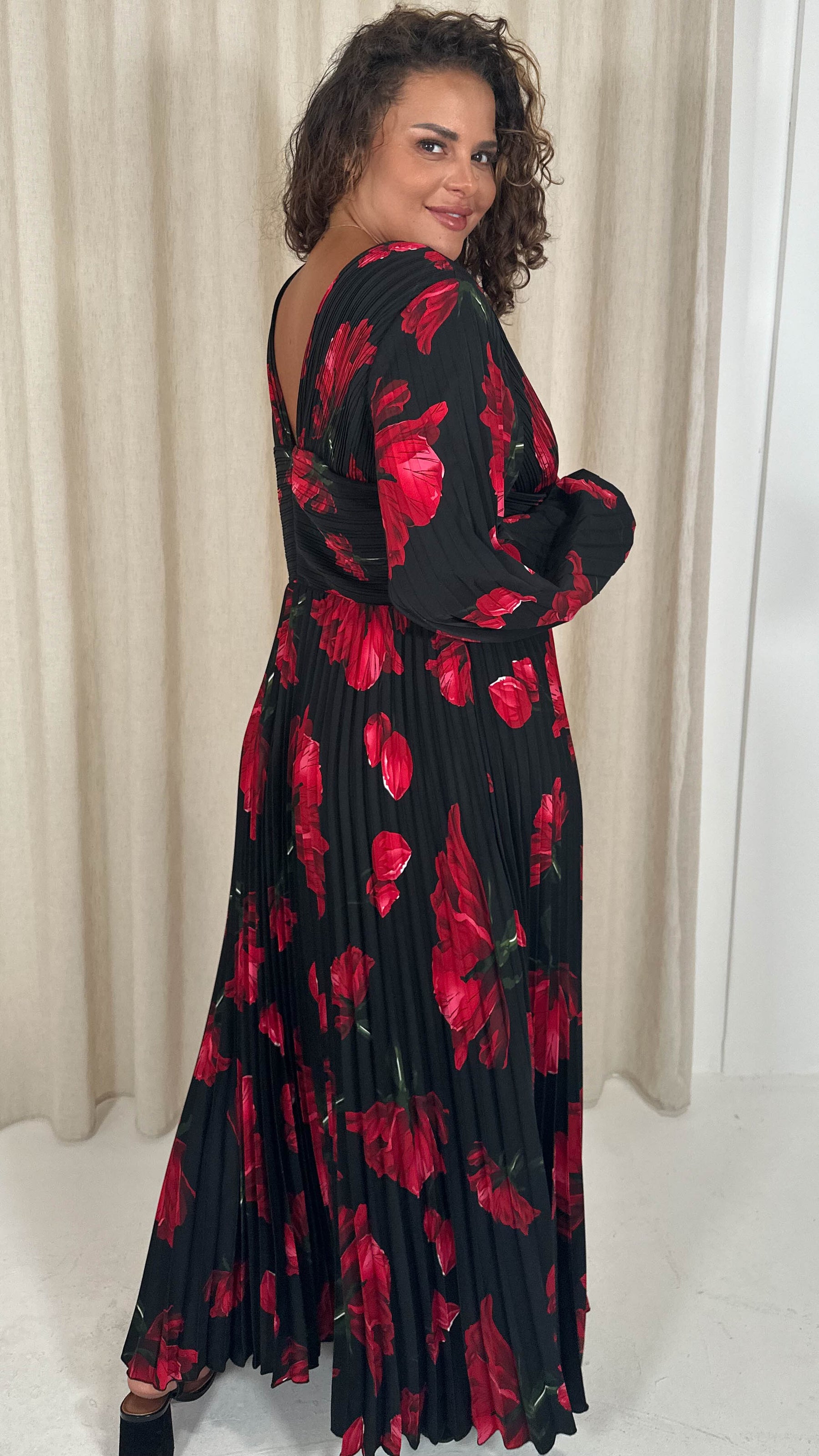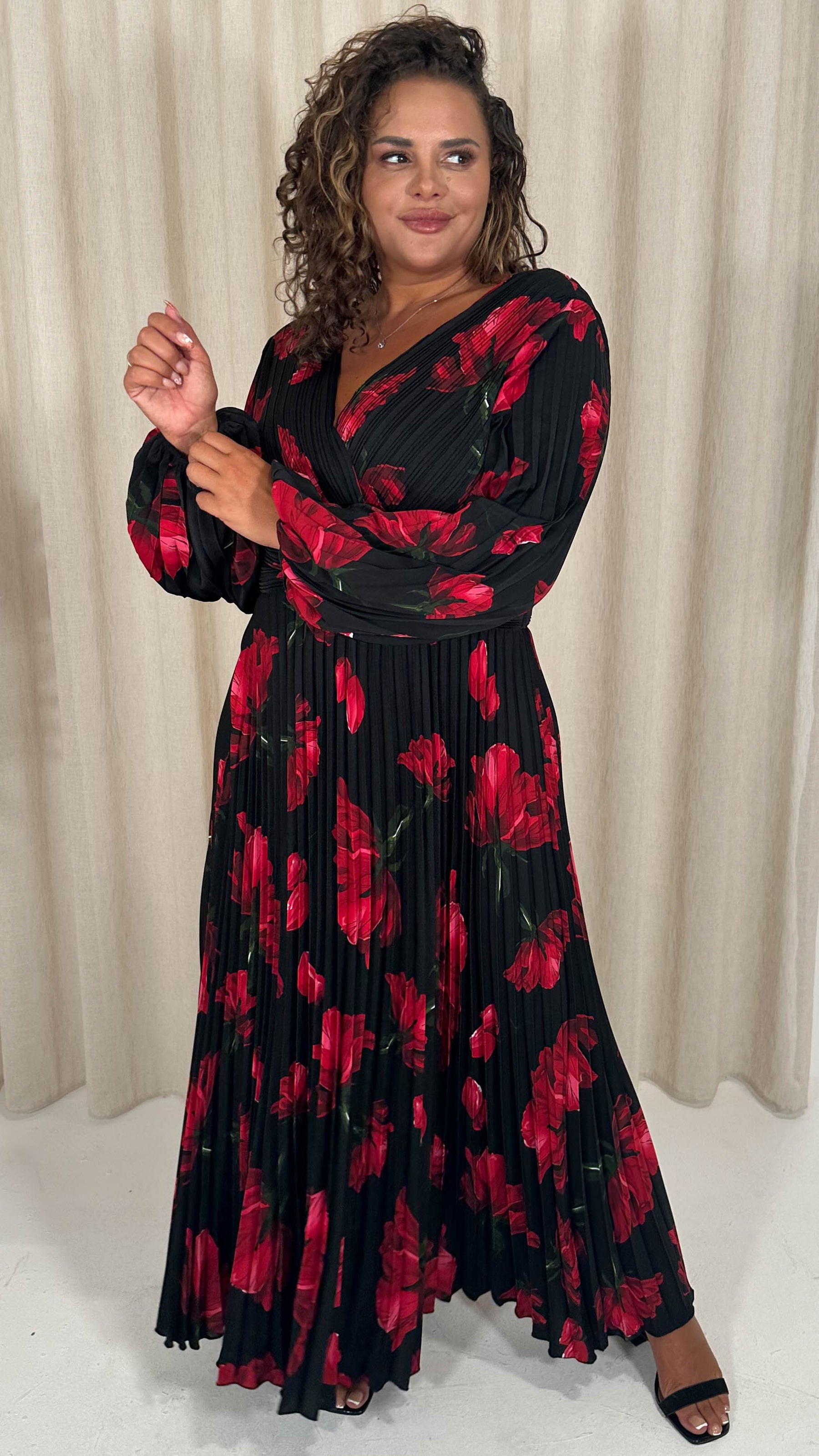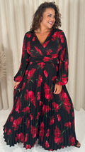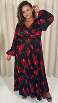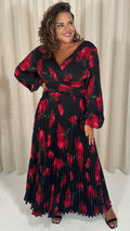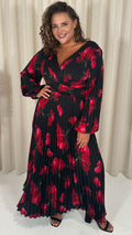 CurveWow Pleated Wrap Maxi Dress Black and Red Floral