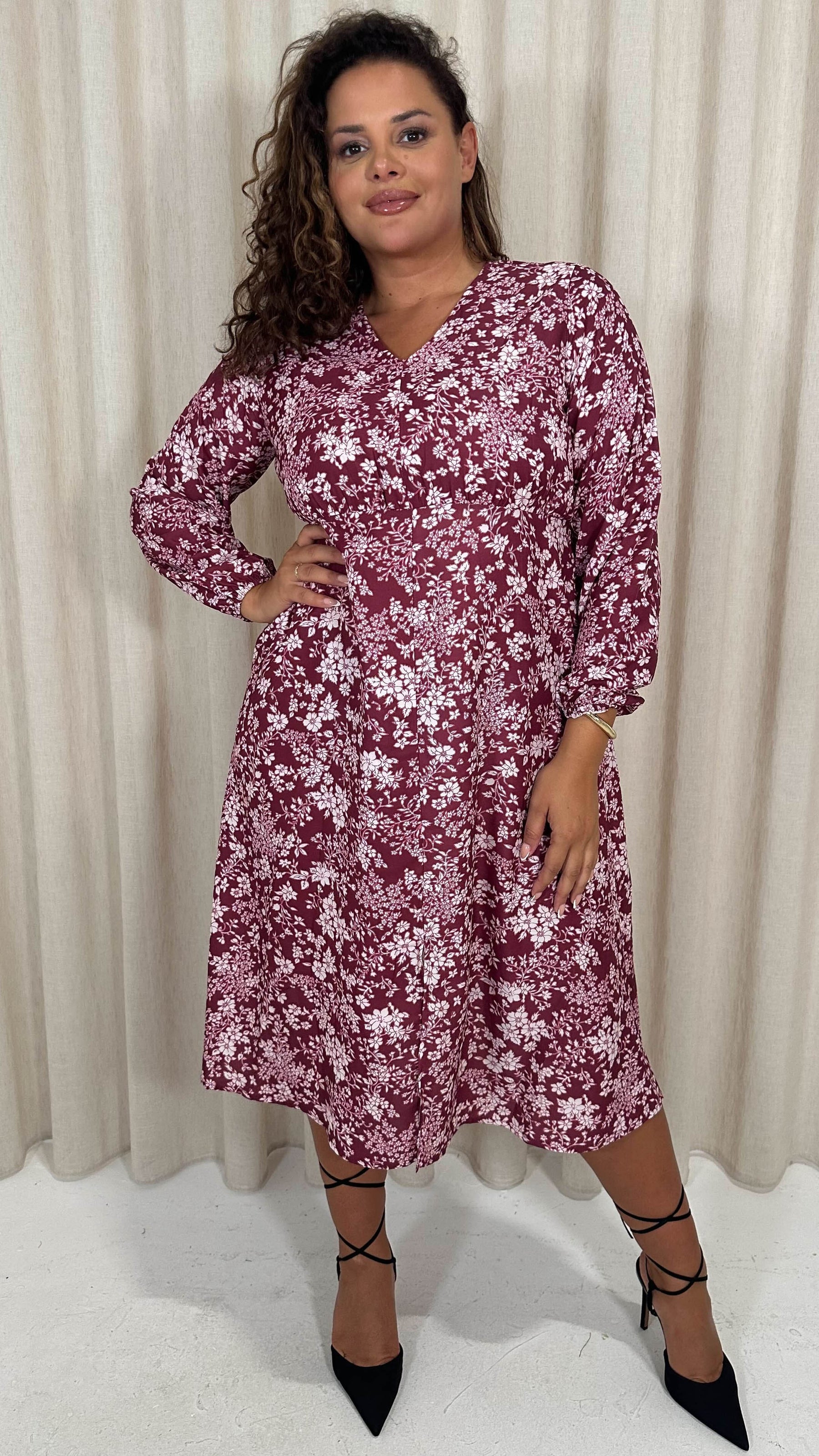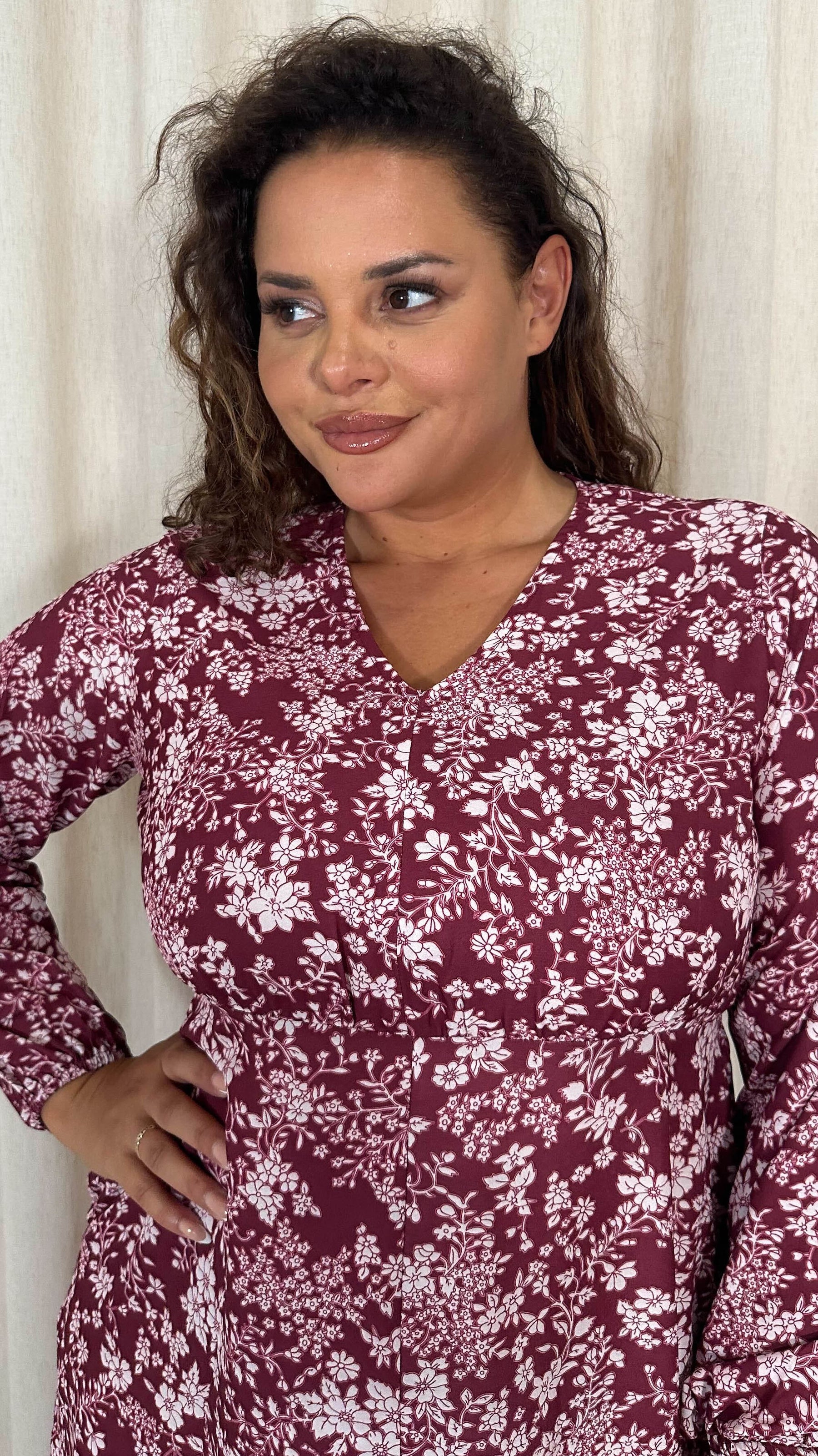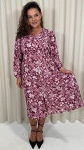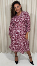 CurveWow V Neck Front Slit Midi Dress Wine Floral
