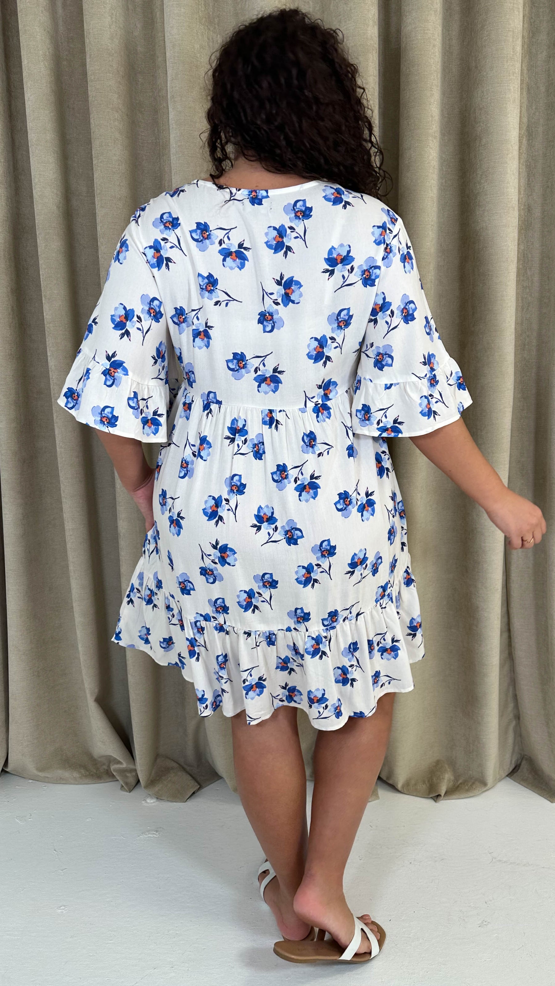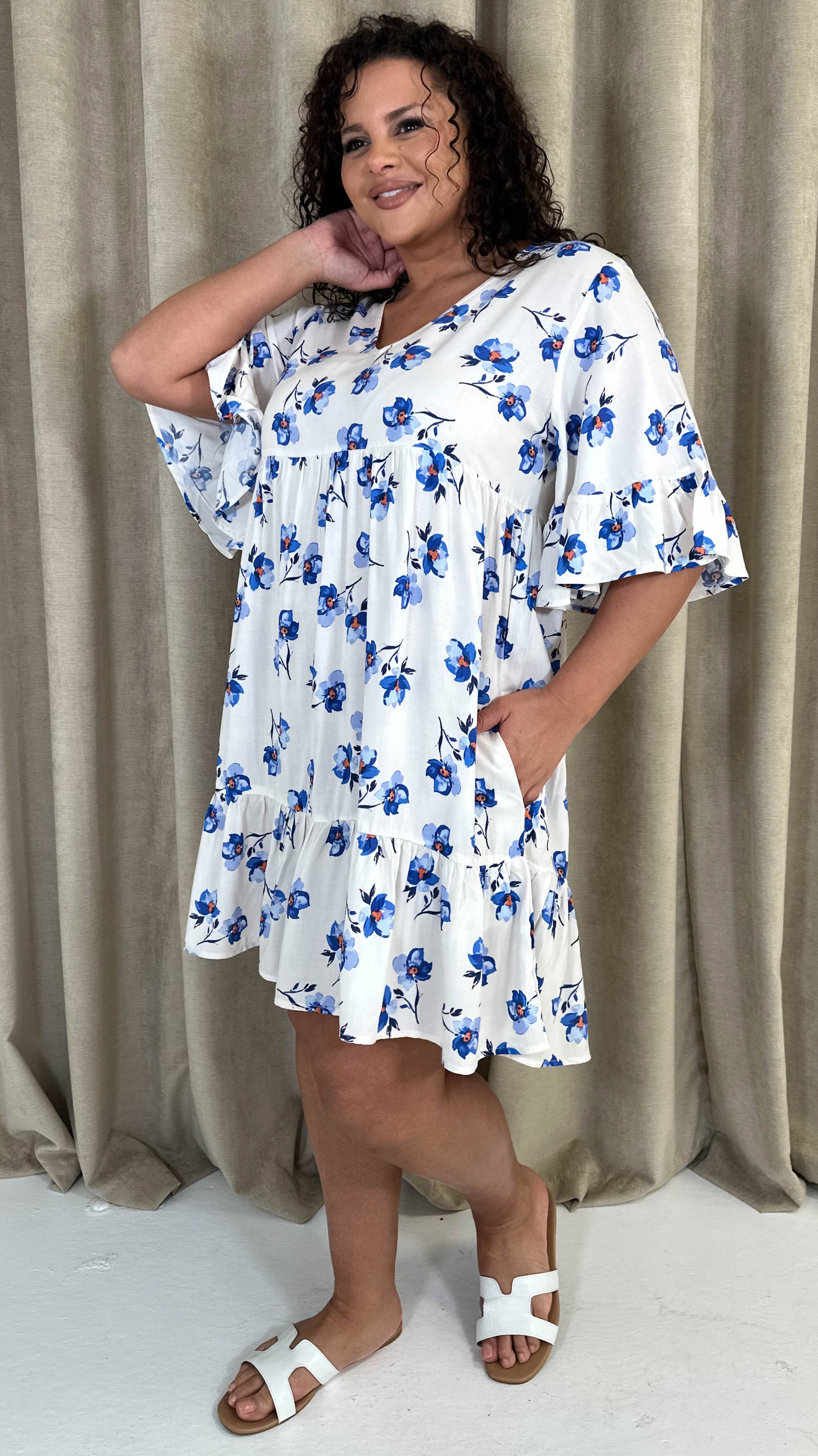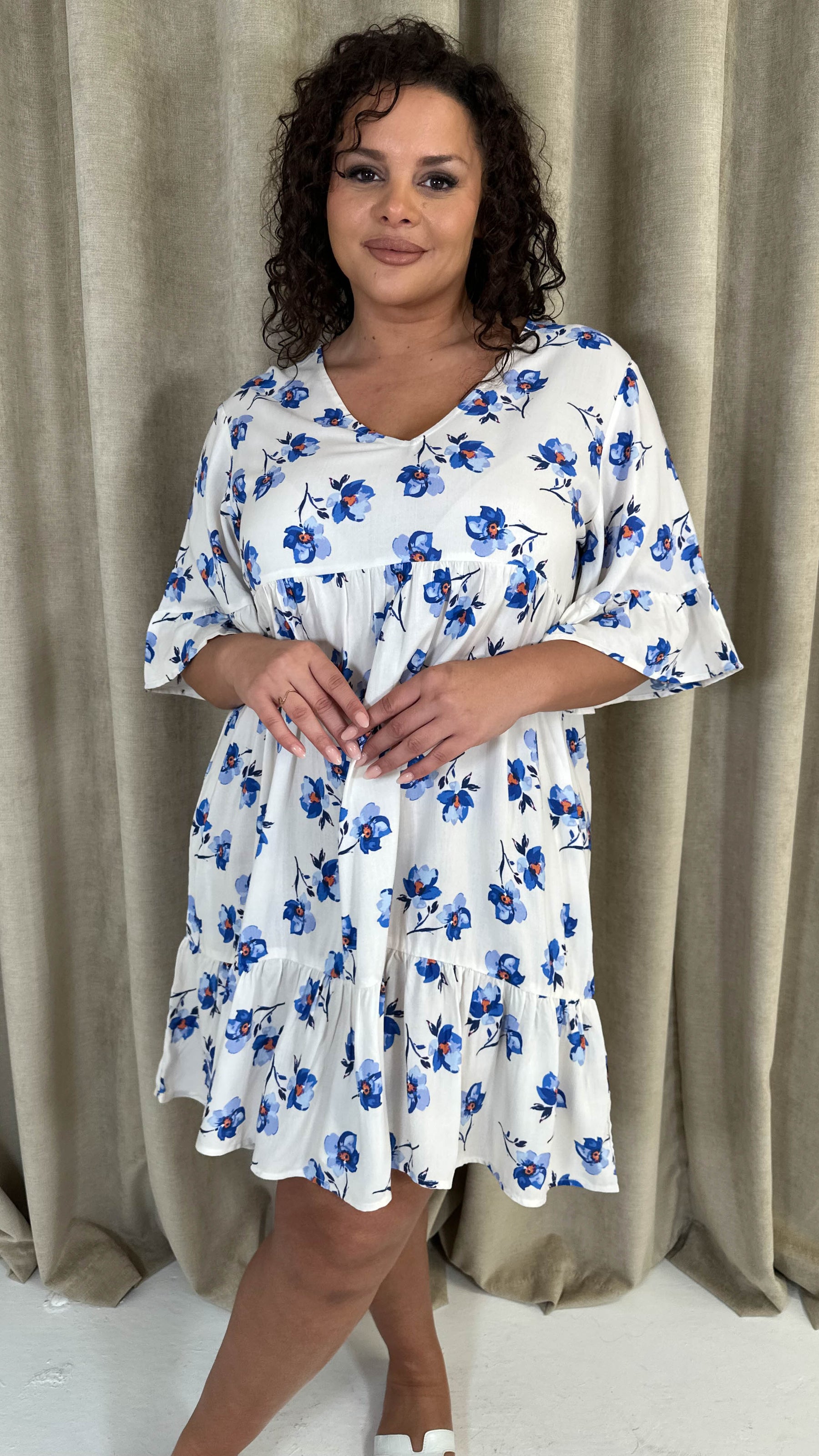 CurveWow Vneck Frill Sleeve Smock Dress Ivory Floral