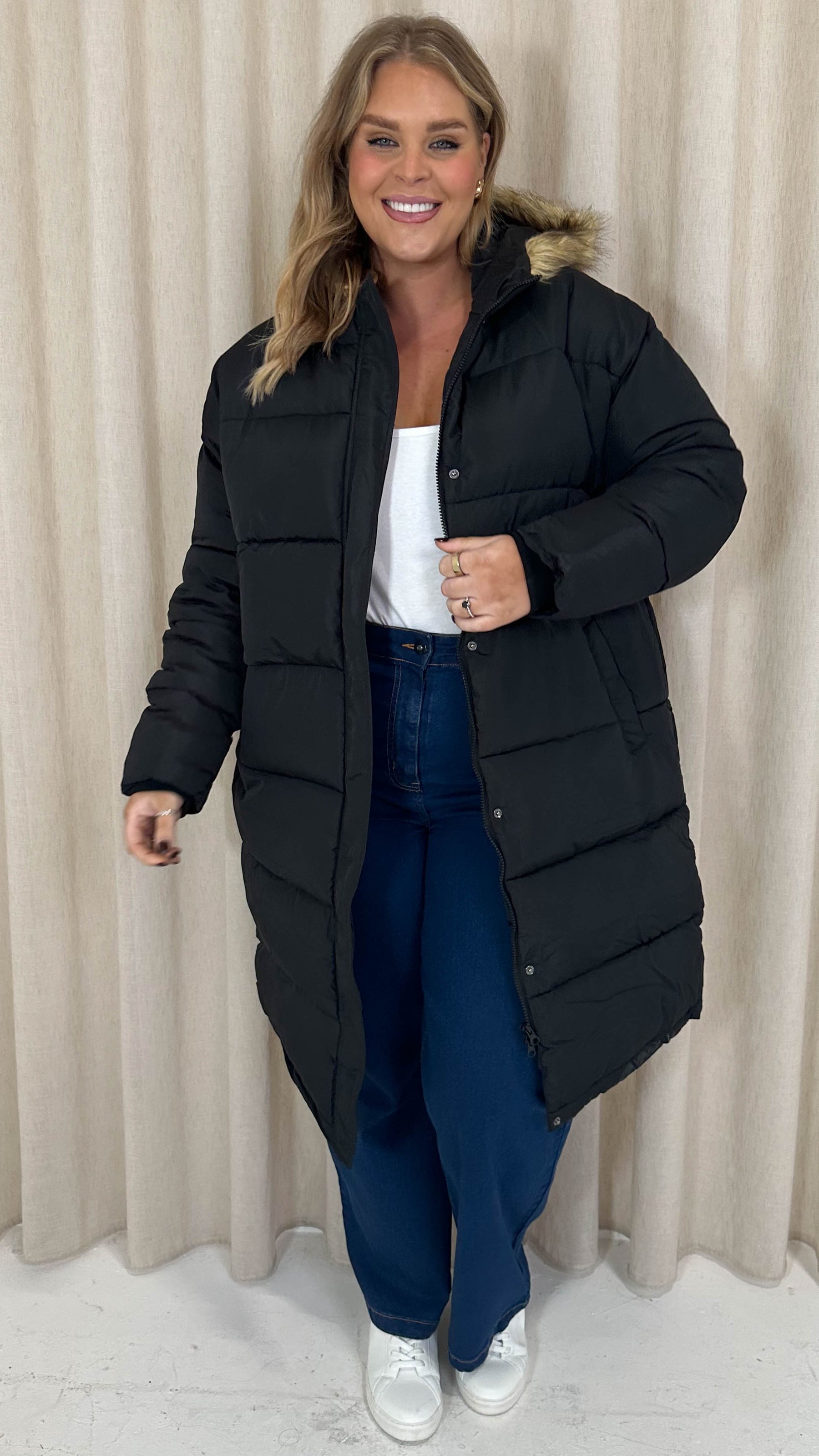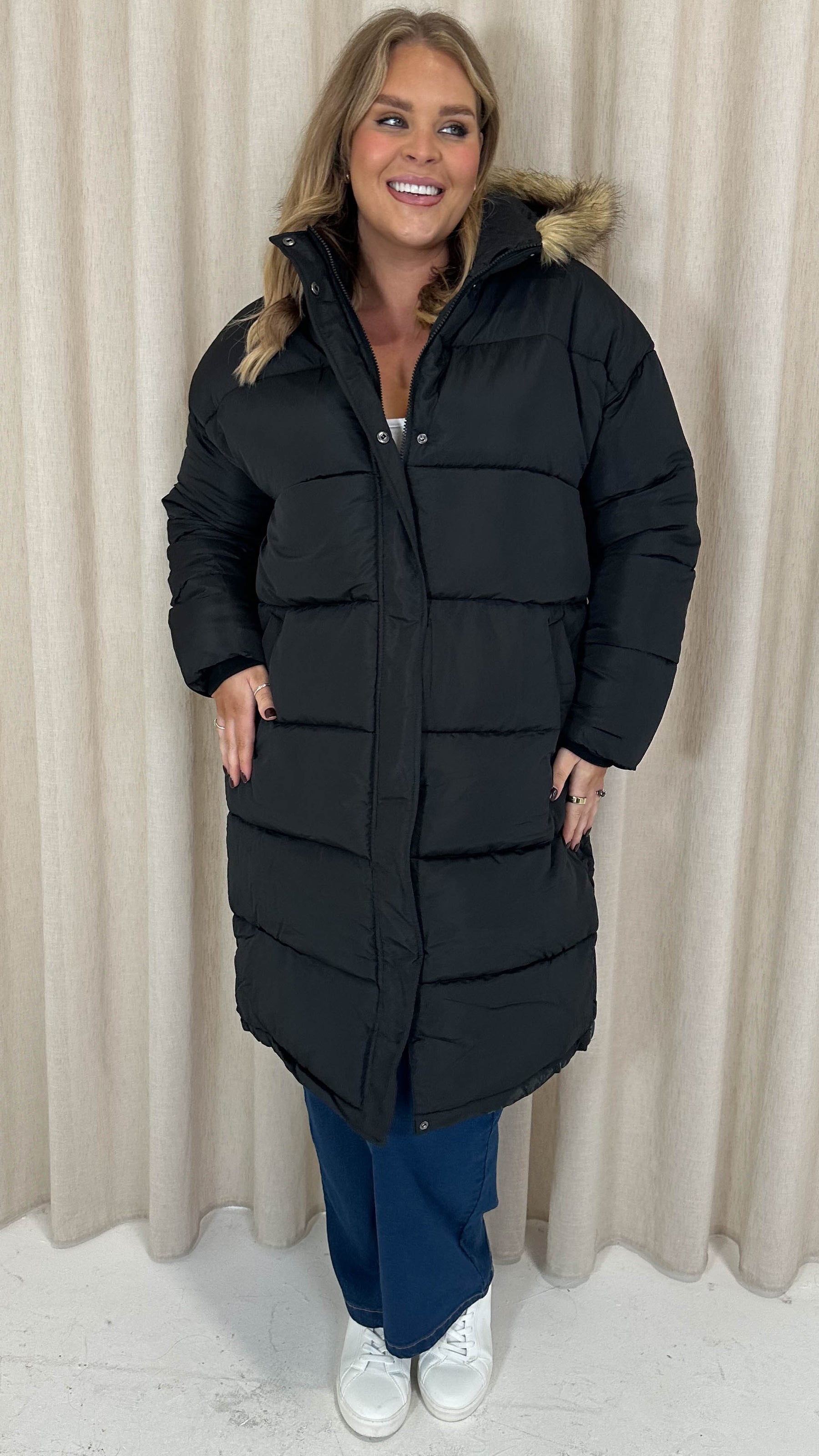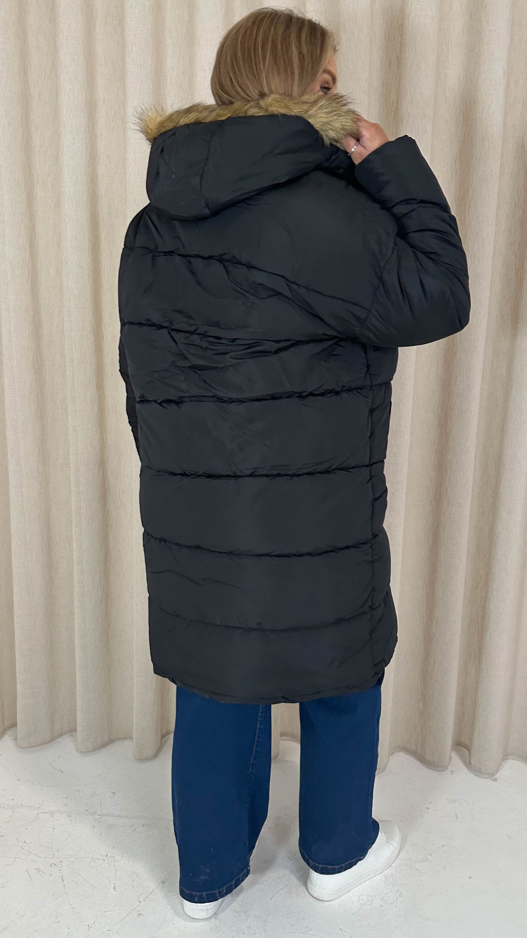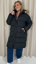 CurveWow Longline Faux Fur Hood Parka Coat Black