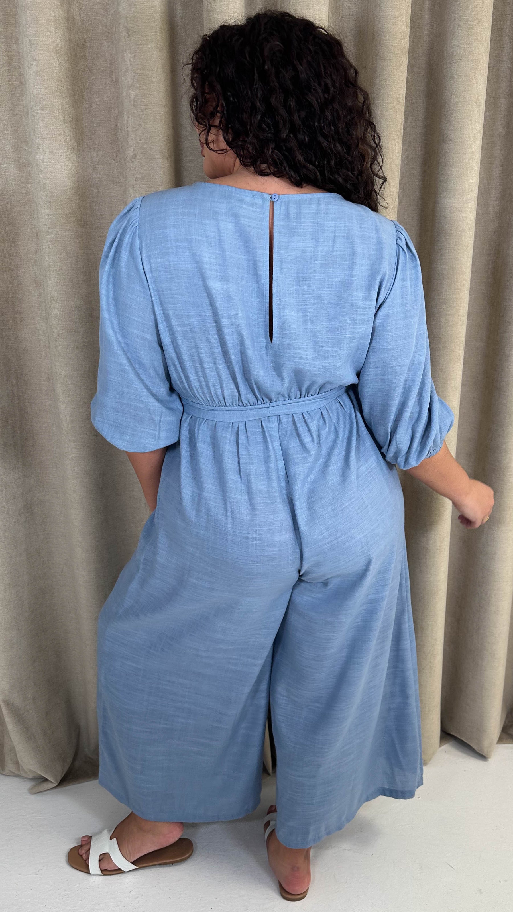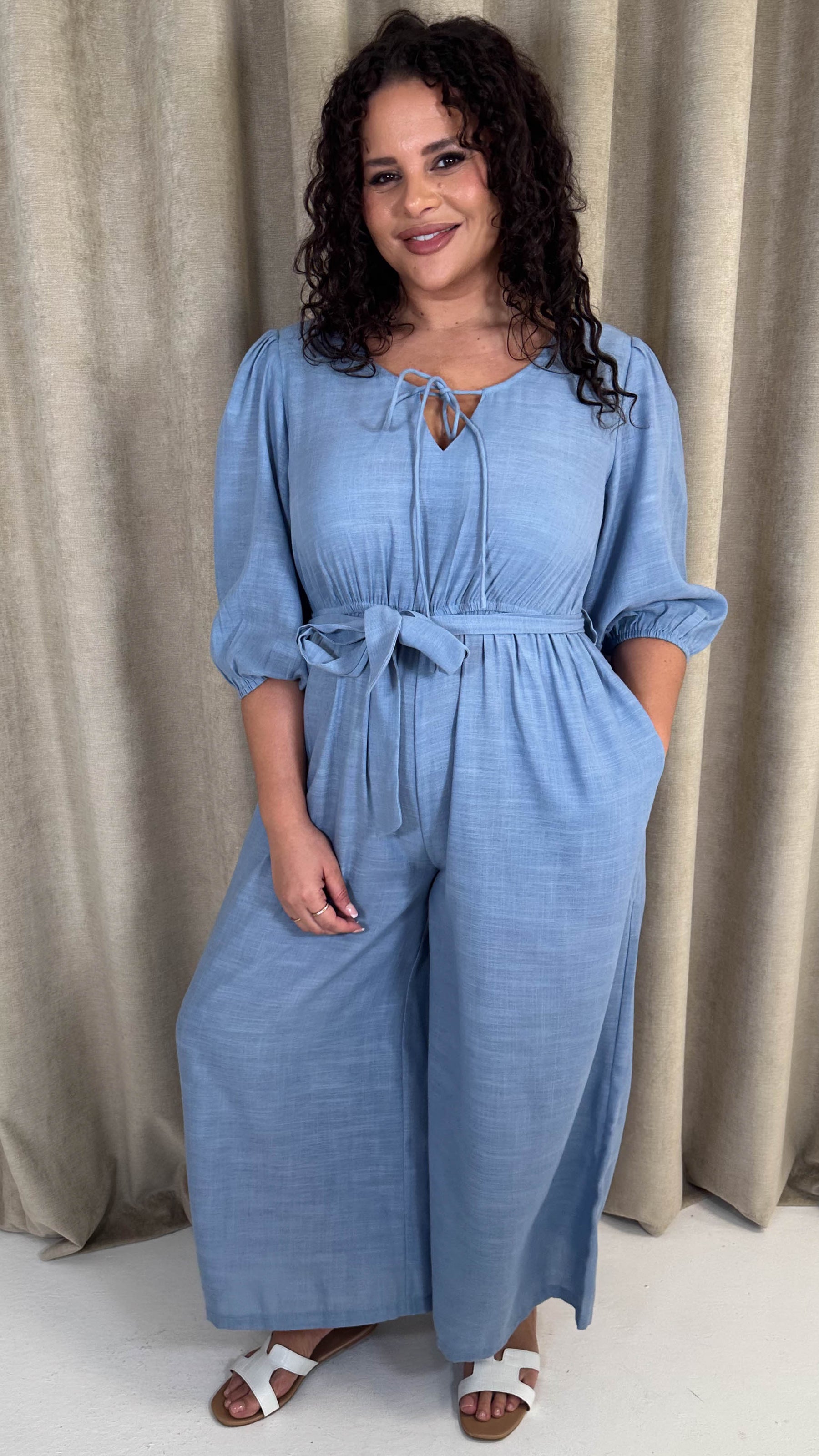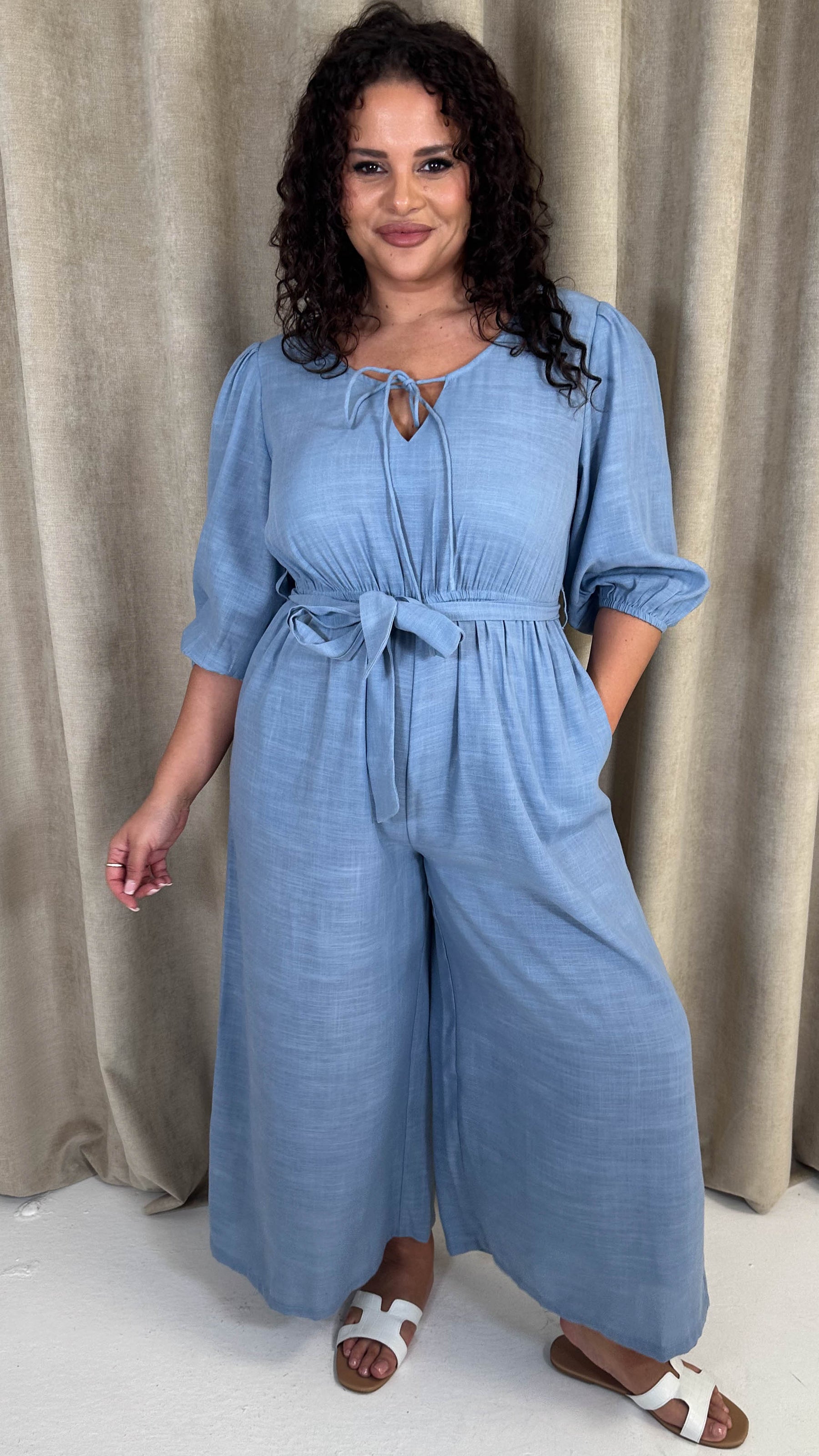 CurveWow Tie Front Wide Leg Jumpsuit Dusty Blue