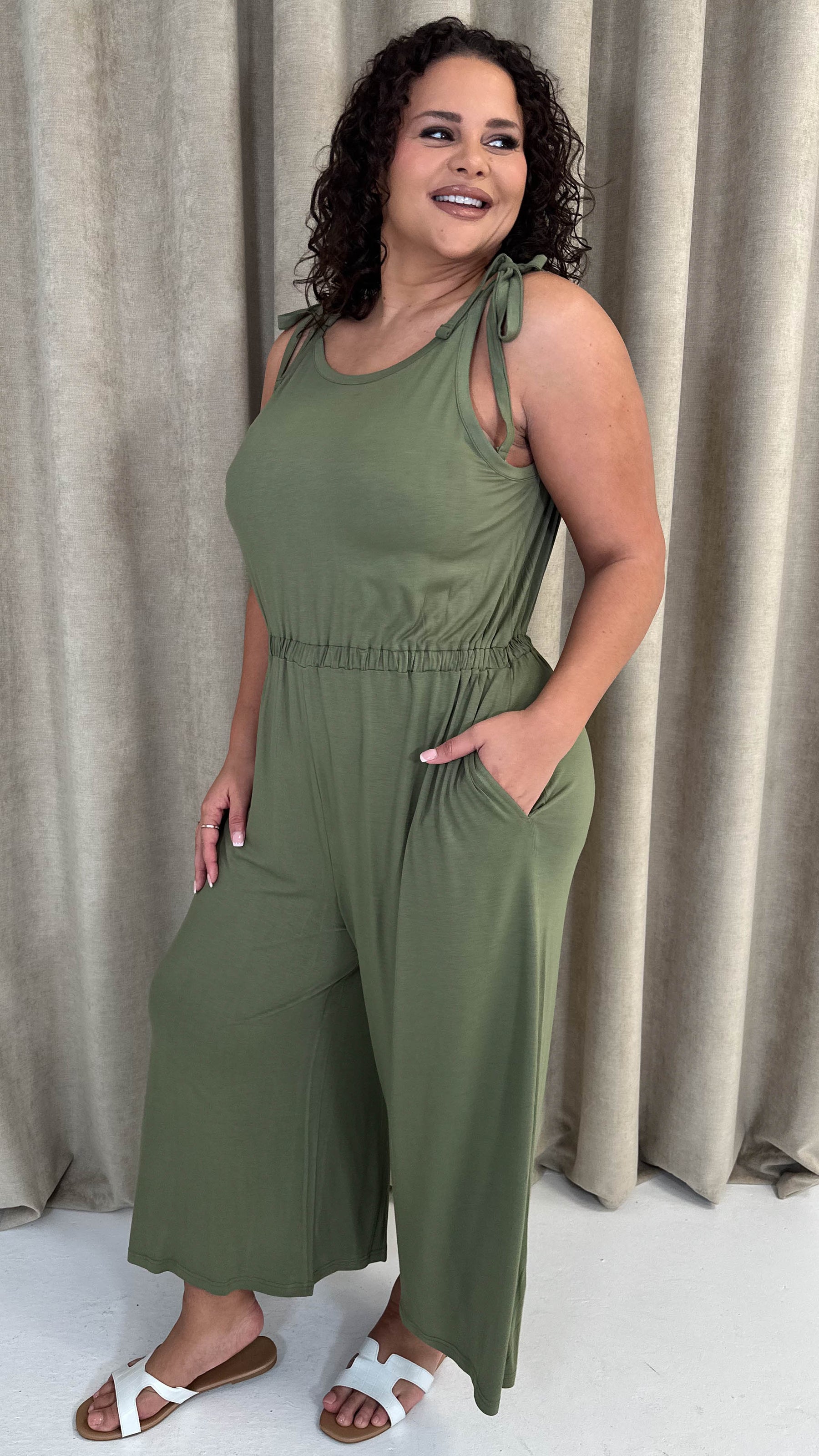 CurveWow Tie Waist Culotte Jumpsuit Khaki