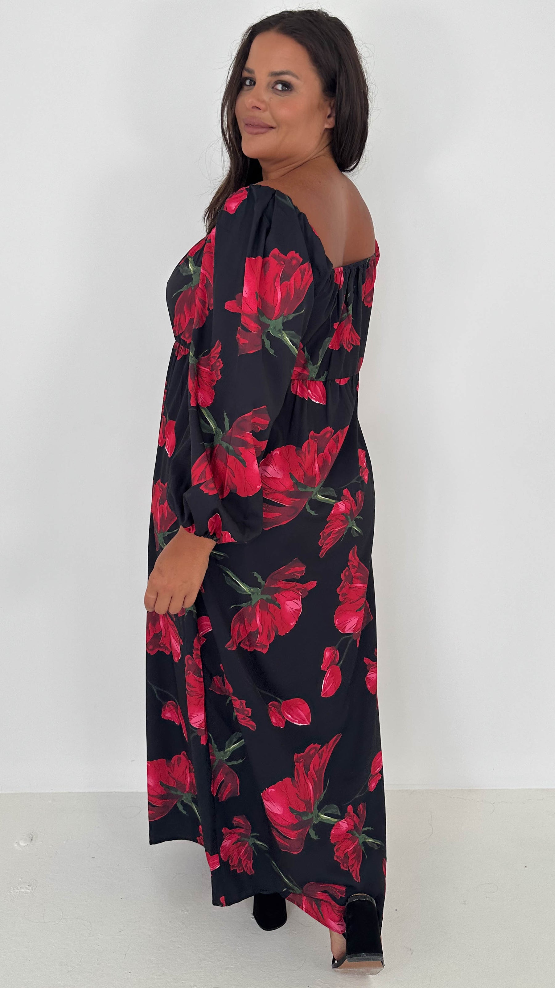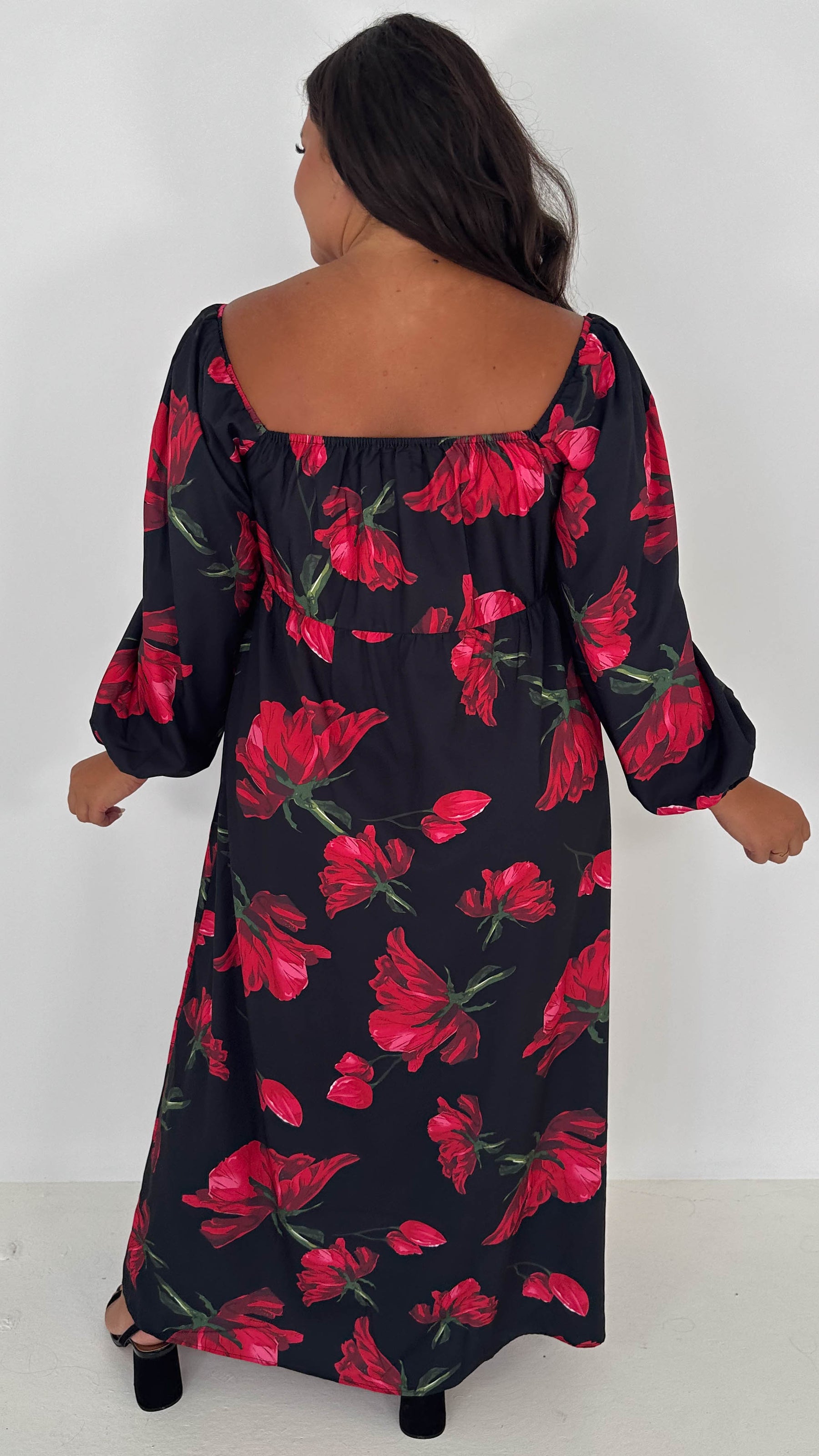 CurveWow Square Neck Maxi Dress Black & Red Floral