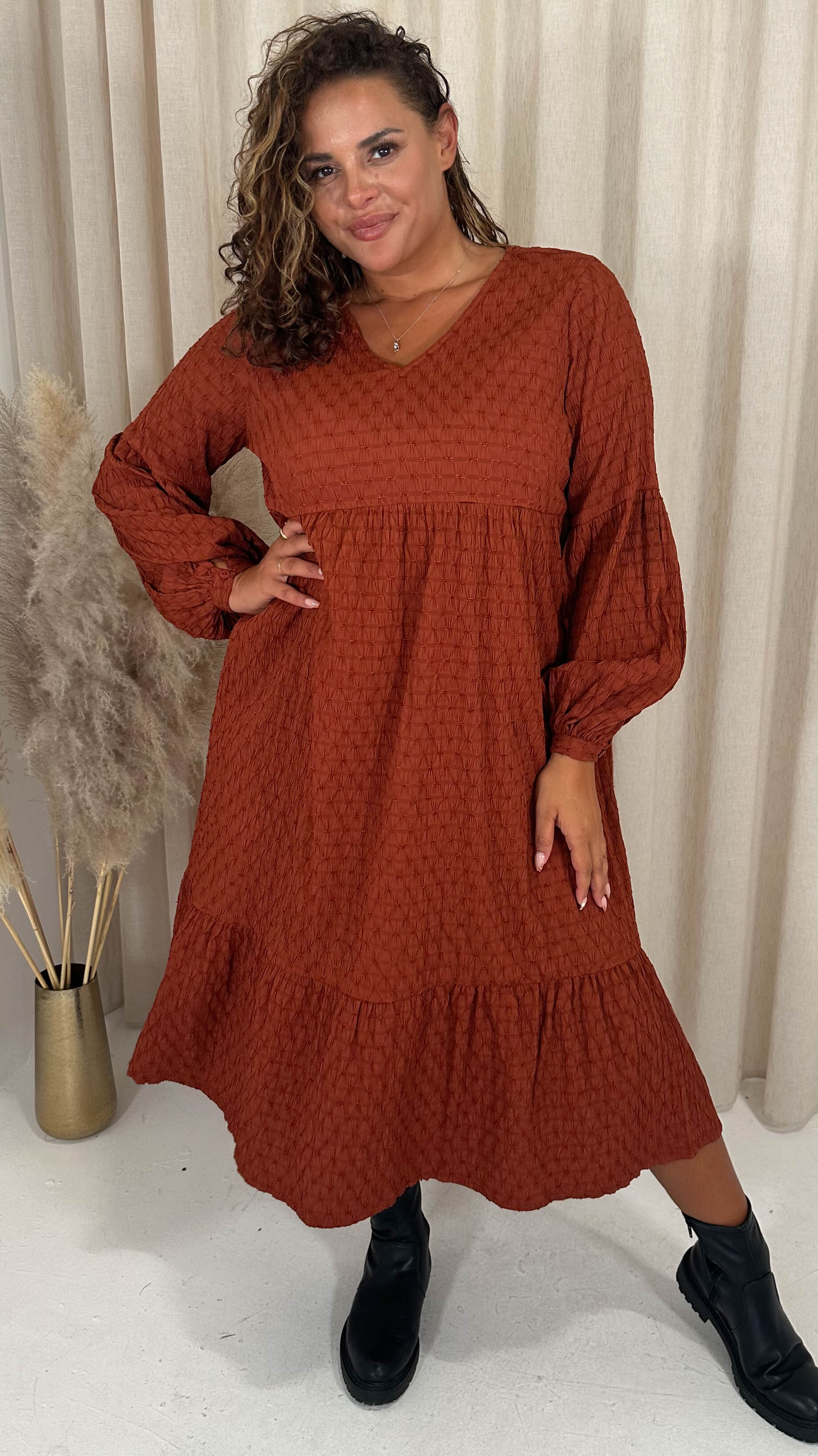 CurveWow Textured V Neck Smock Dress Rust