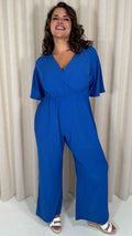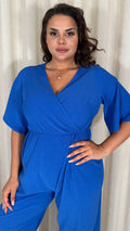 CurveWow Textured Angel Sleeve Wrap Wide Leg Jumpsuit Blue