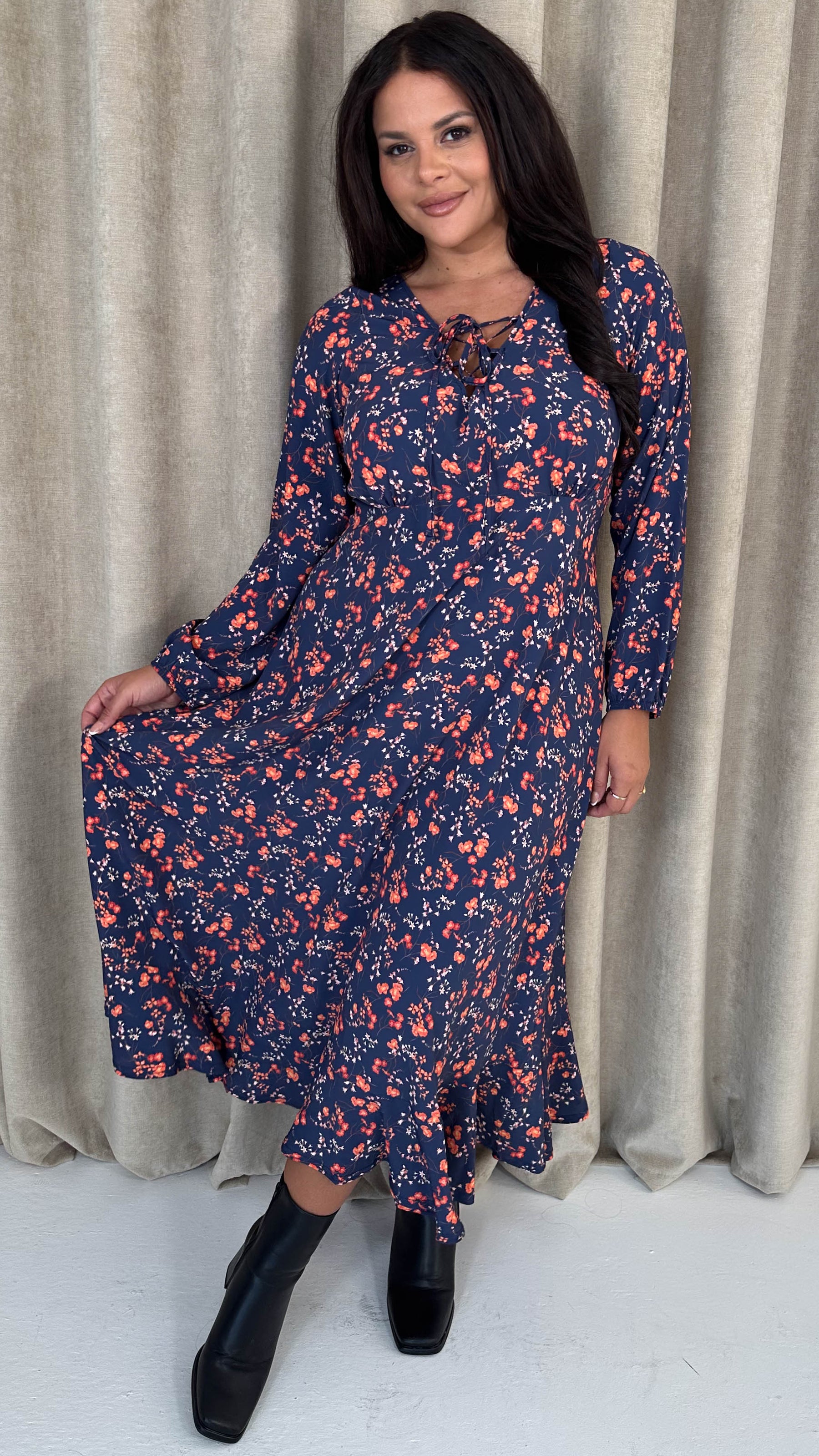 CurveWow Lace Front Frill Hem Midi Dress Navy Floral