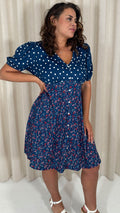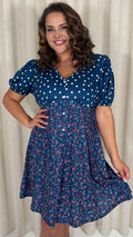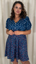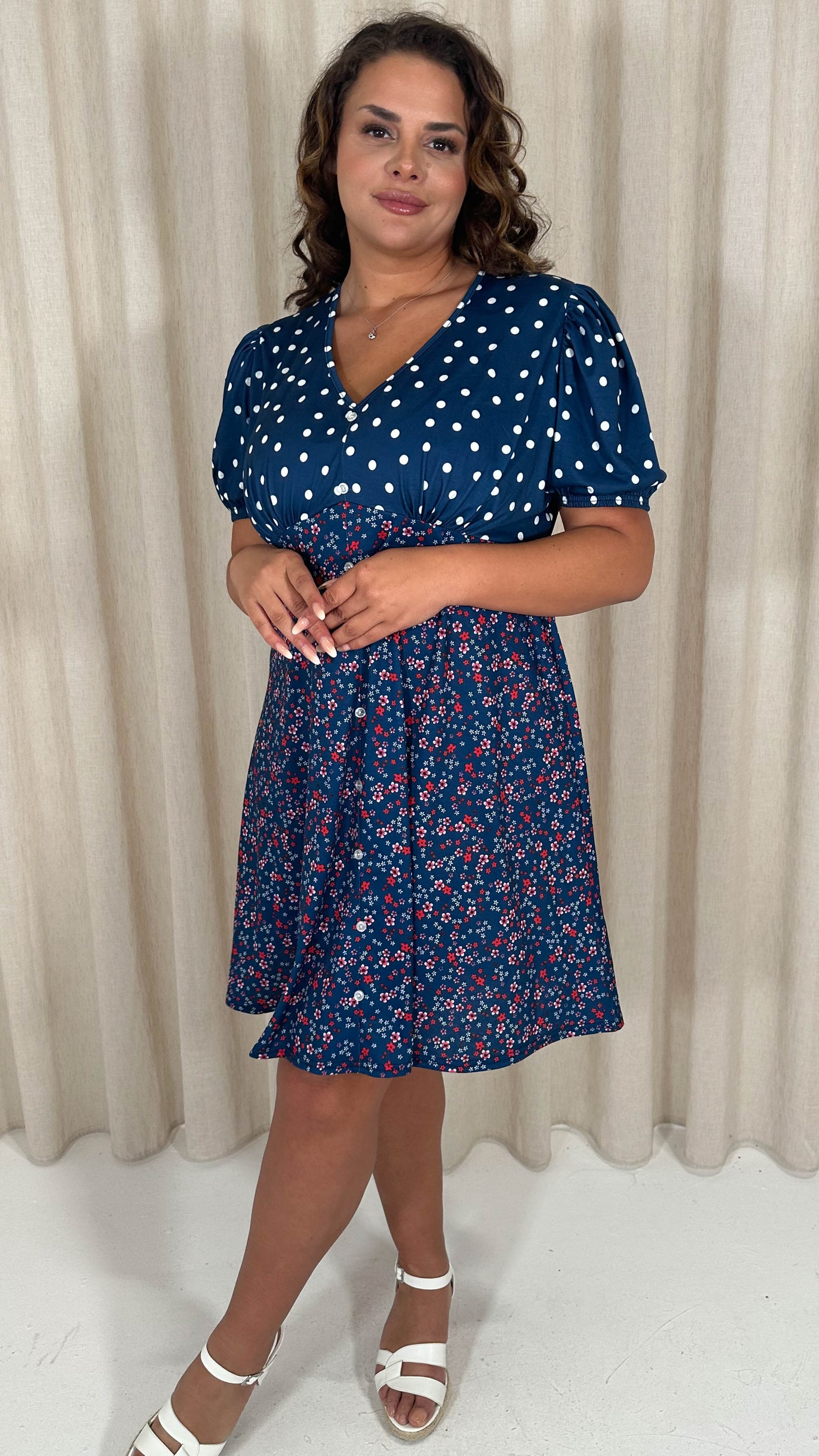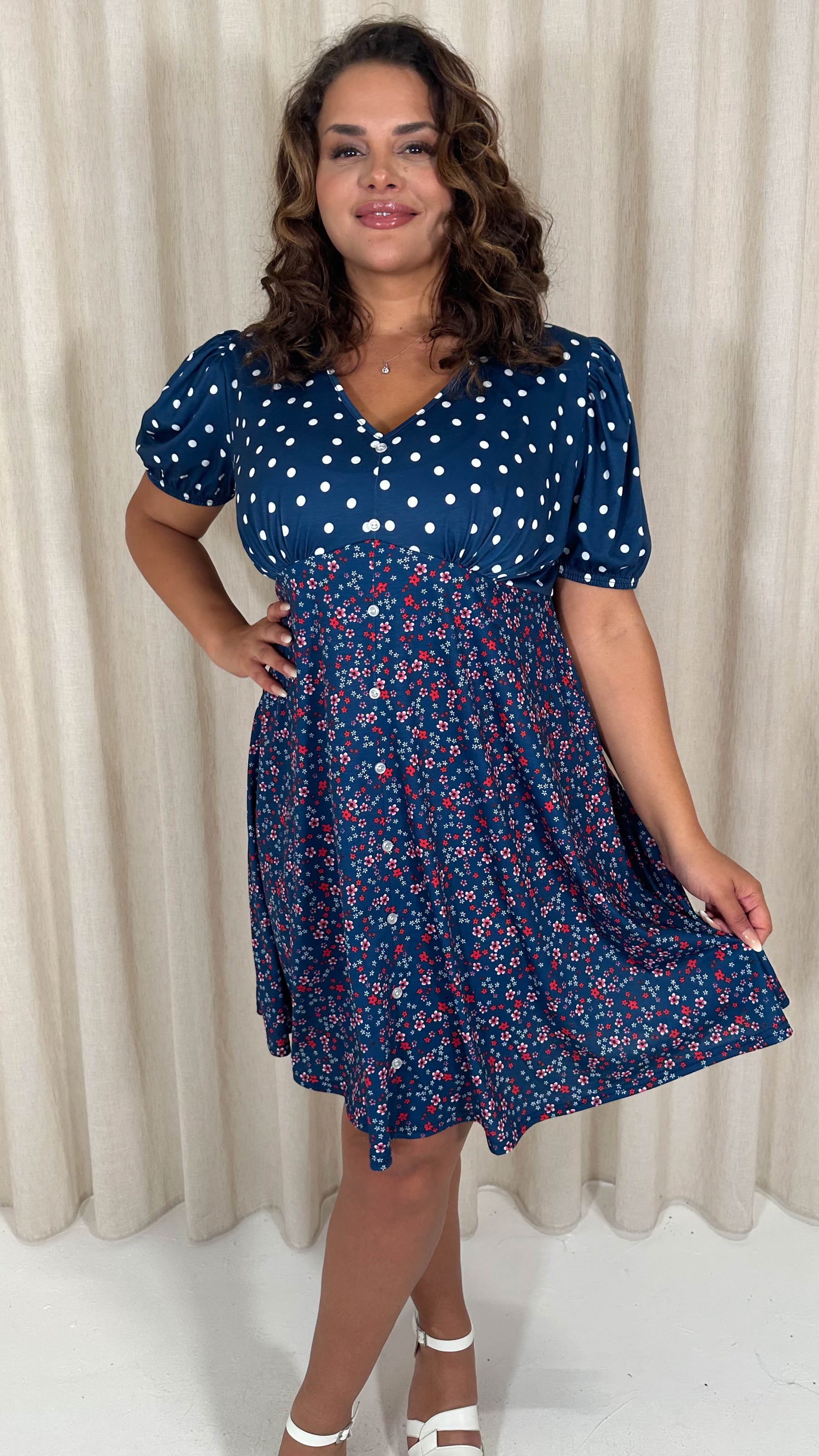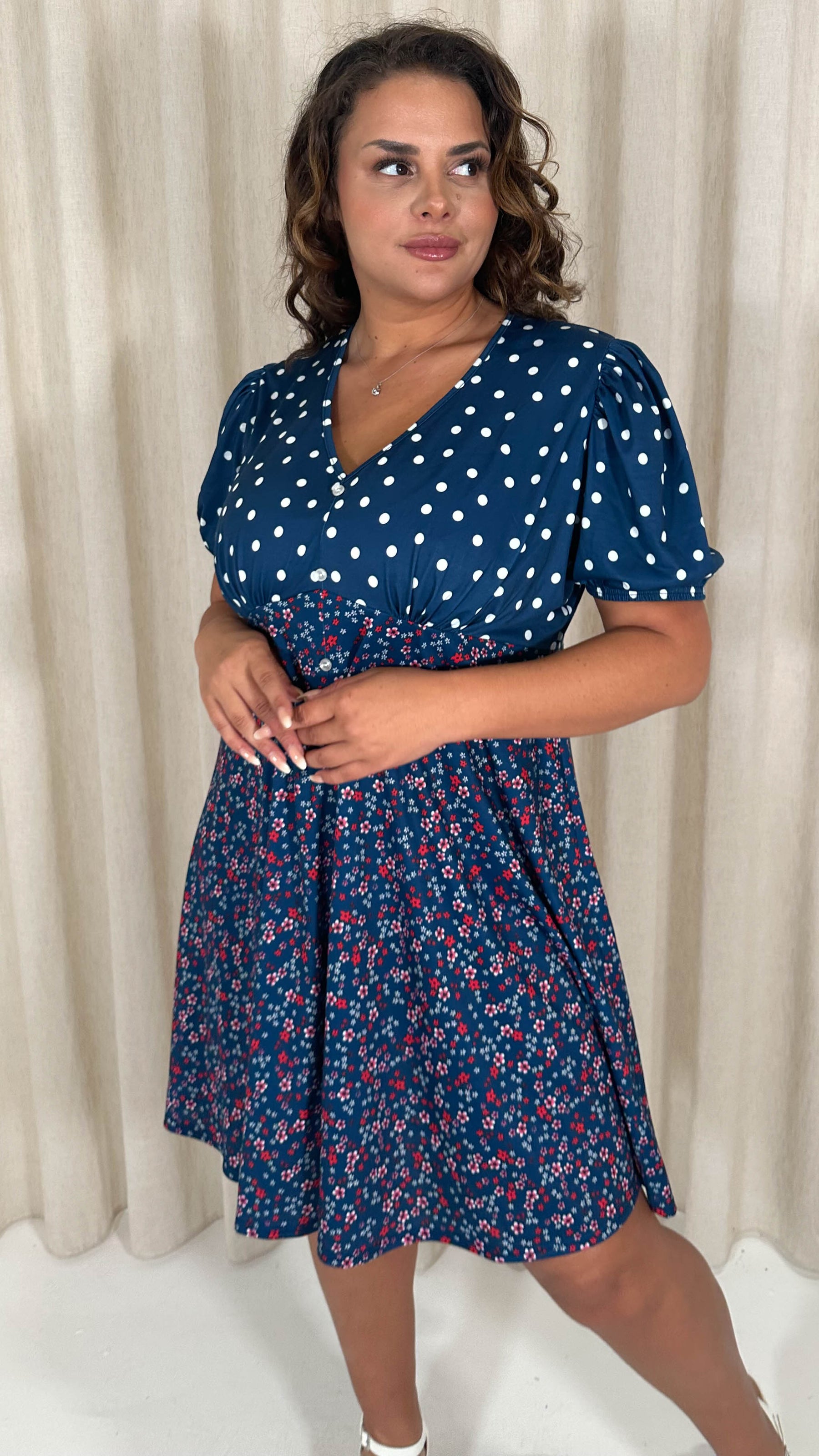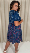 CurveWow Mock Button Mix Match Print Skater Dress Navy Mix