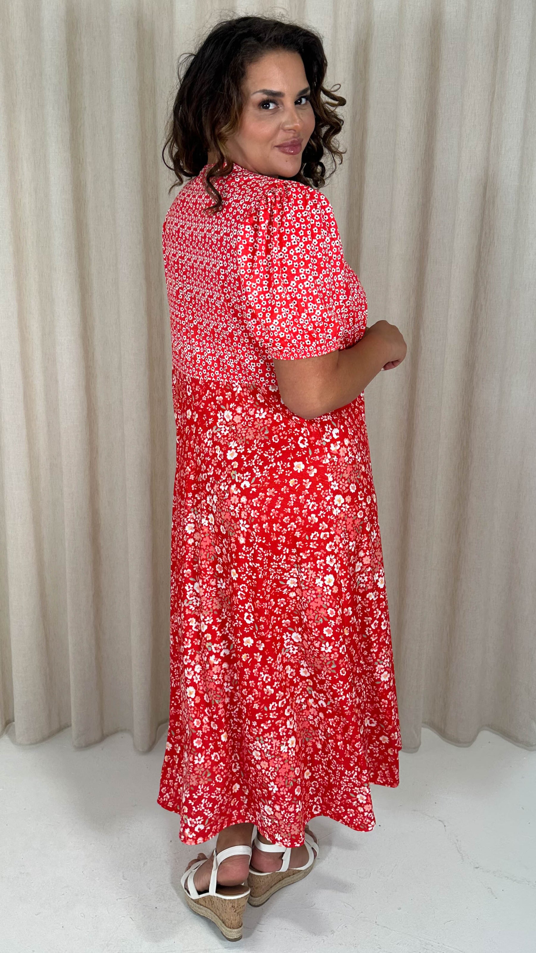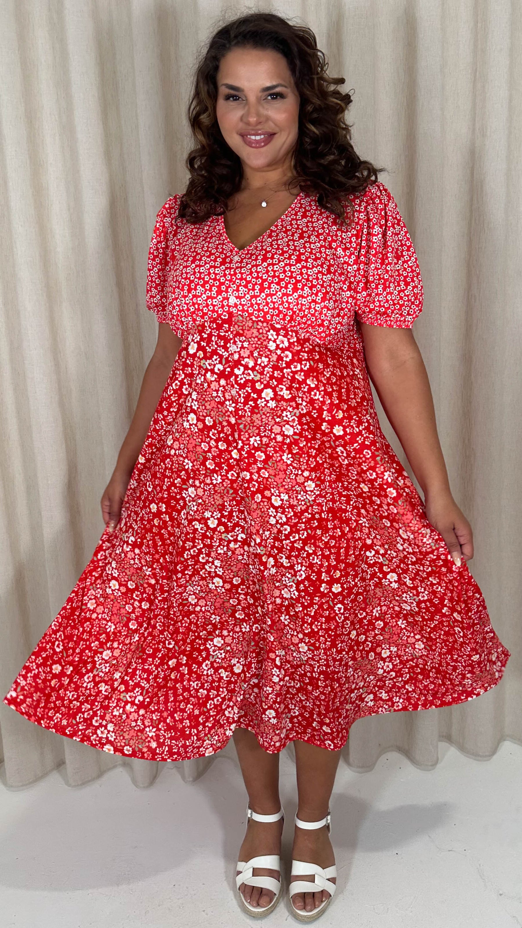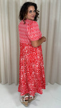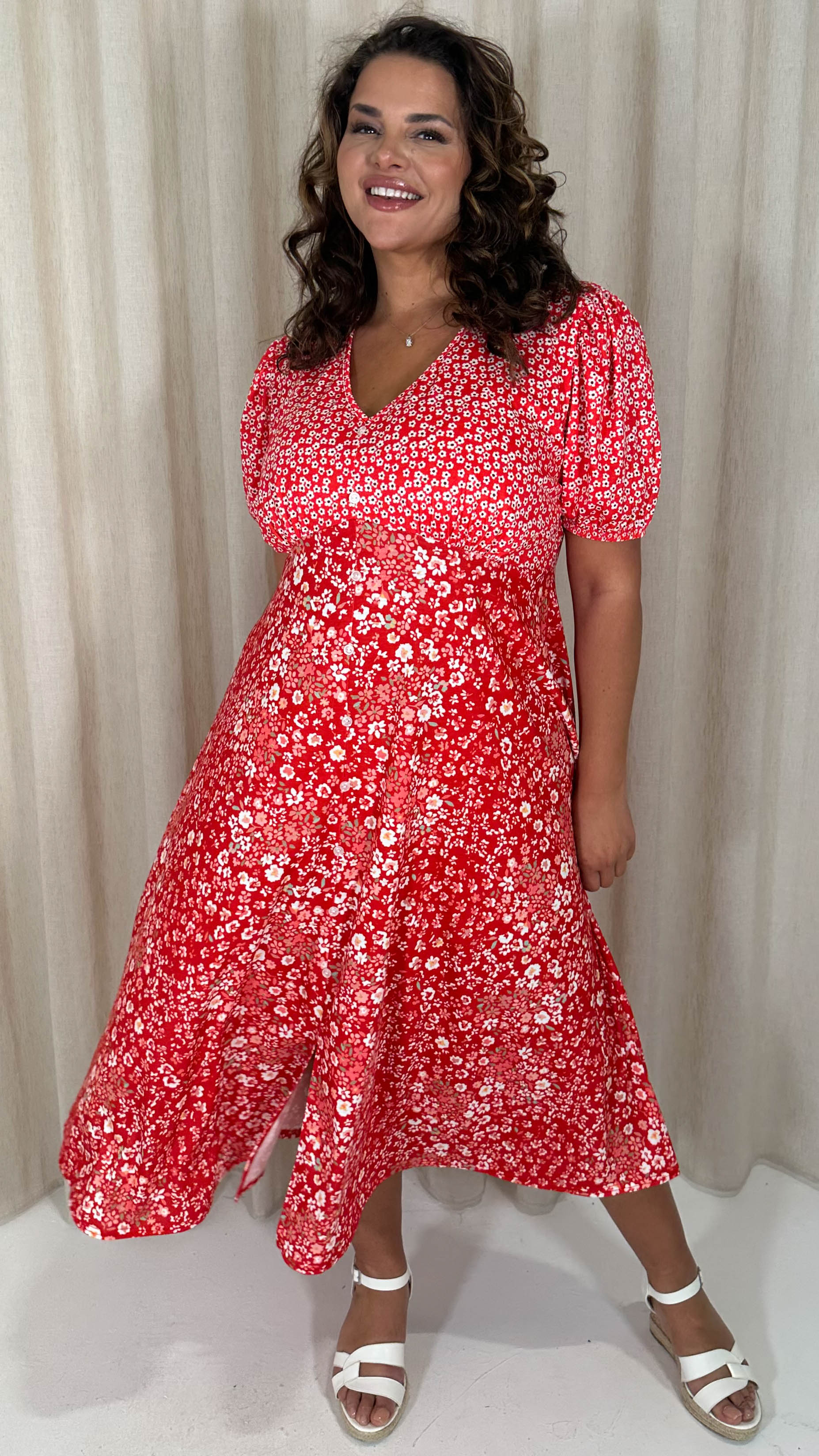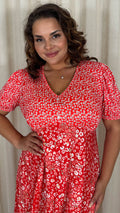 CurveWow Front Button Mix Match Print Midi Dress Red Mix