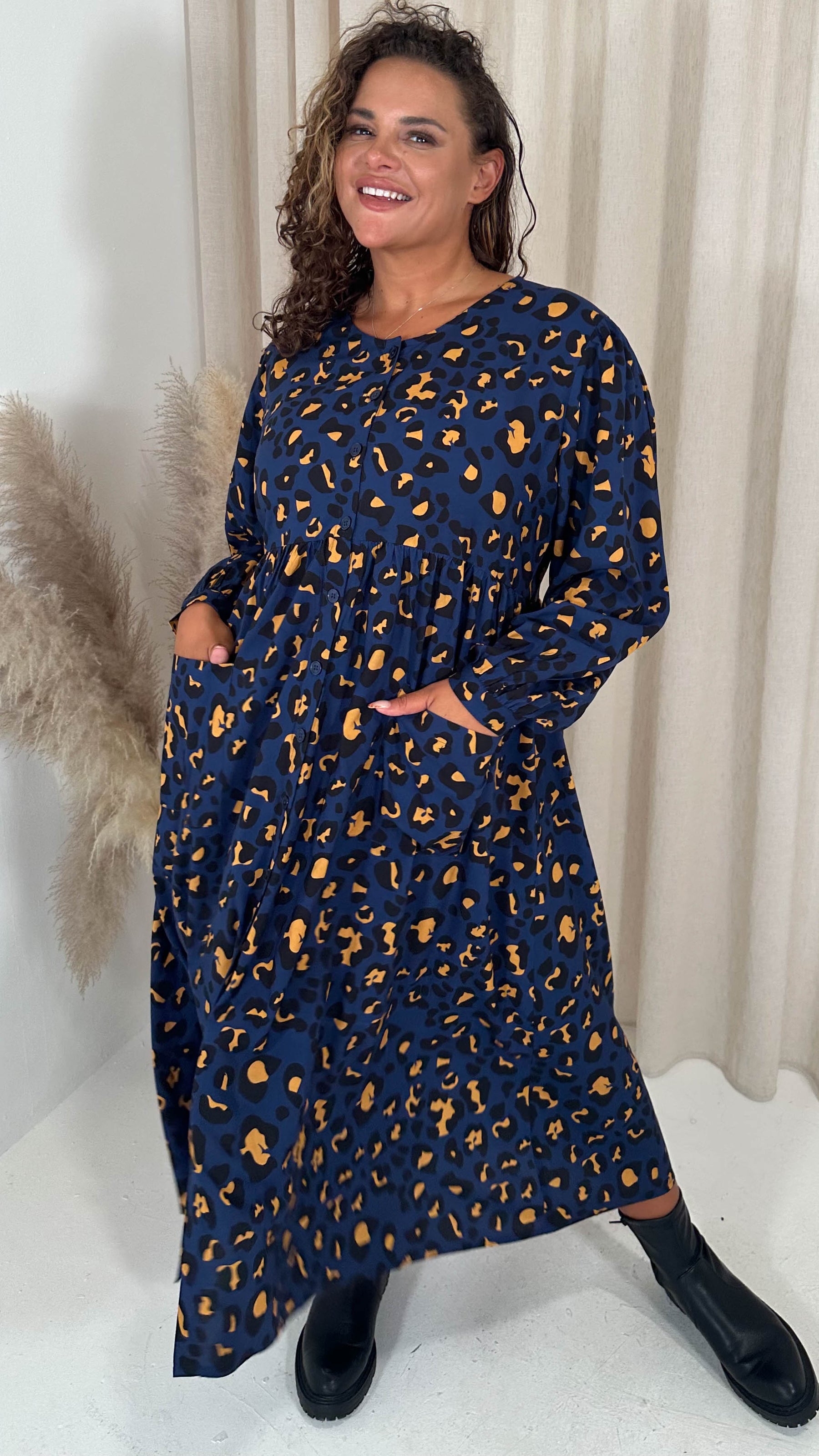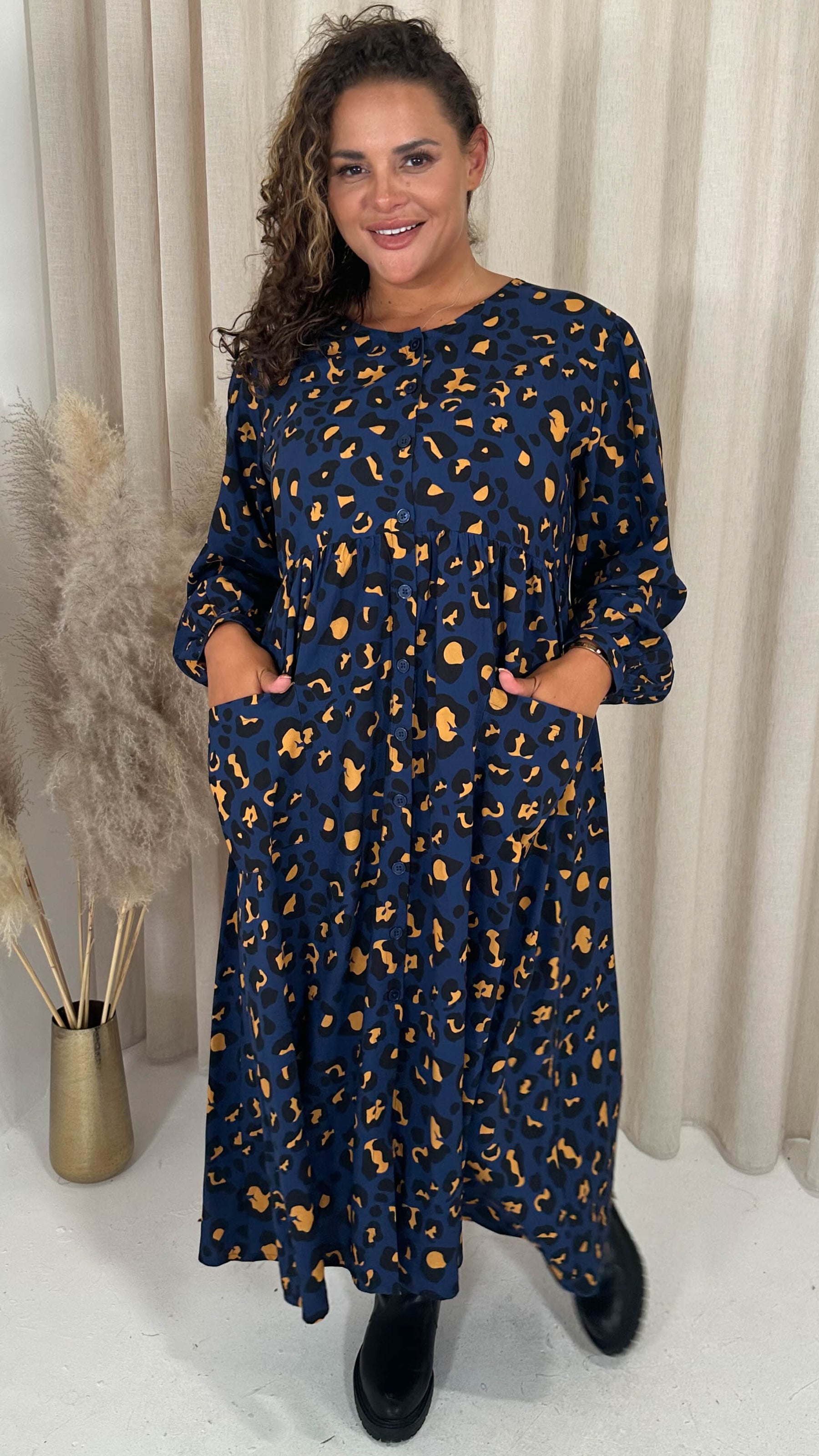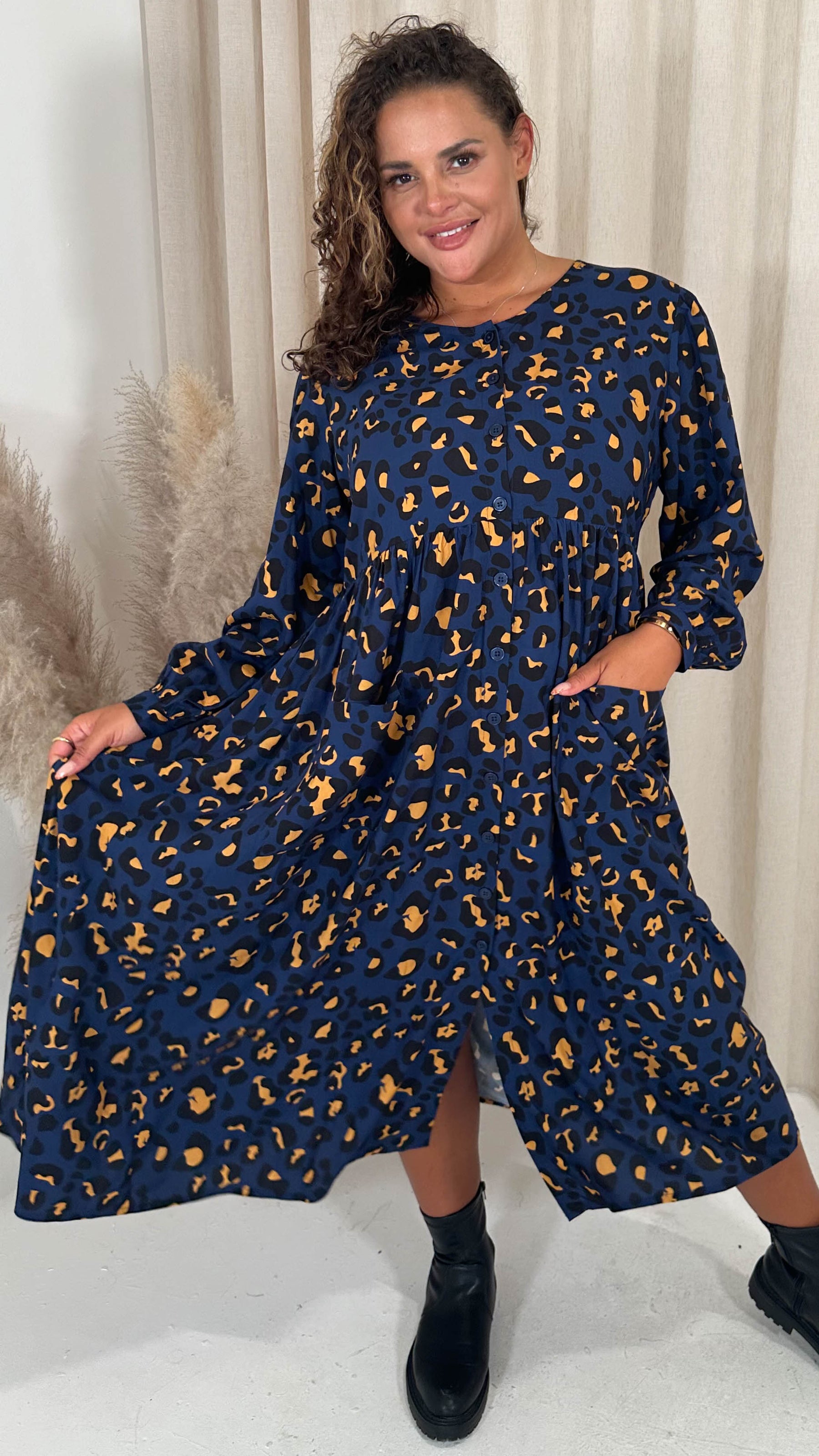CurveWow Button Front Pocket Midi Dress Blue Animal