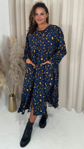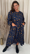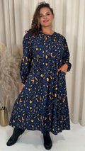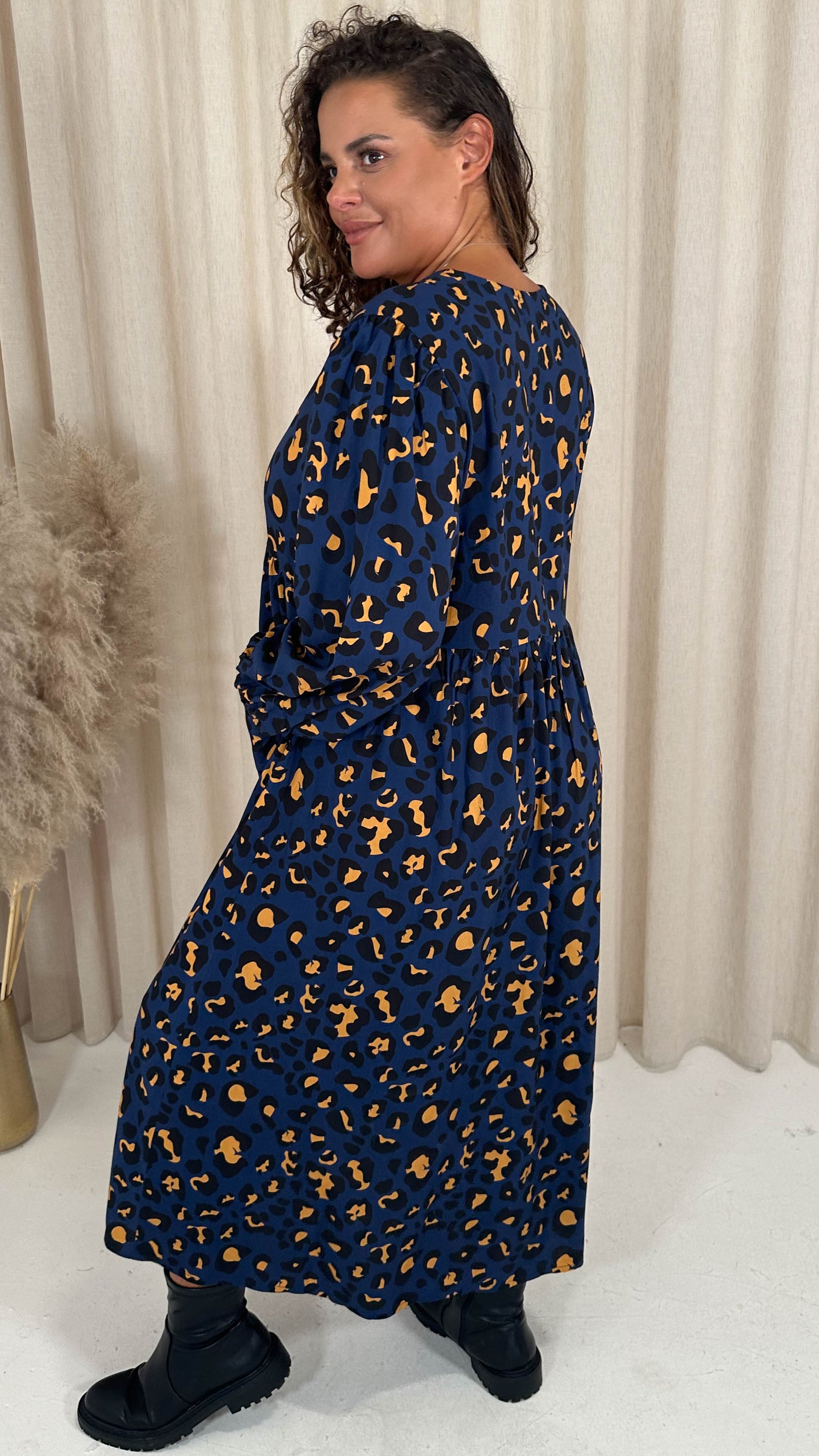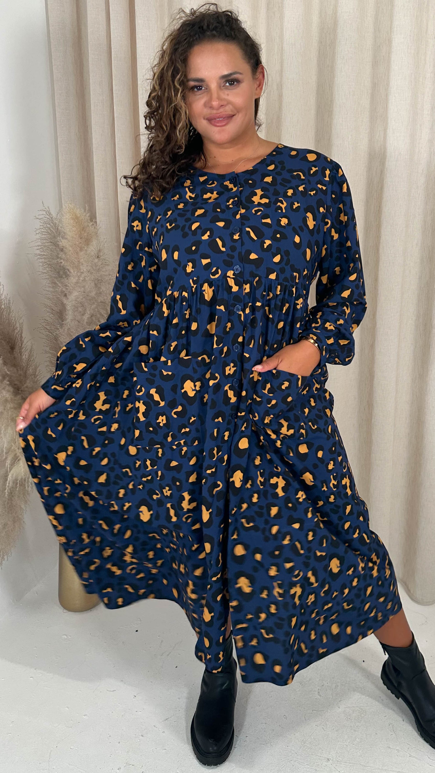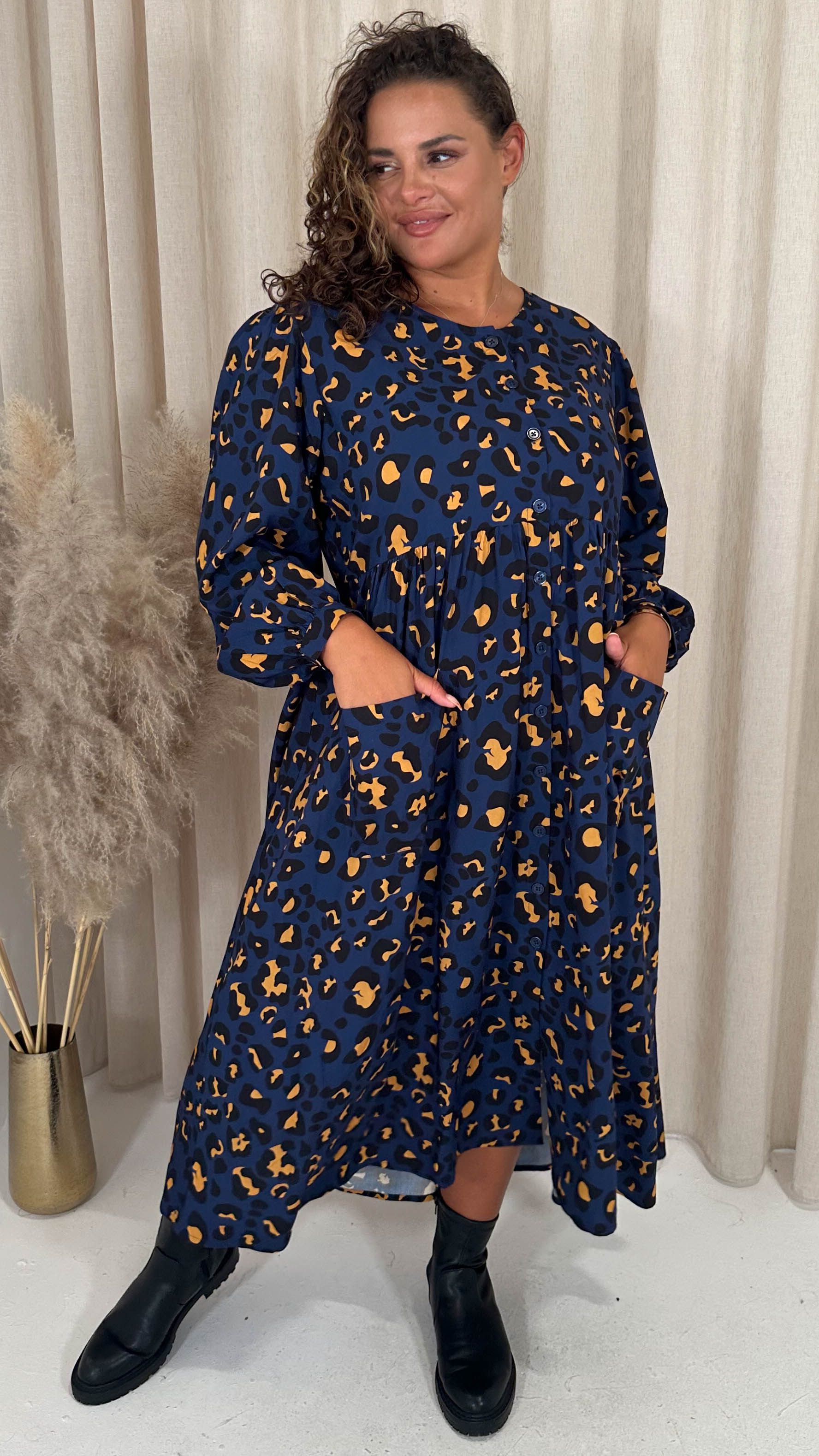 CurveWow Button Front Pocket Midi Dress Blue Animal