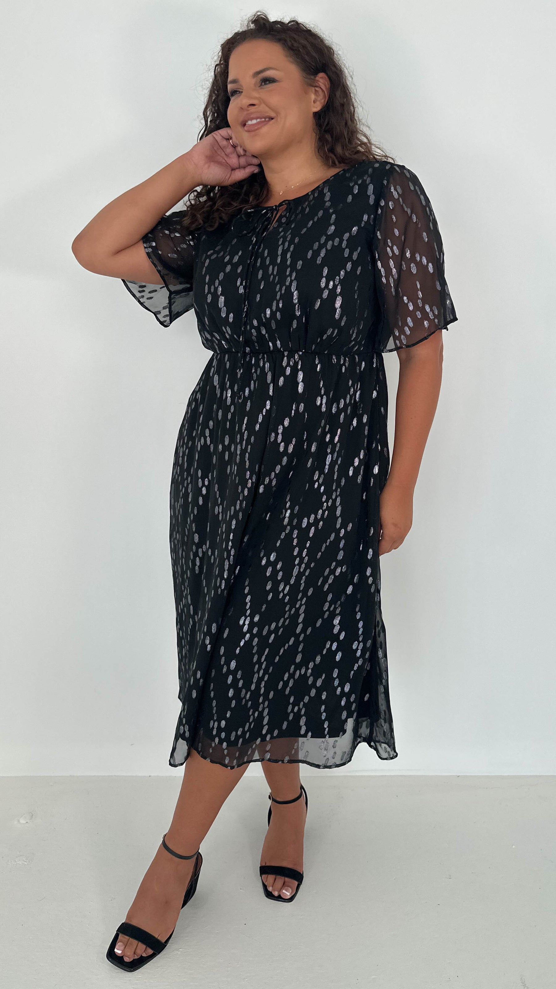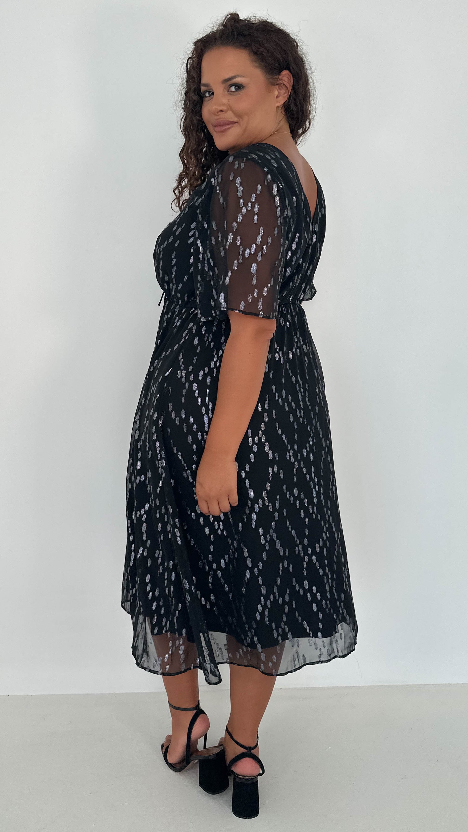 CurveWow Foil Tie Front Midi Dress Black Silver
