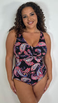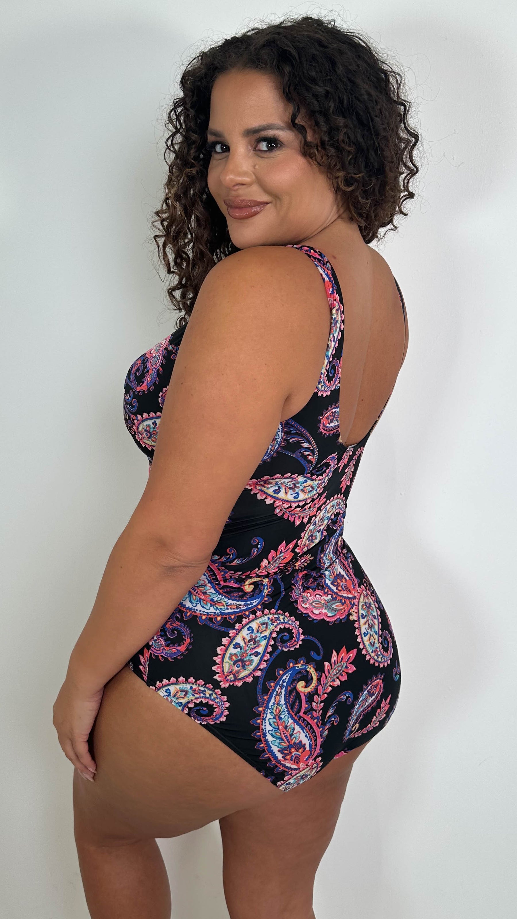 CurveWow Twist Front Textured Swimsuit Black Paisley