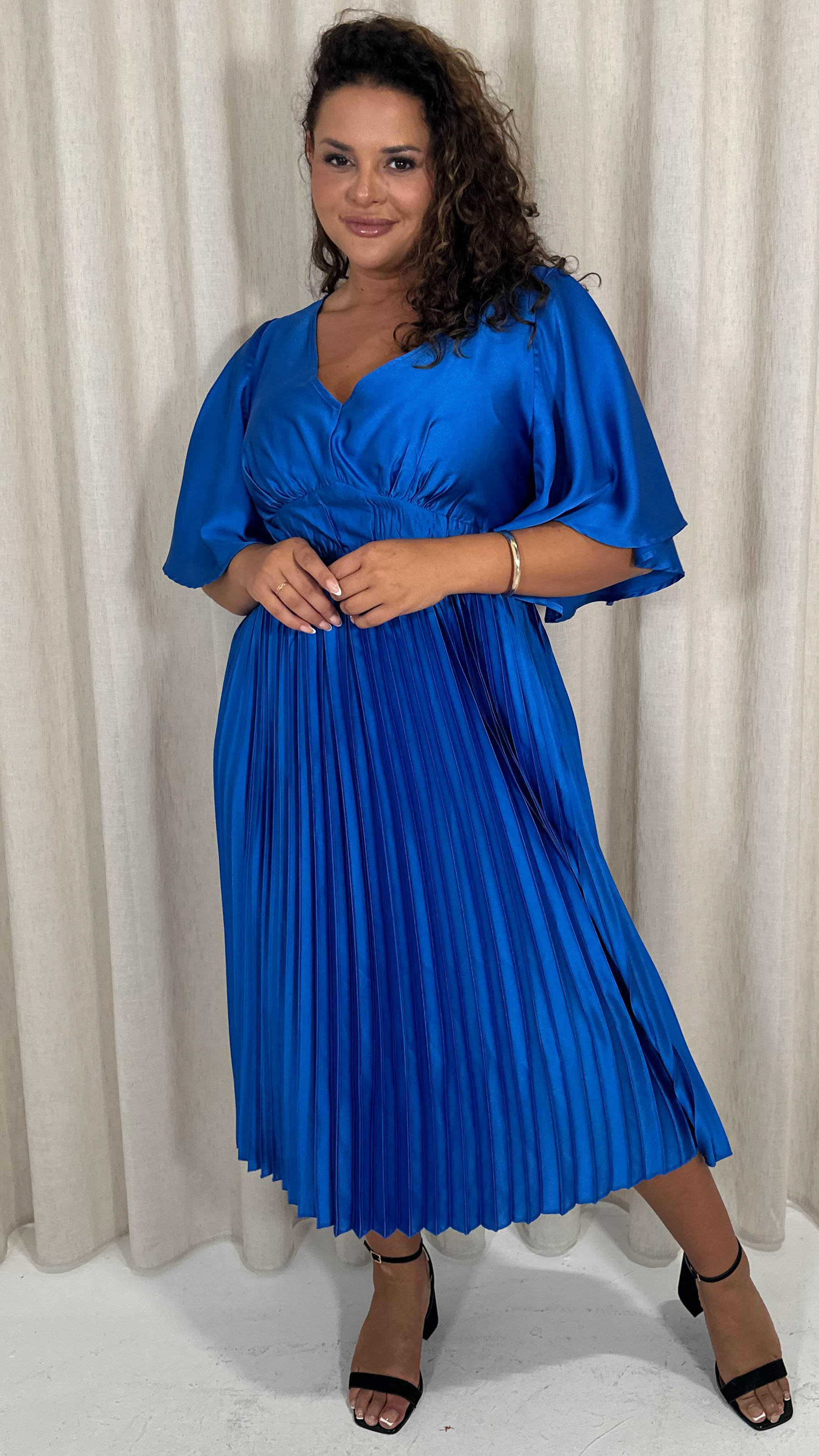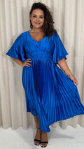 CurveWow 3/4 Sleeve Satin V Neck Pleated Midi Dress Blue