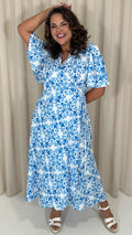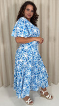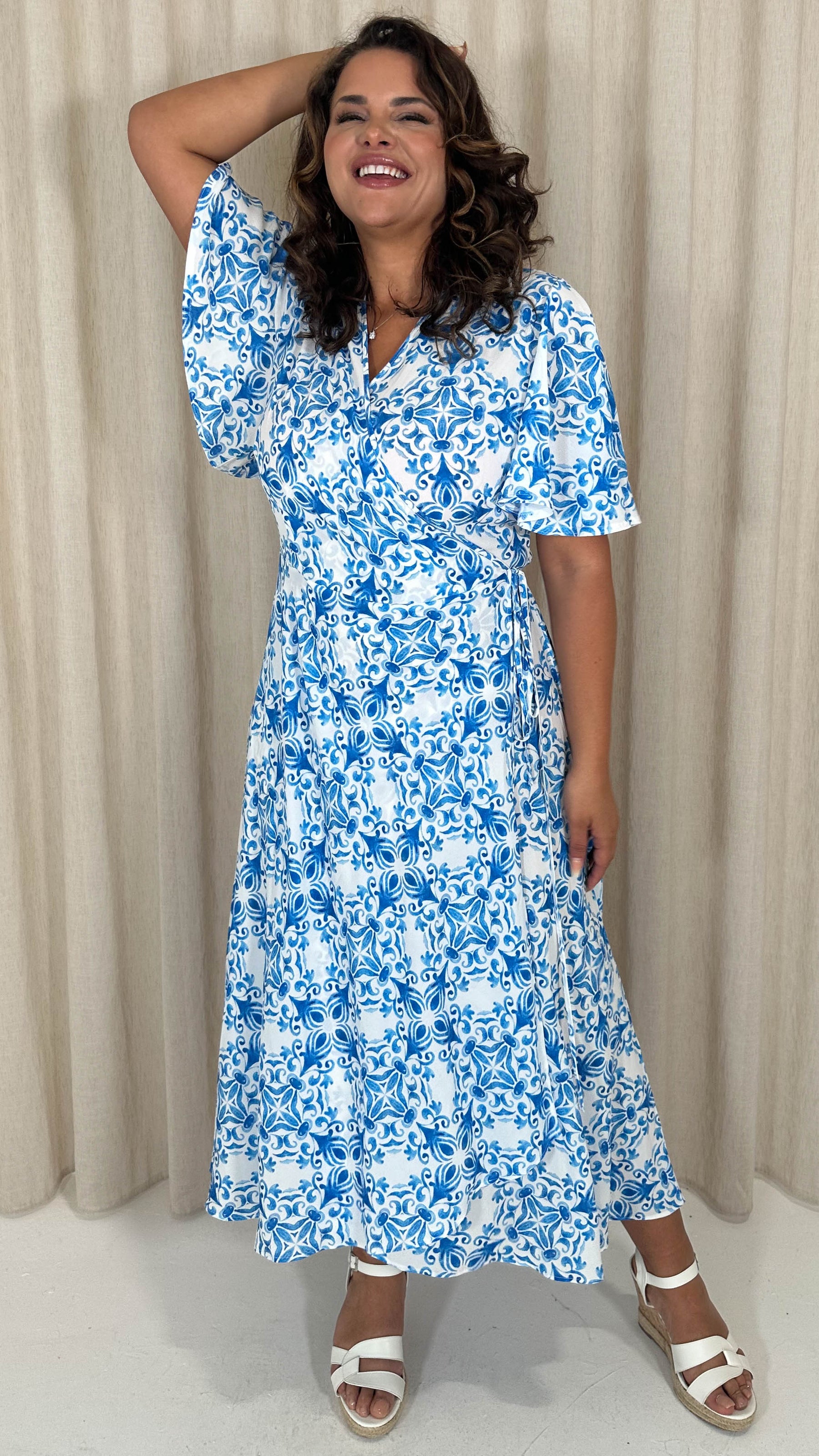 CurveWow Angel Sleeve Wrap Dress Blue Print