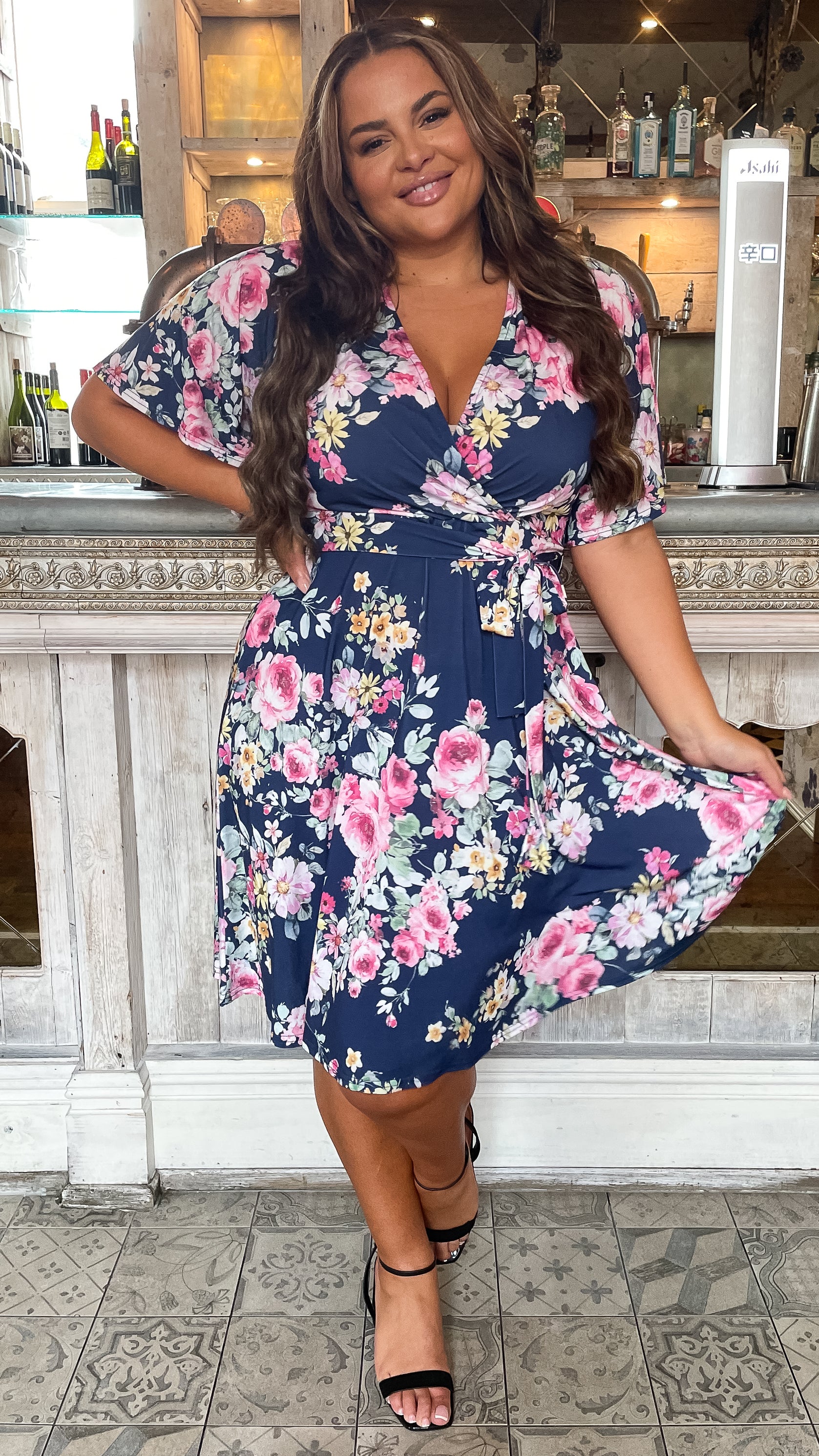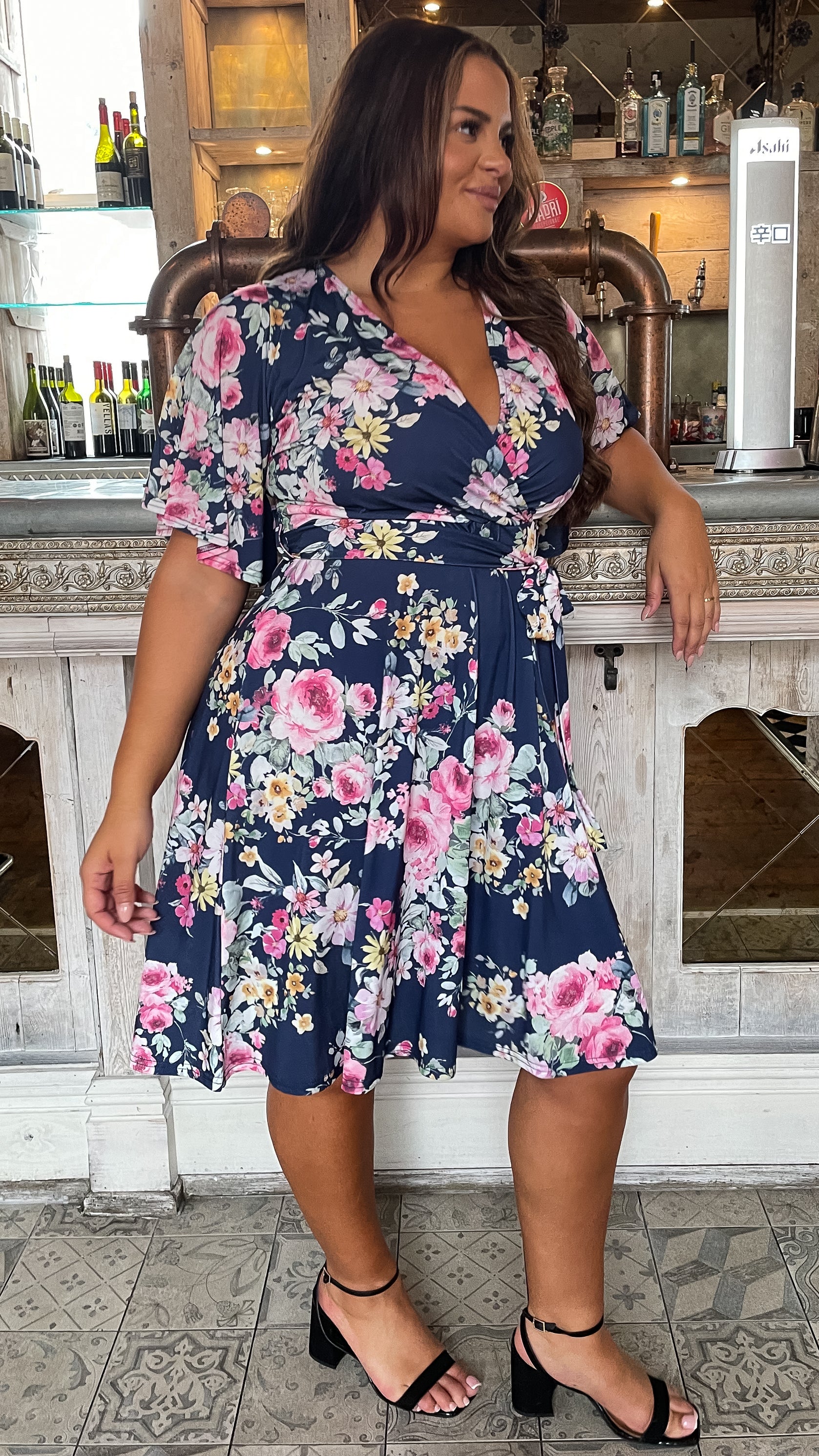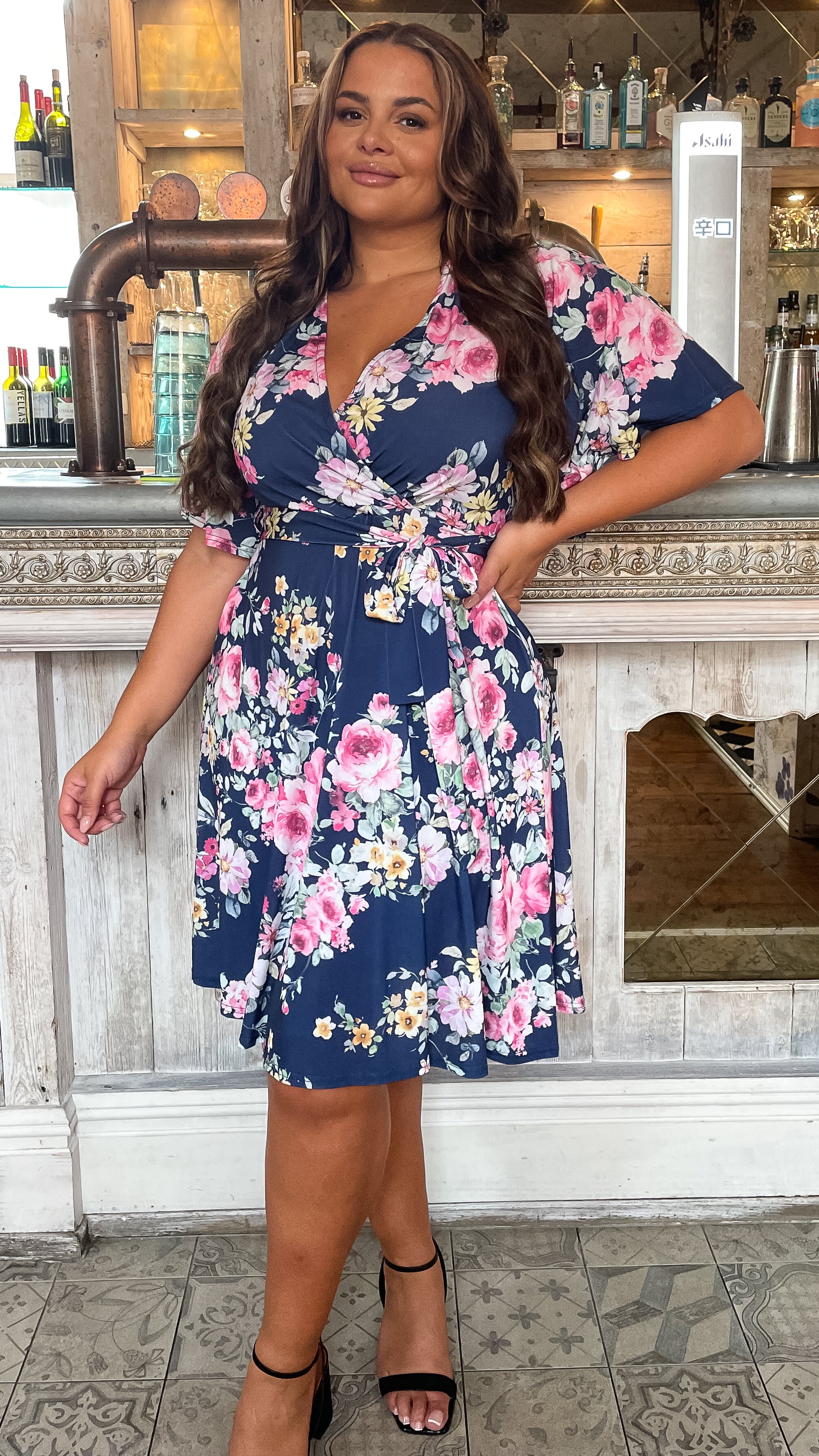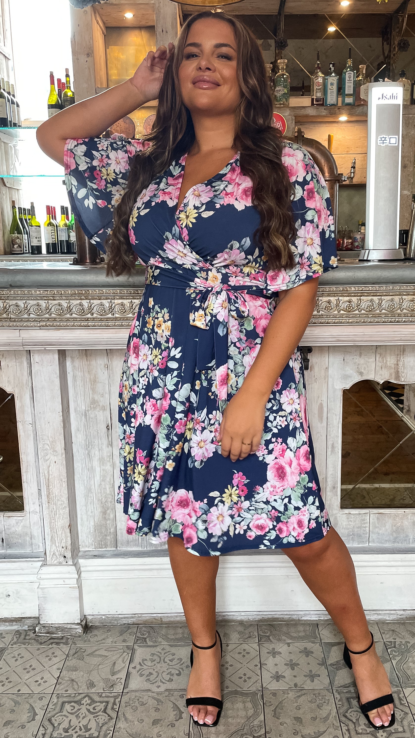 CurveWow Angel Sleeve Wrap Midi Dress Navy Floral
