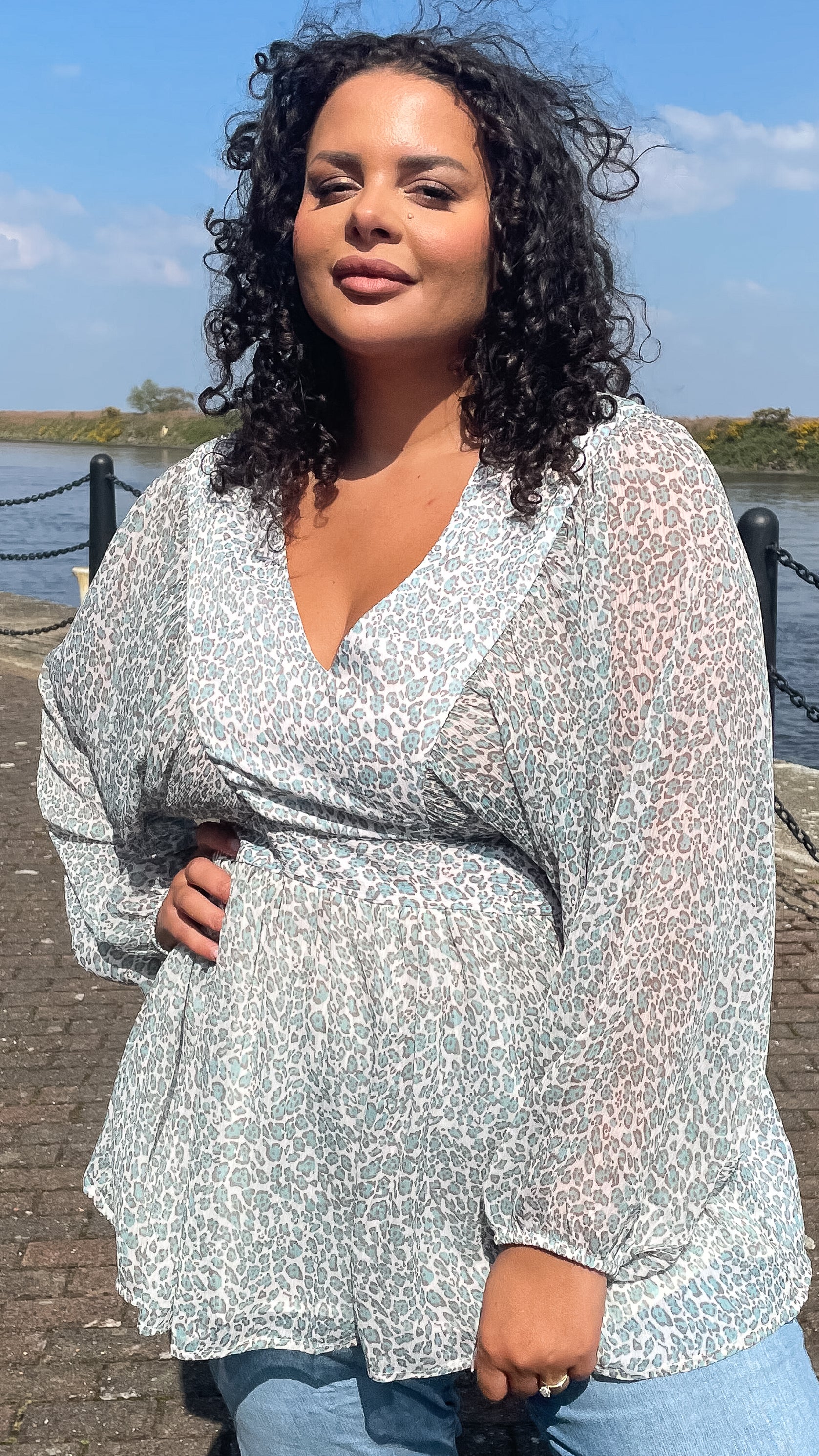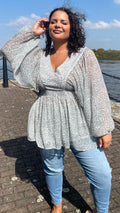 CurveWow Balloon Sleeve Blouse Green Leopard