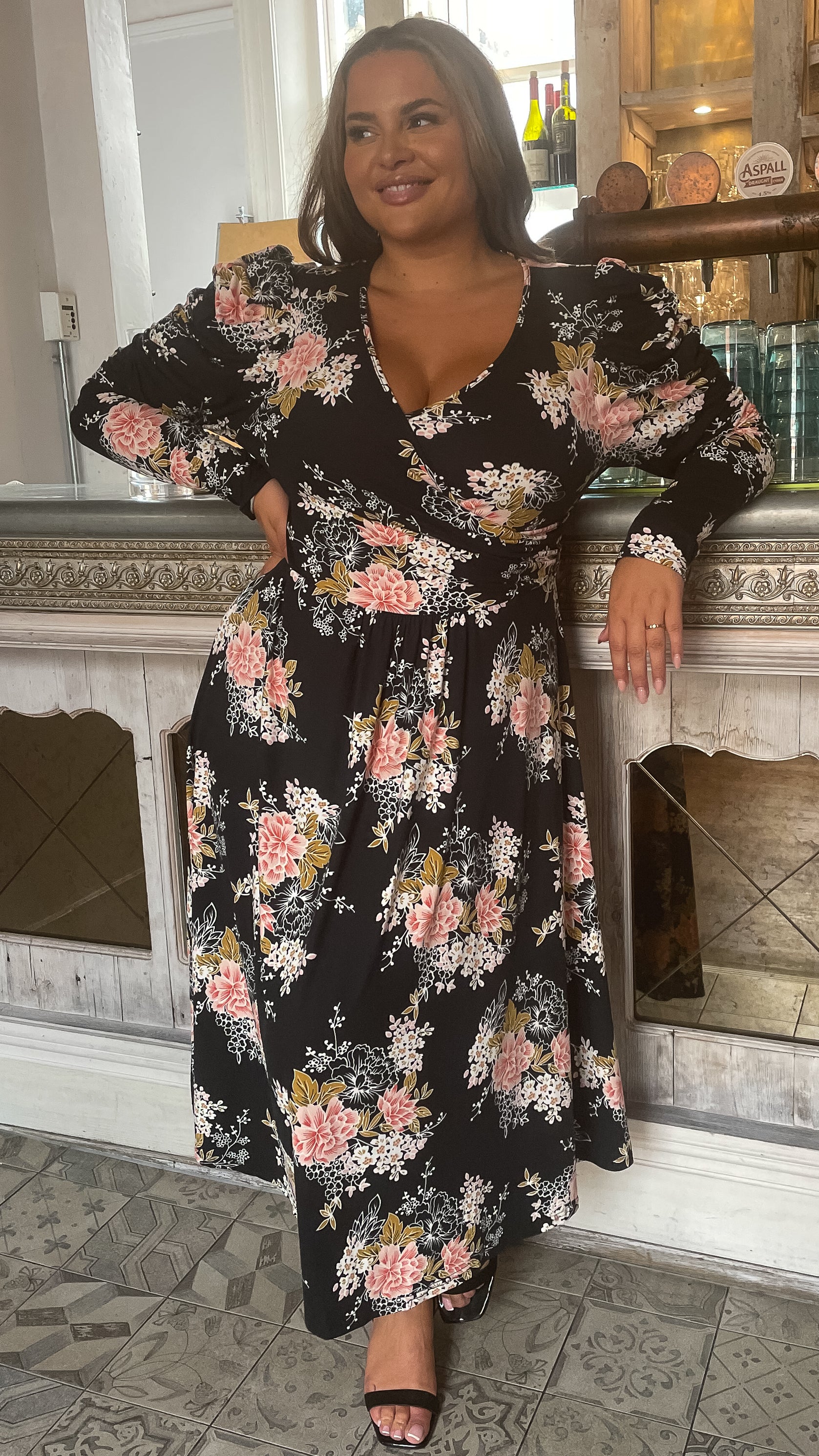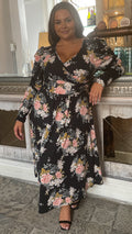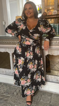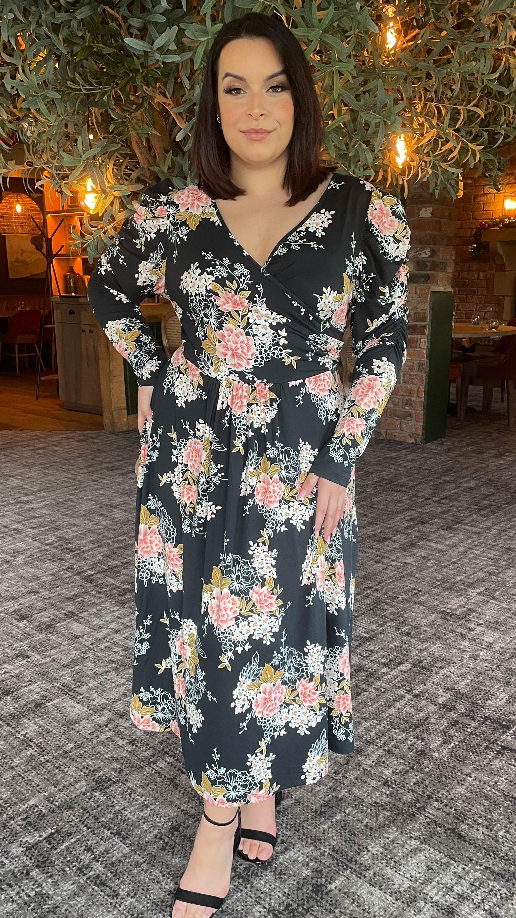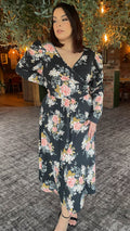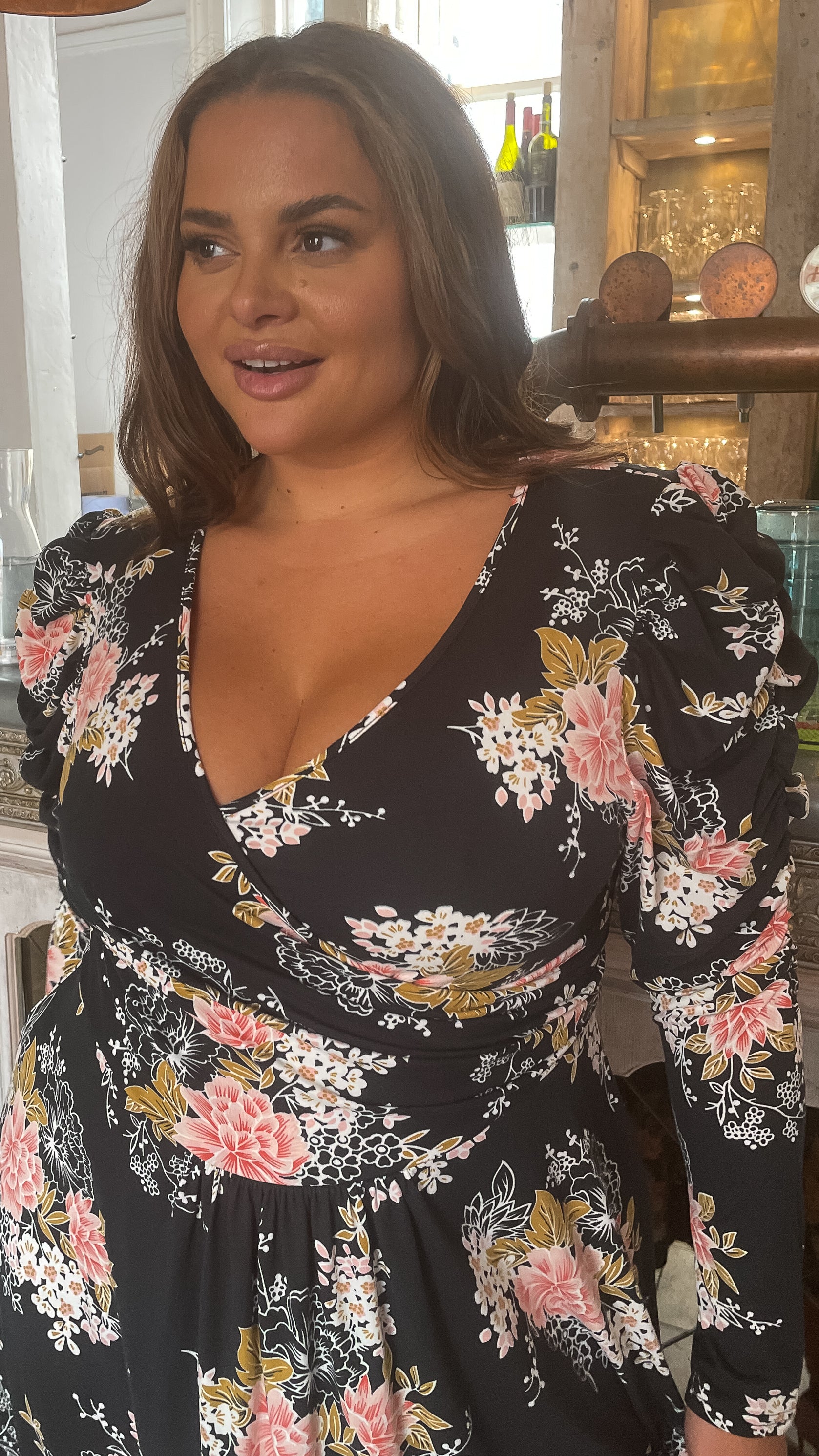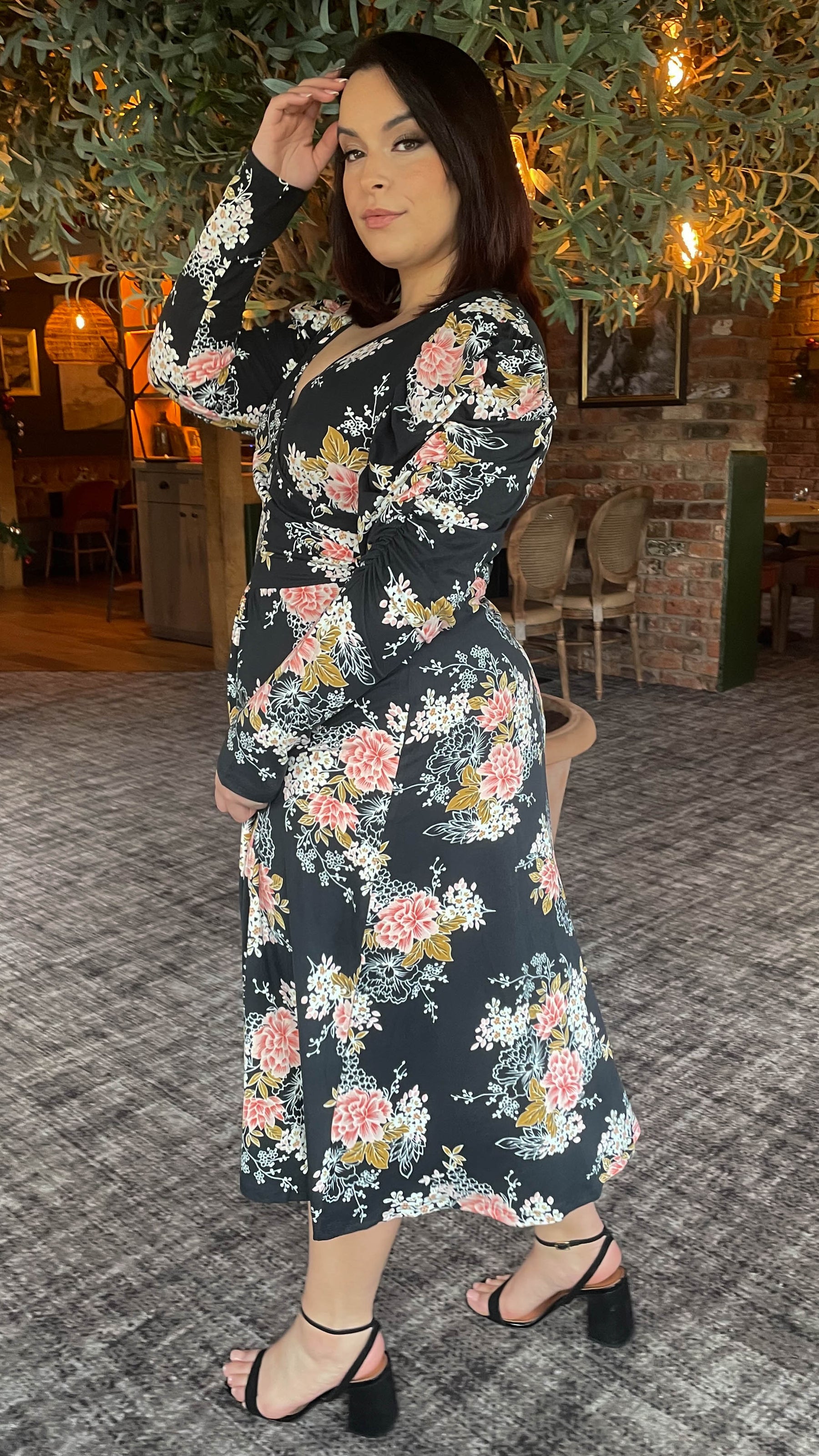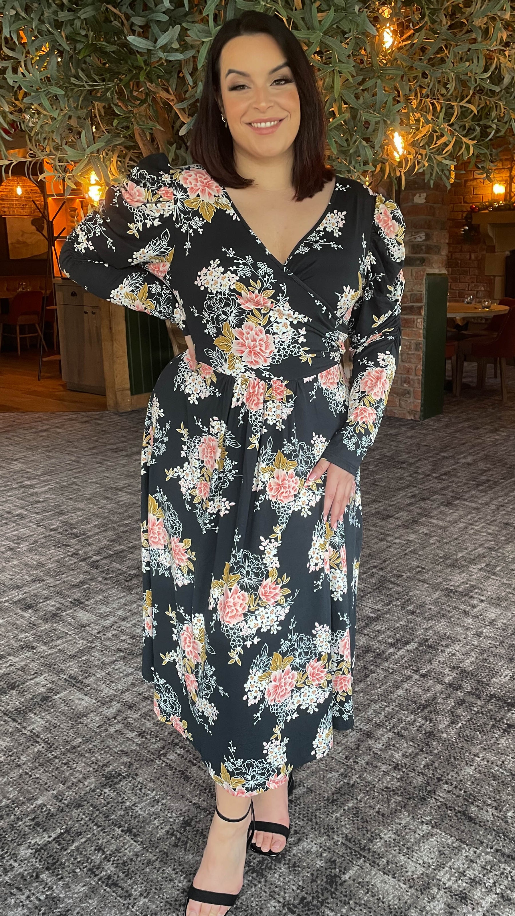 CurveWow Balloon Sleeve Midi Dress Black Floral