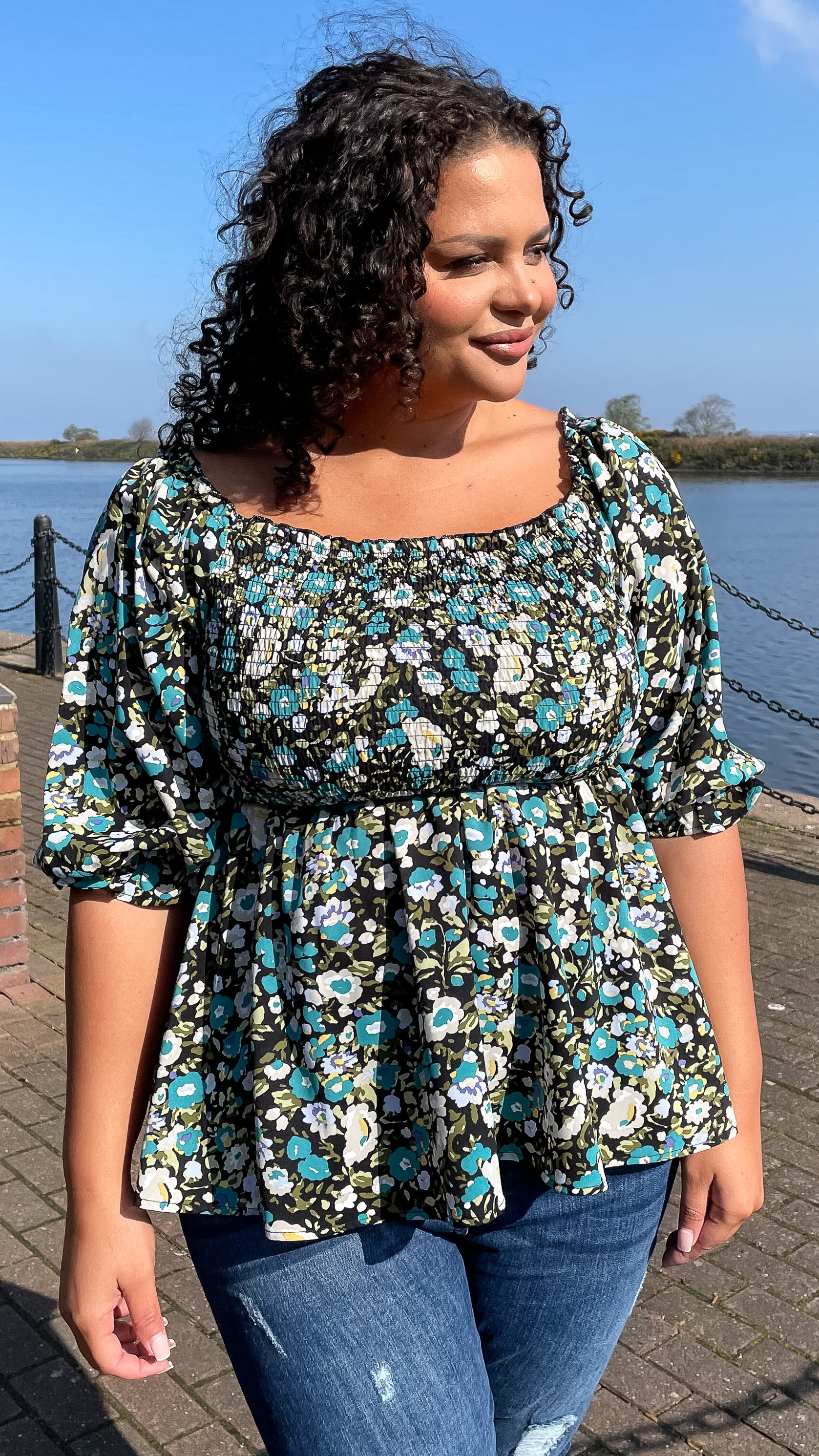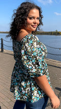 CurveWow Peplum Top Black Ground Floral