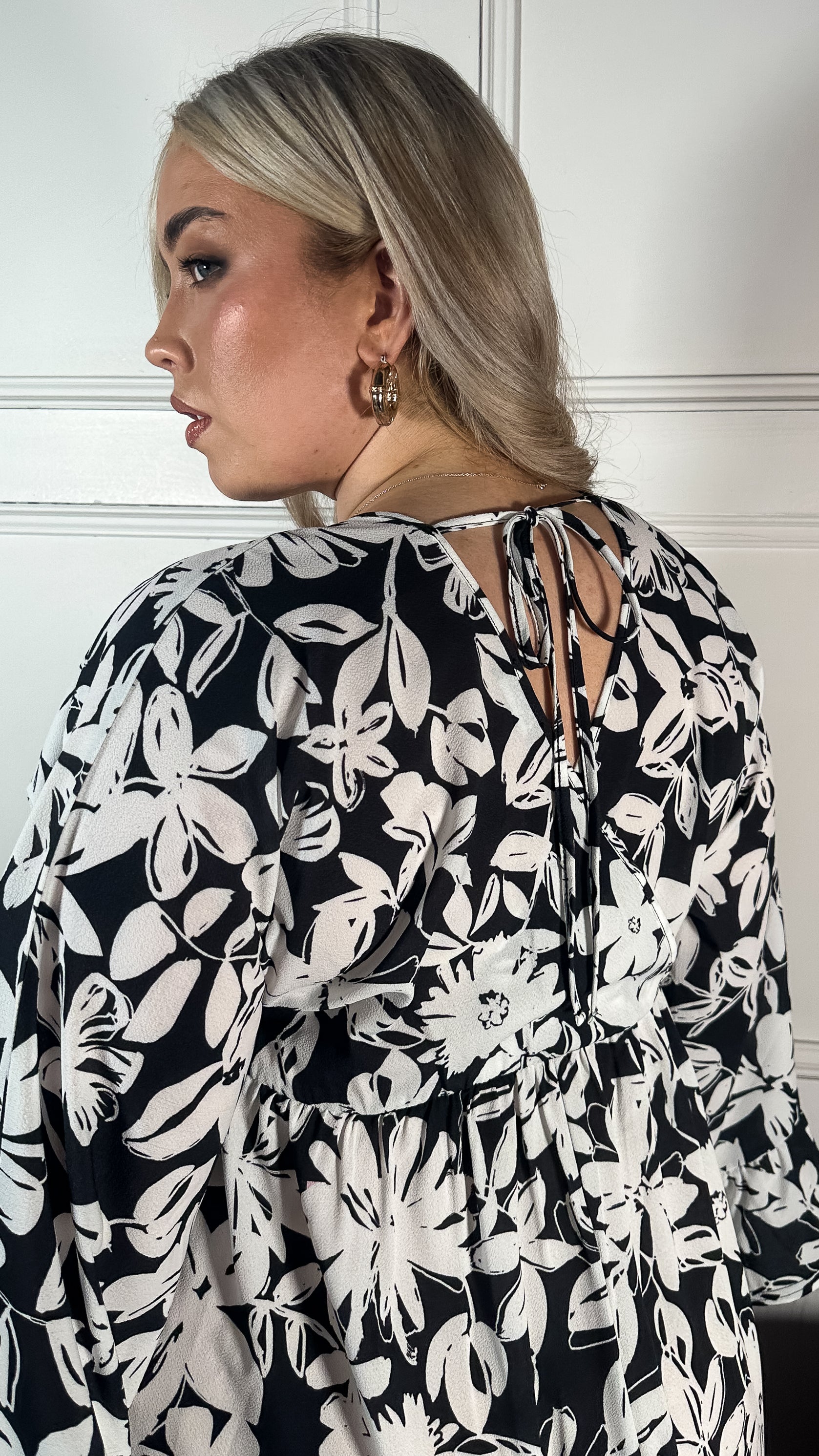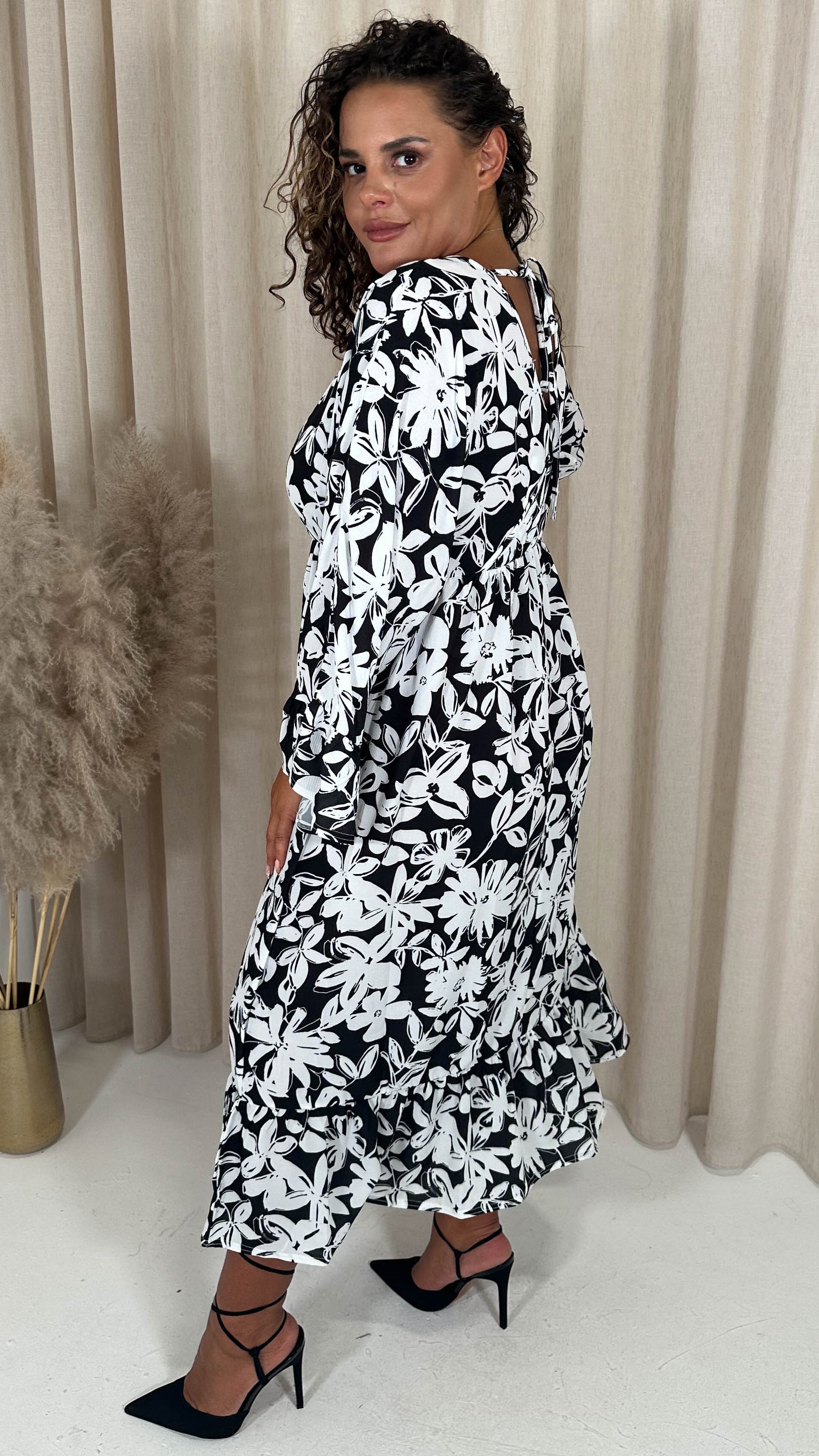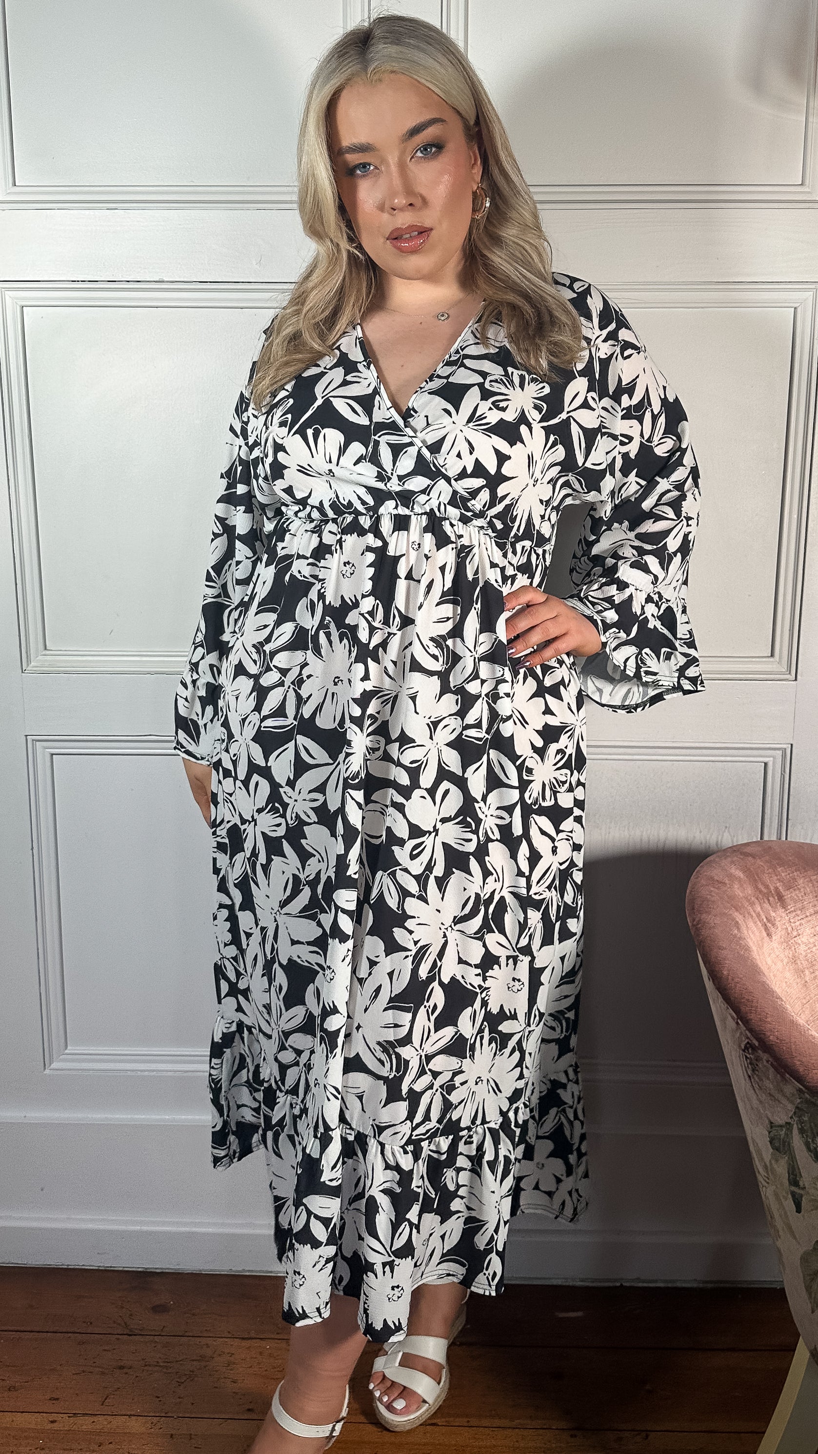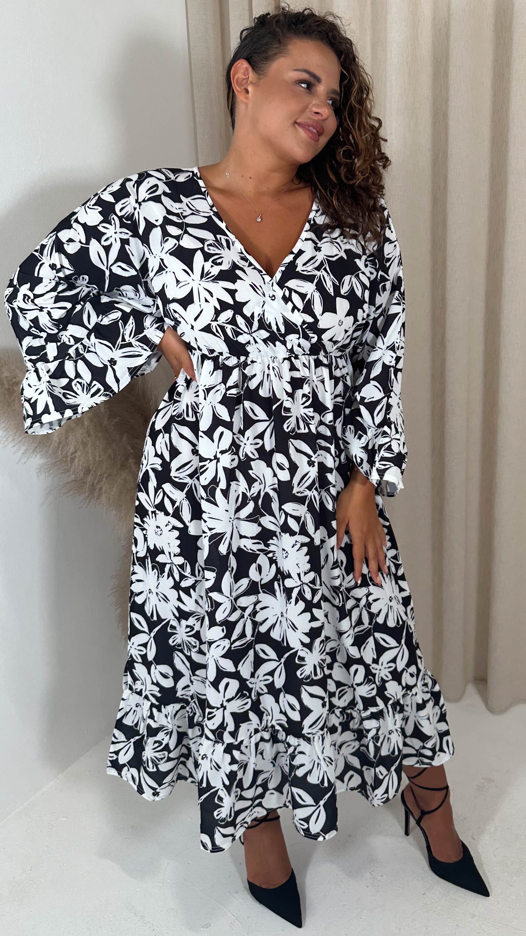 CurveWow Bell Sleeve Midi Dress Black Floral