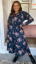 CurveWow Belted Shirt Dress Floral Navy