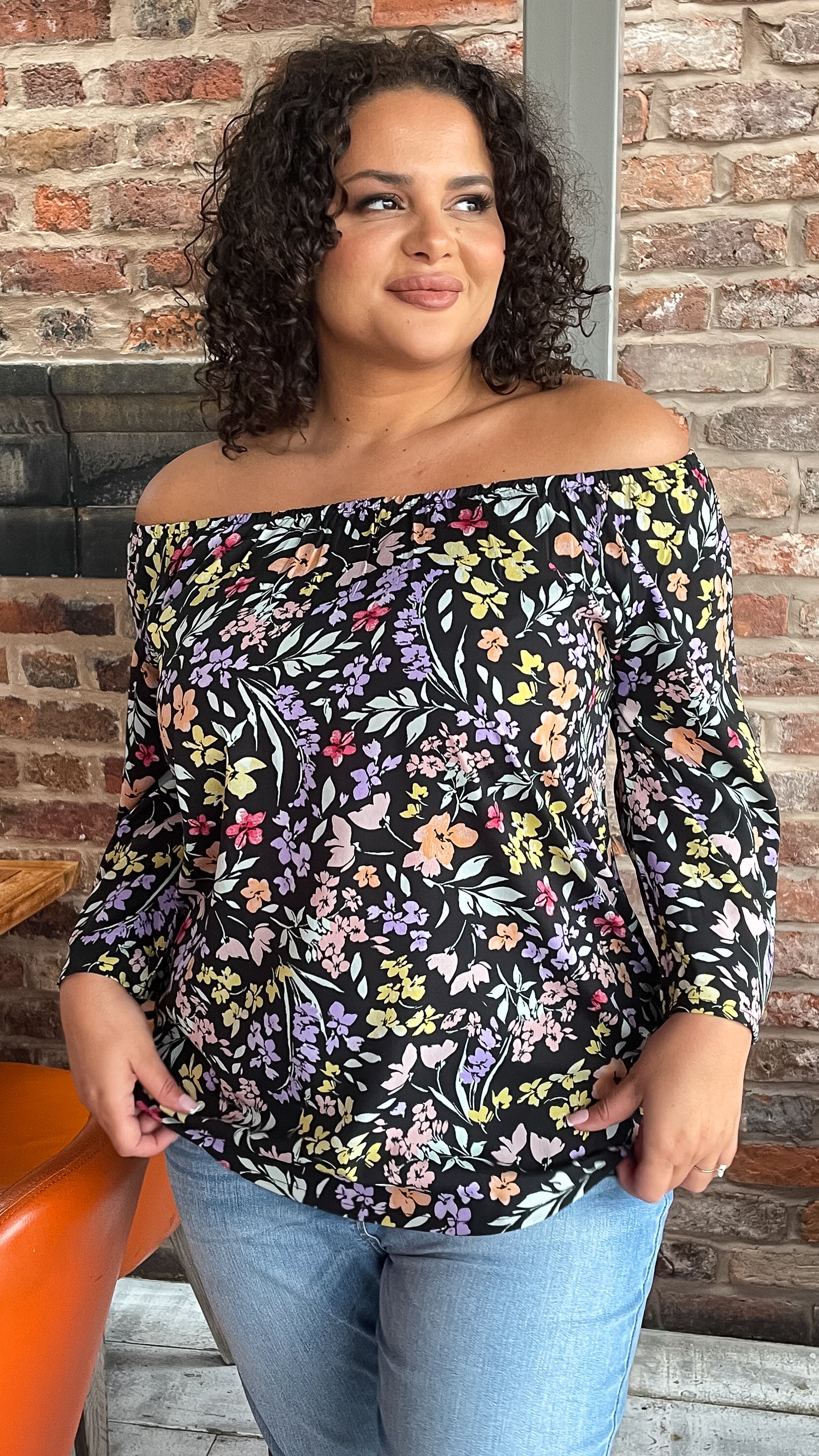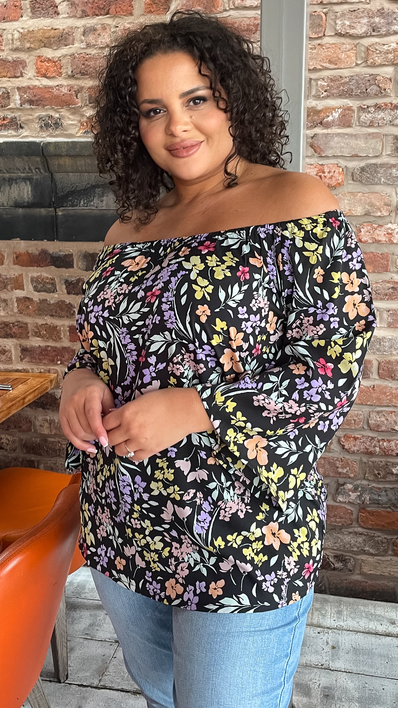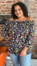 CurveWow Multi Floral Bardot Top Black