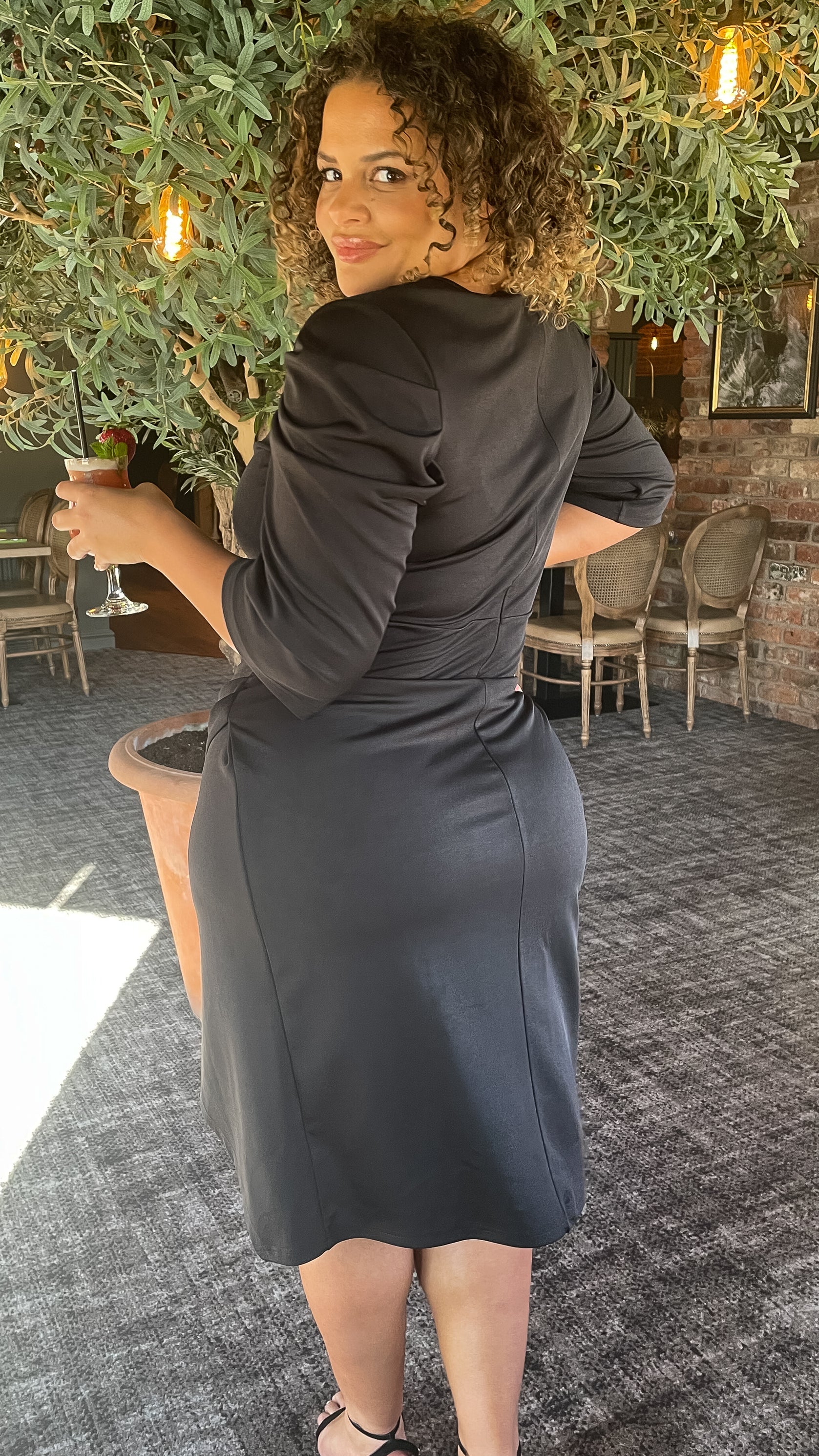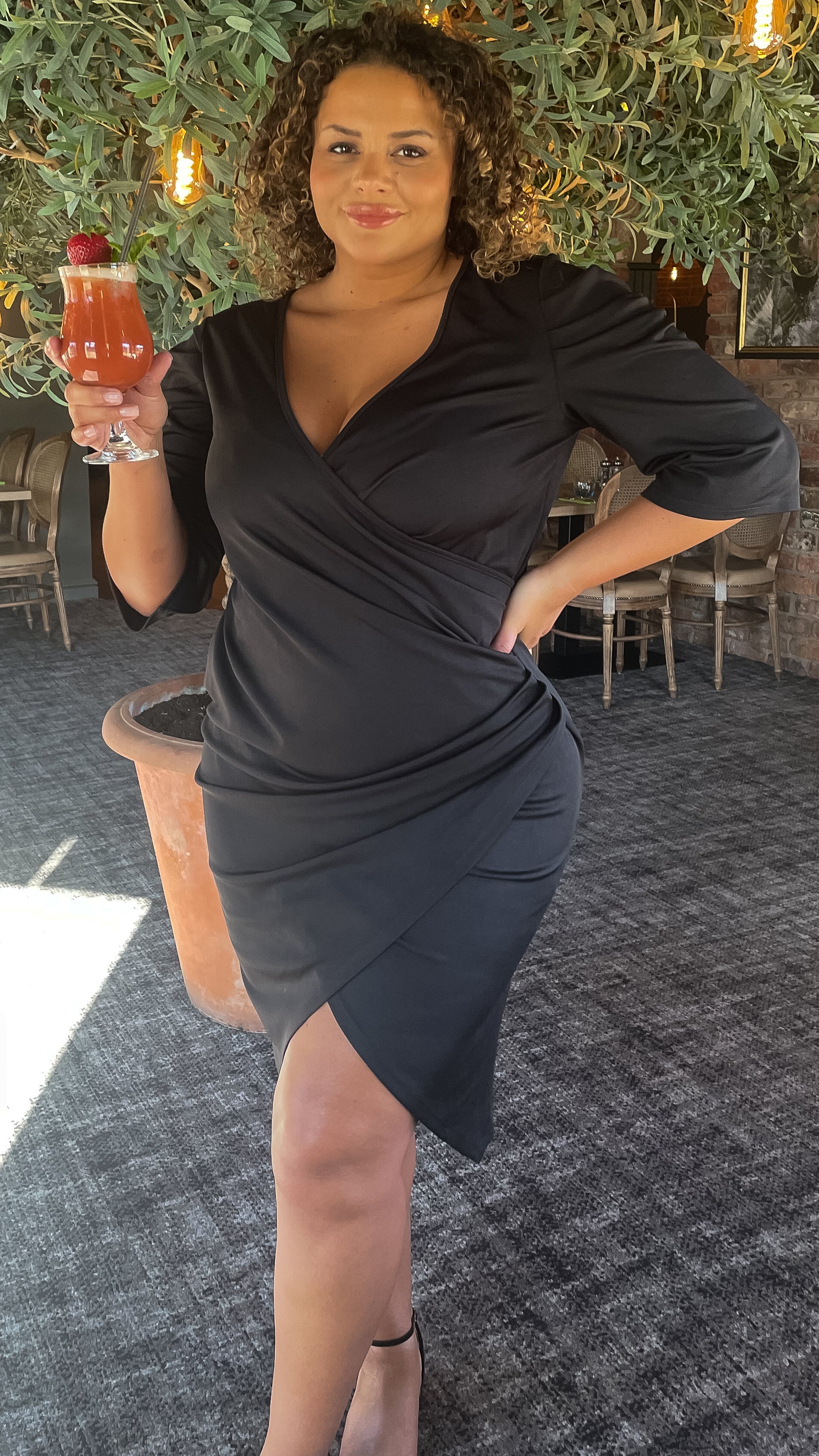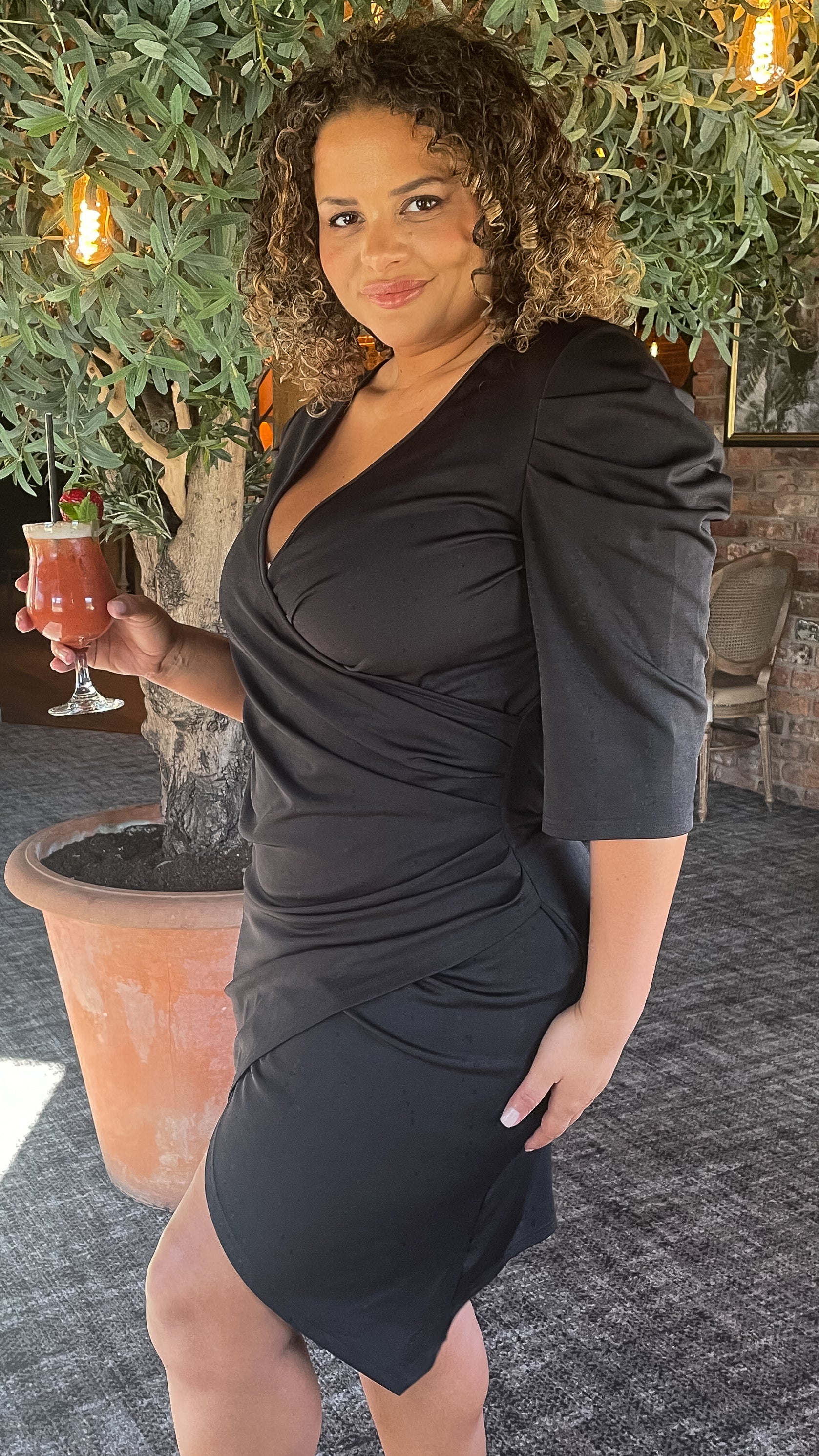 CurveWow Black Puff Sleeve Wrap Midi Dress