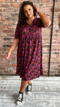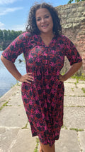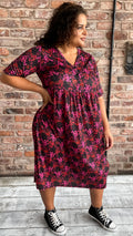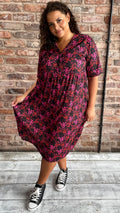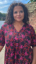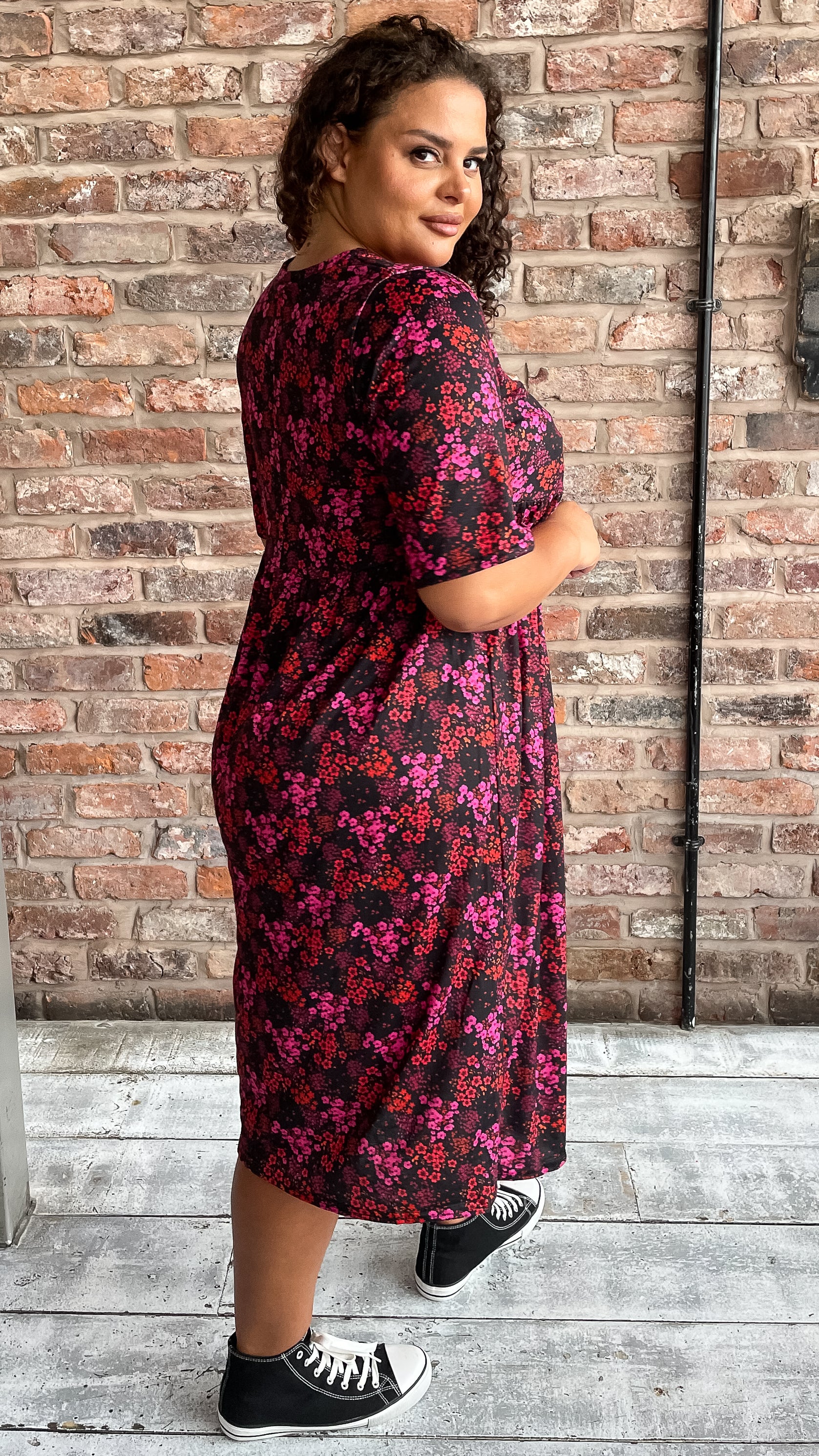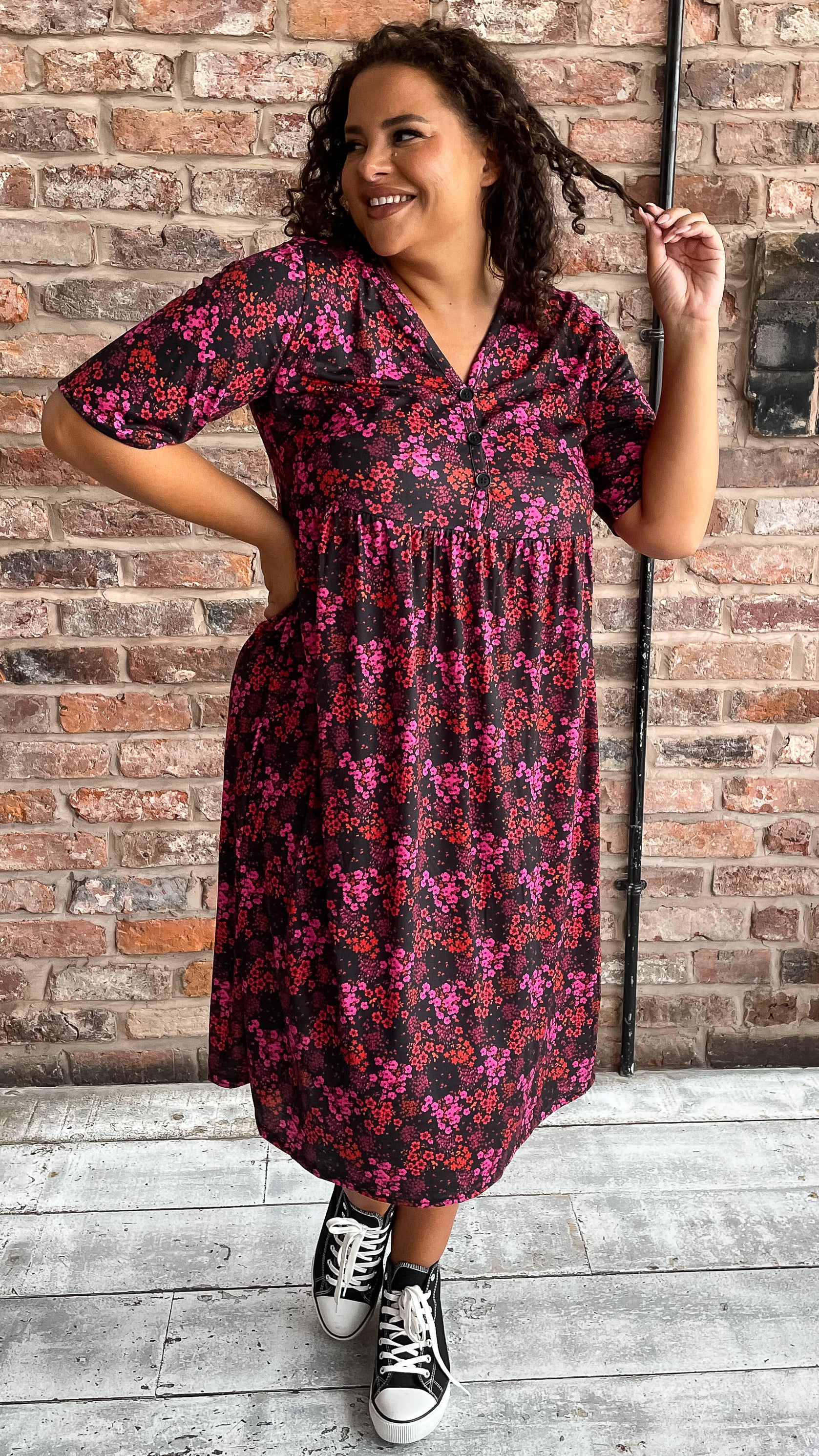 CurveWow Button Detail Midi Dress Black Pink Floral
