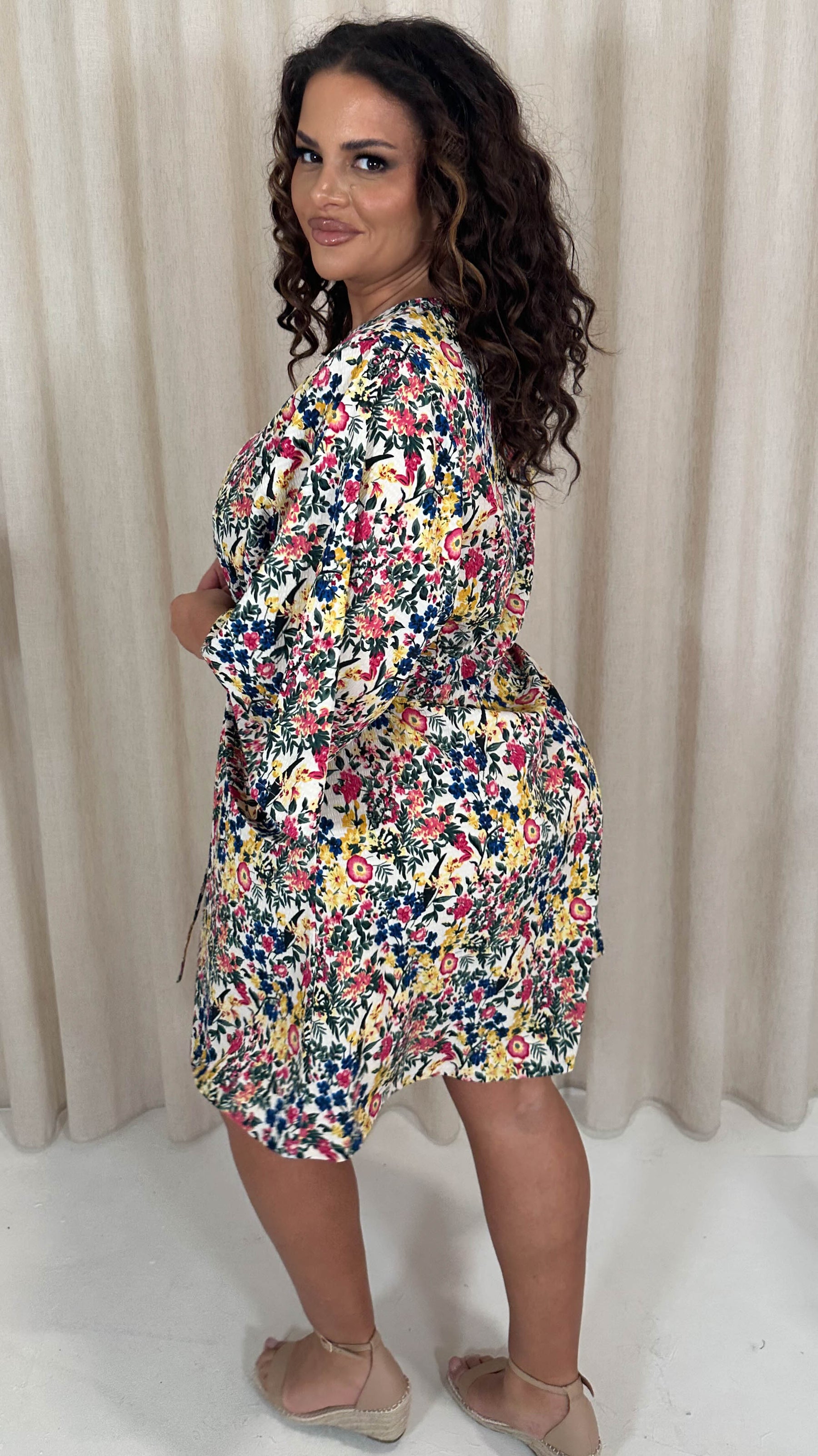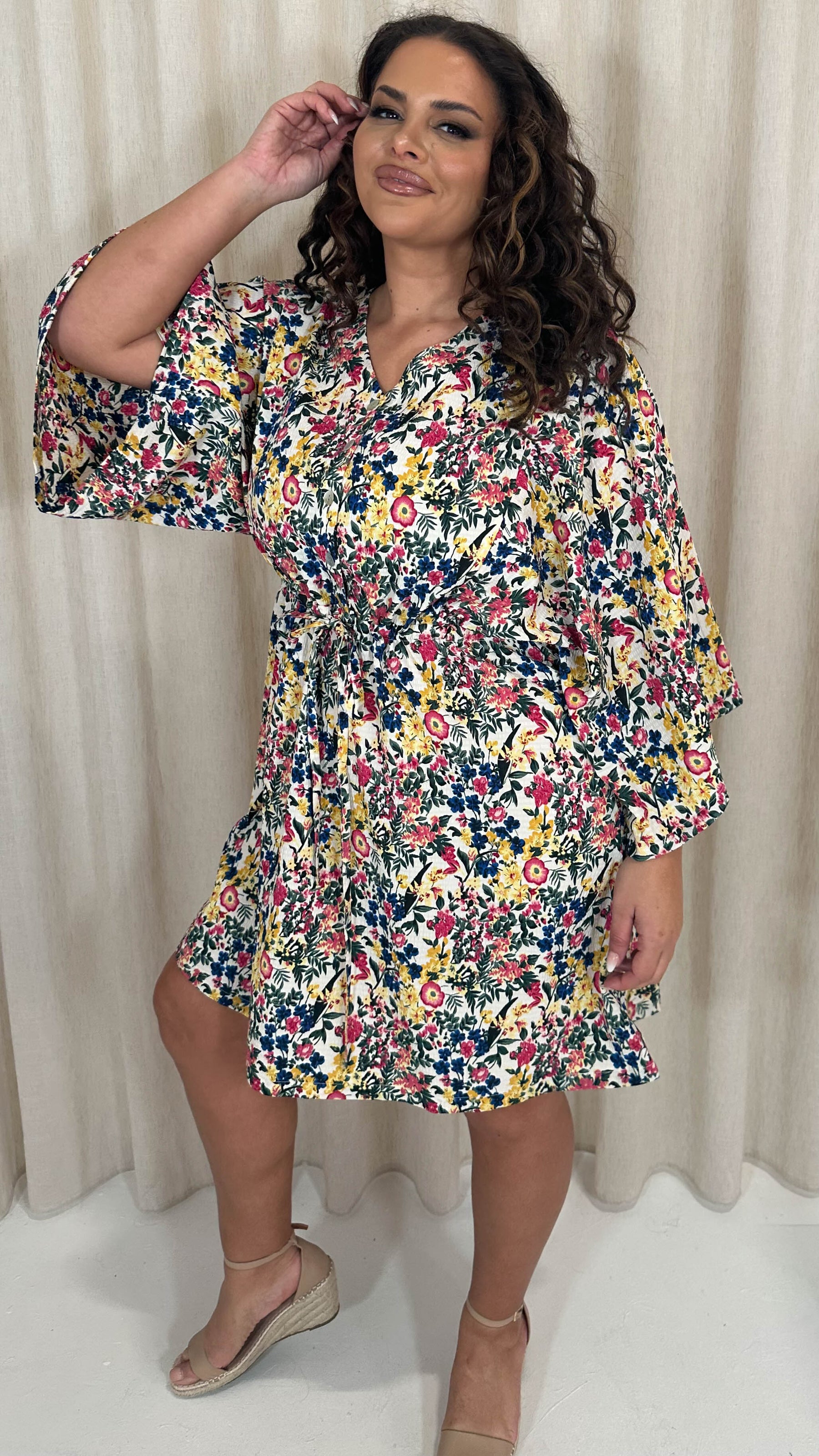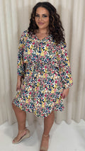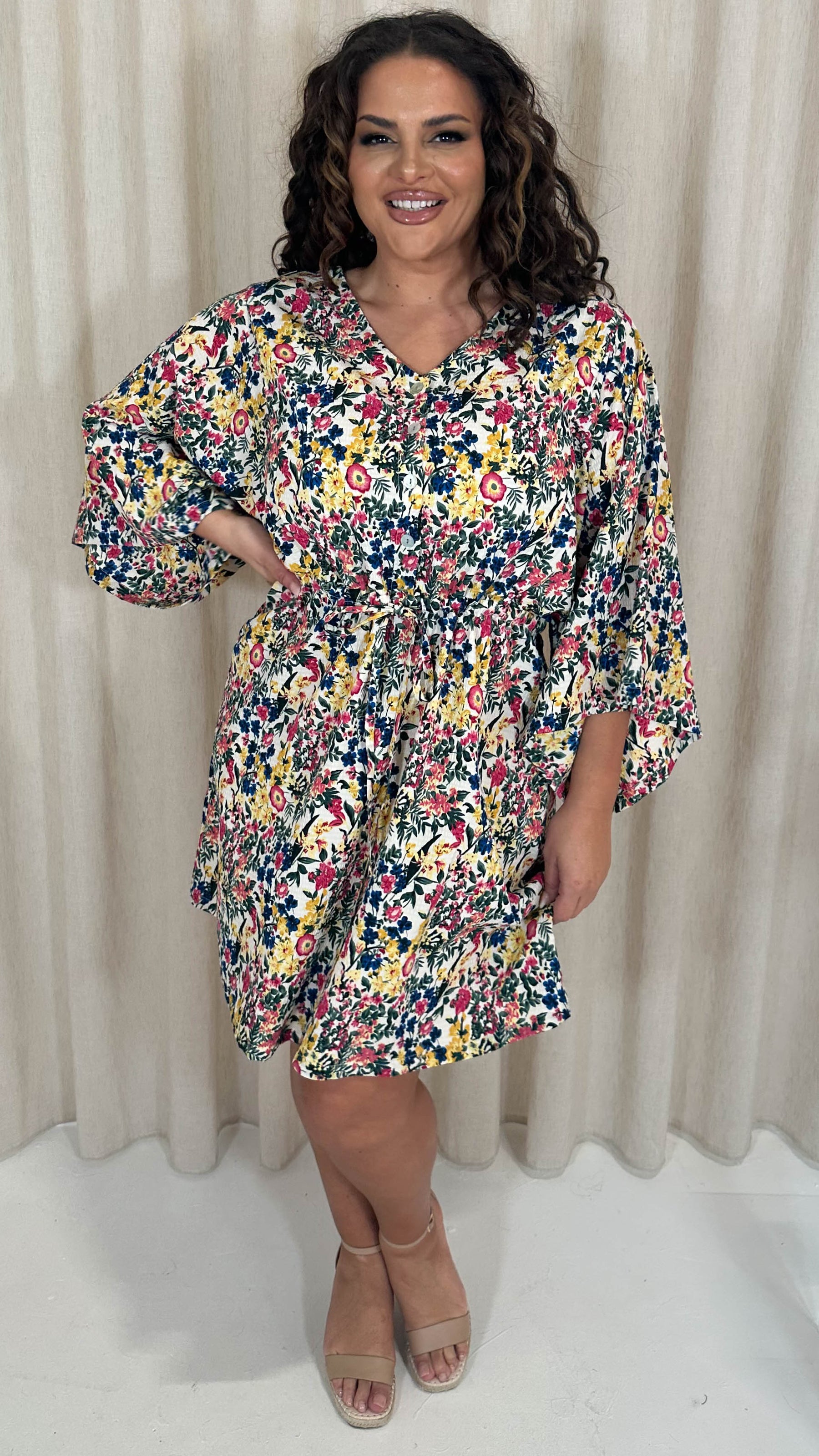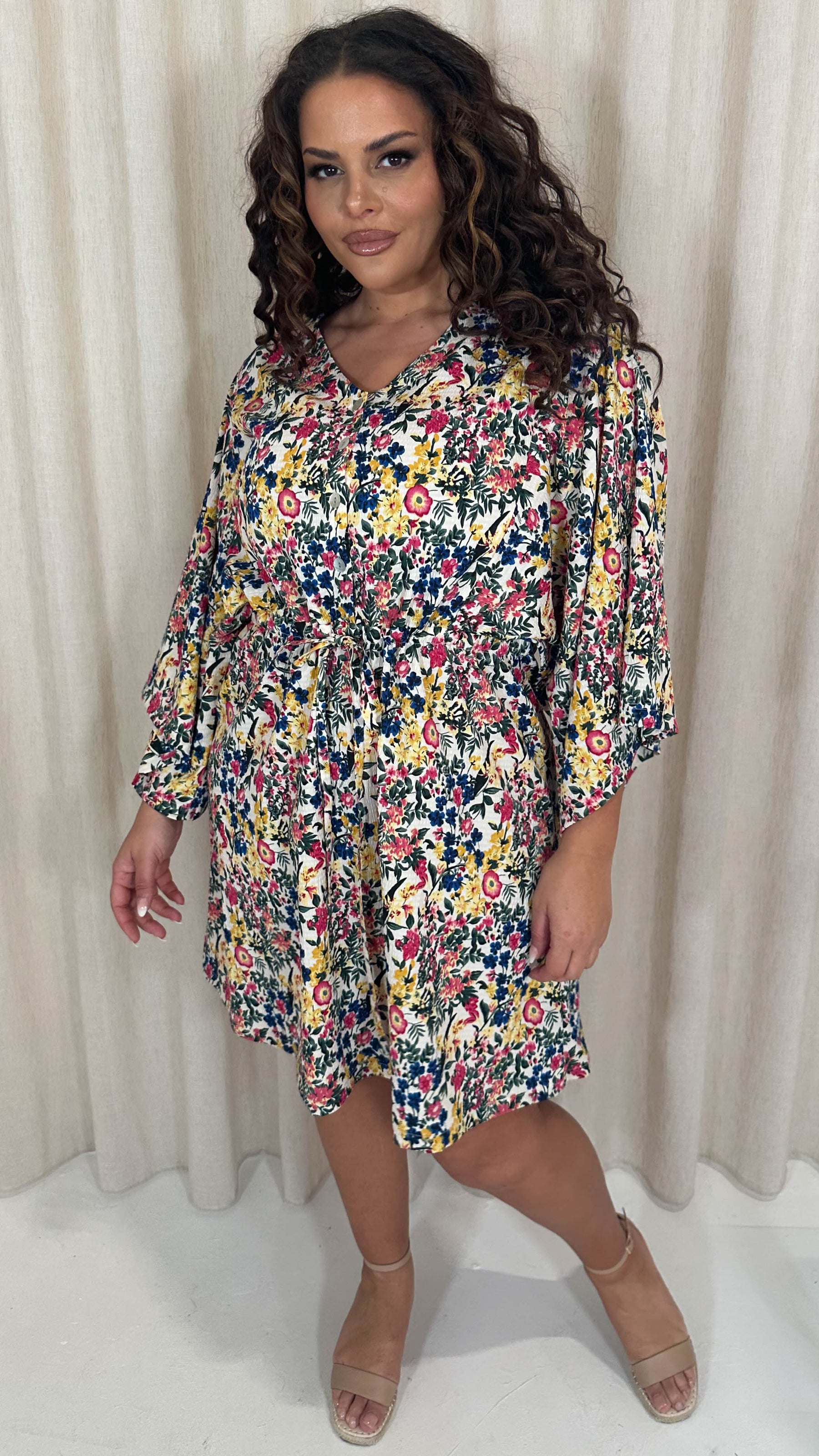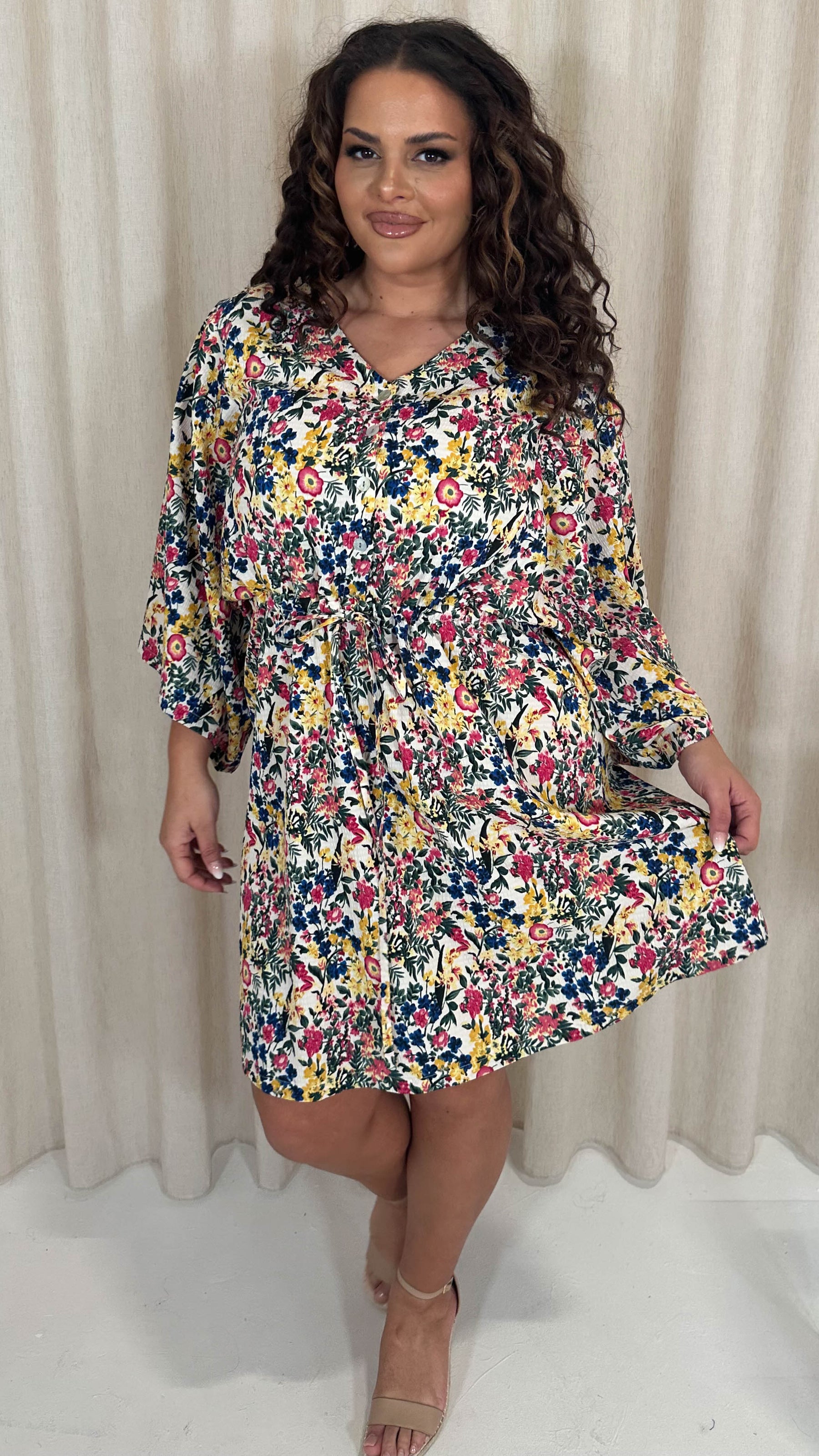 CurveWow Button Front Kimono Sleeve Dress Blue Multi Floral