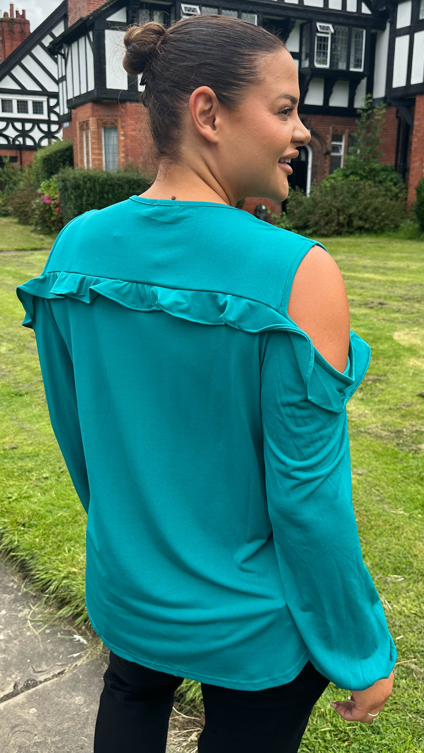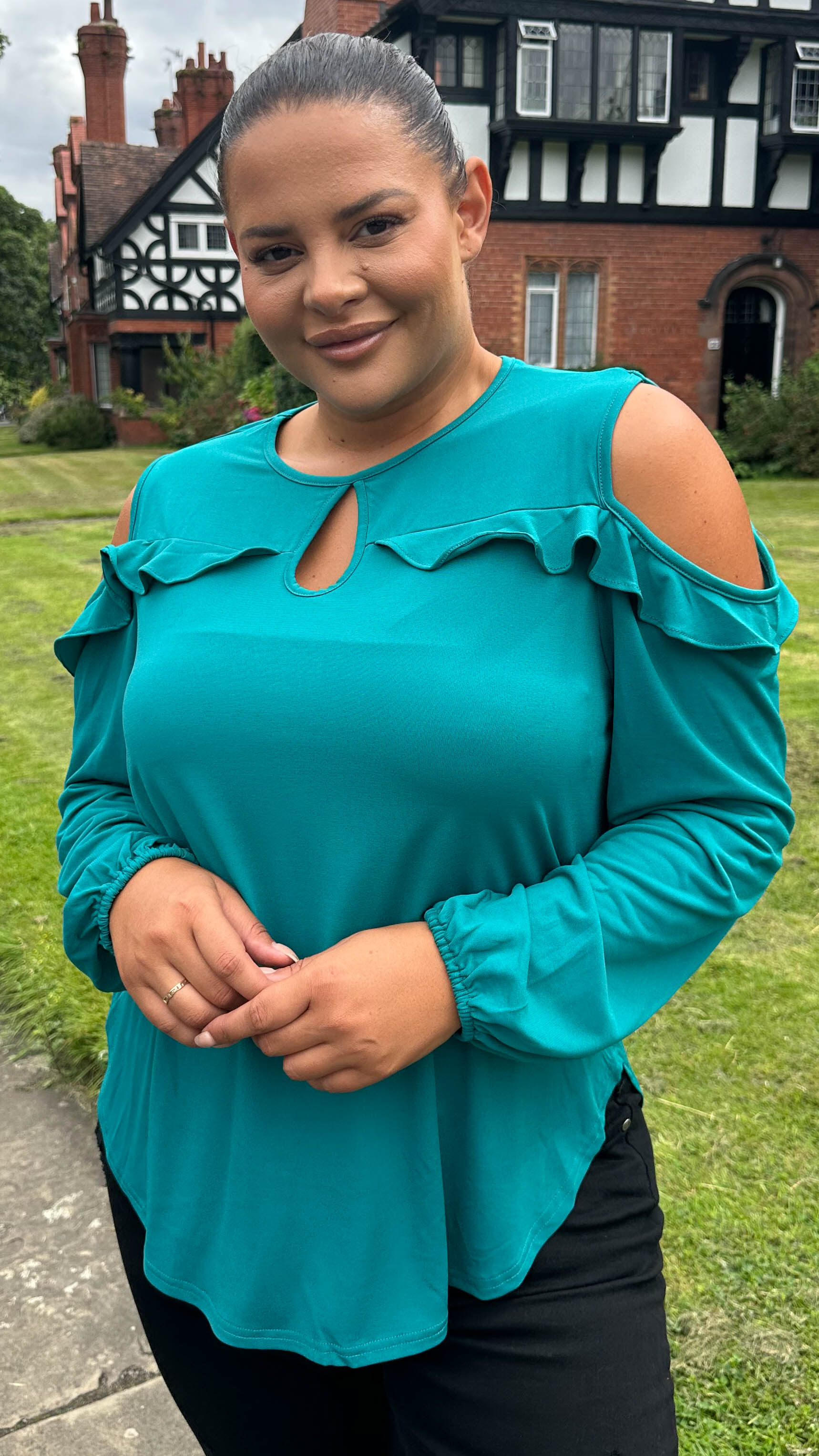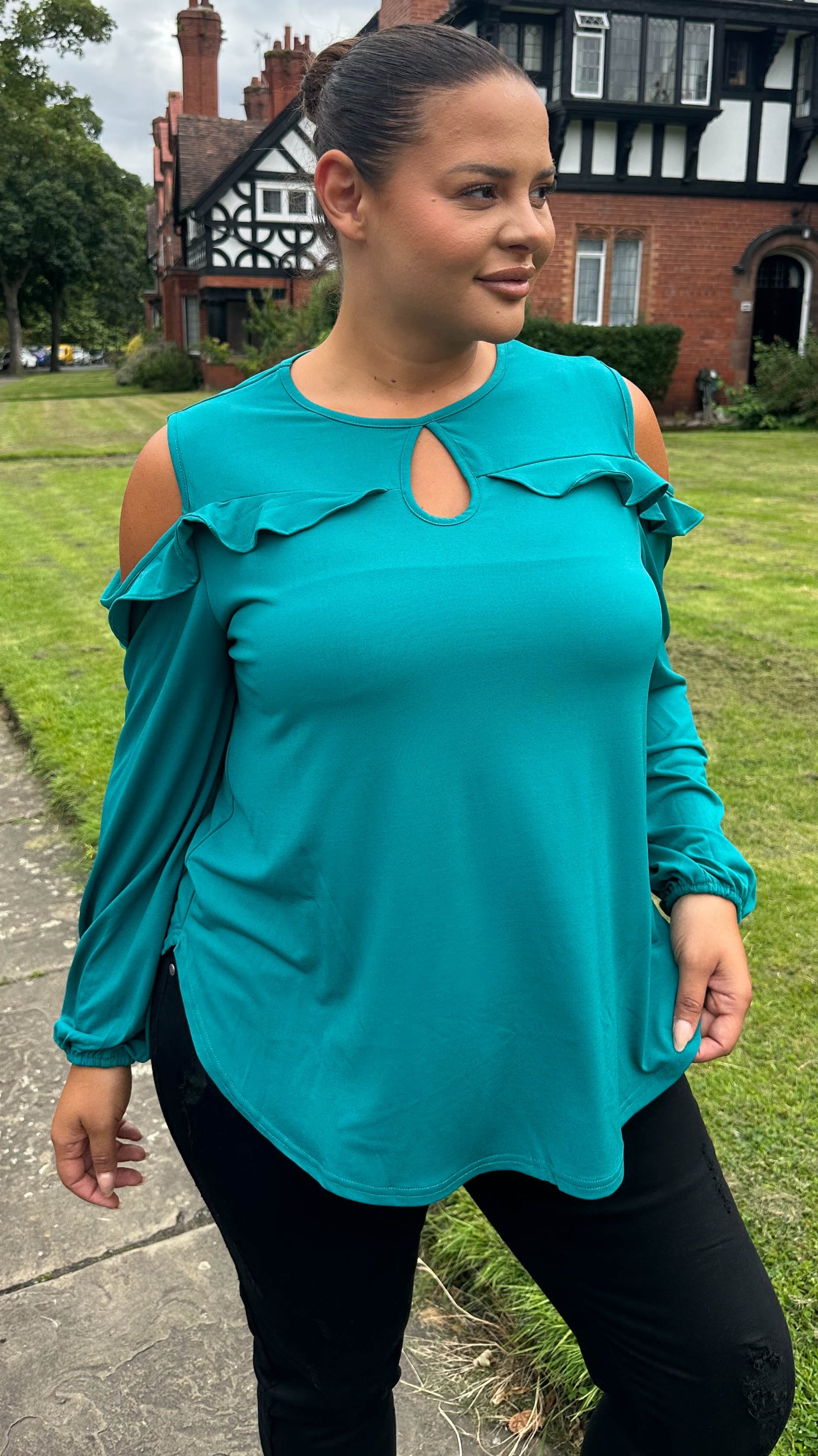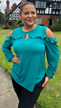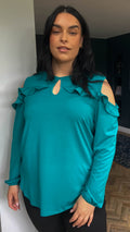 CurveWow Cold Shoulder Frill Top Green