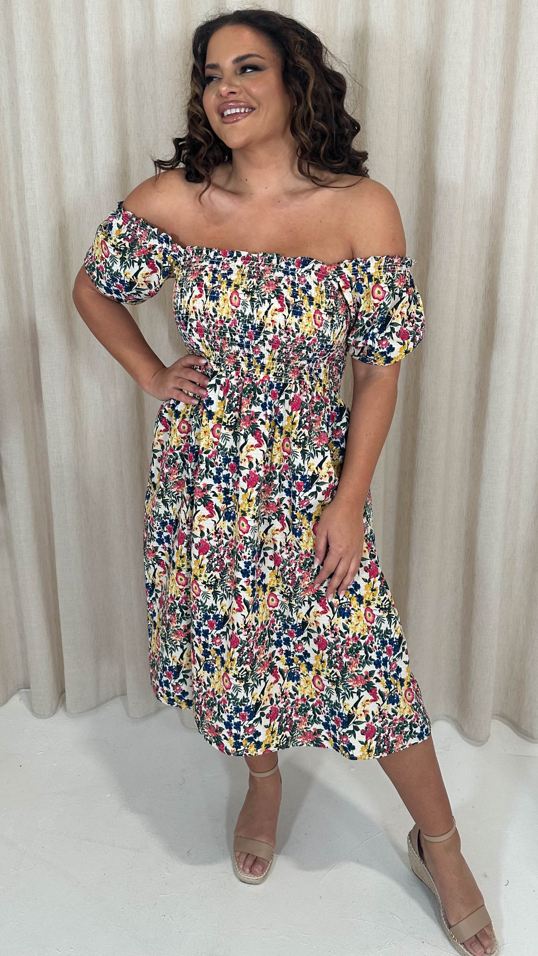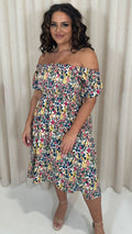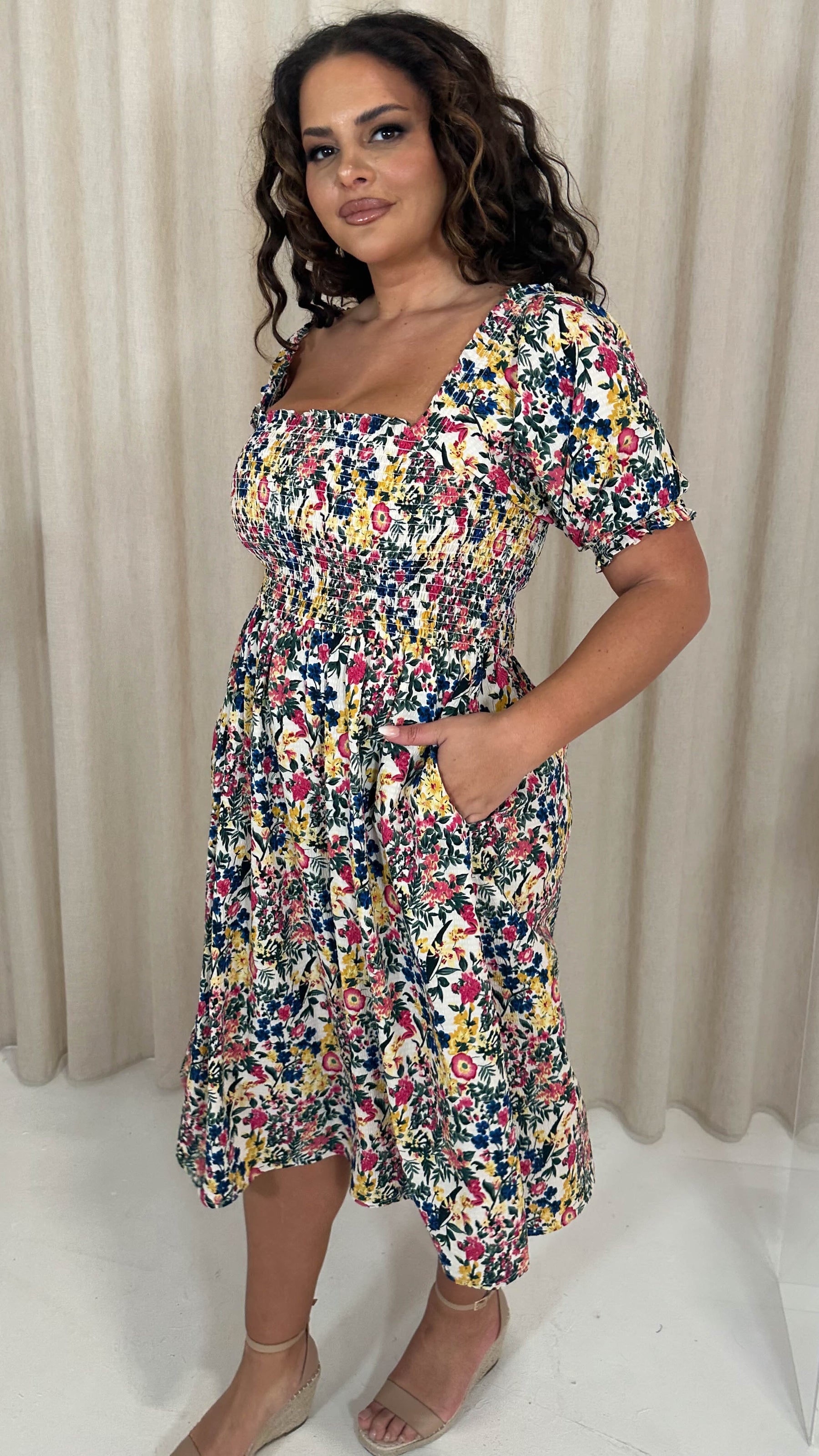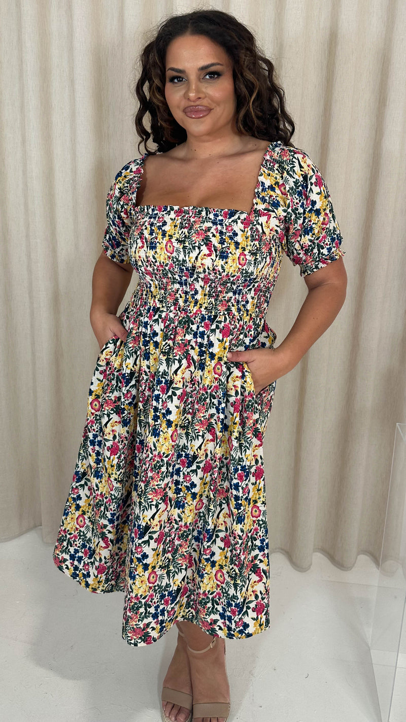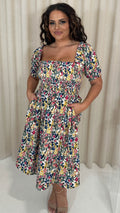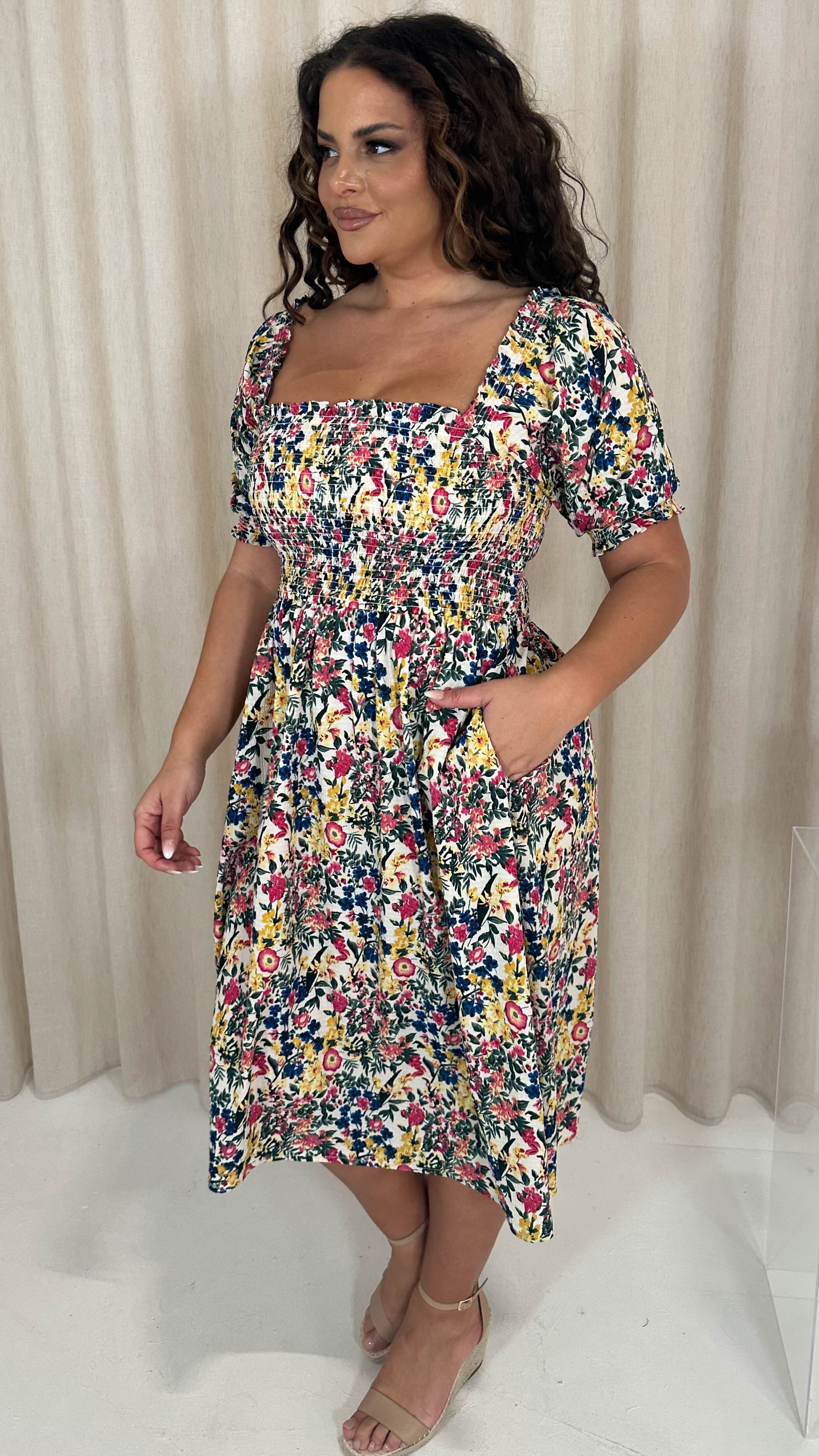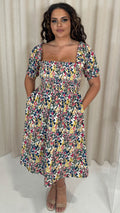 CurveWow Shirred Square Neck Midi Dress Multi Floral