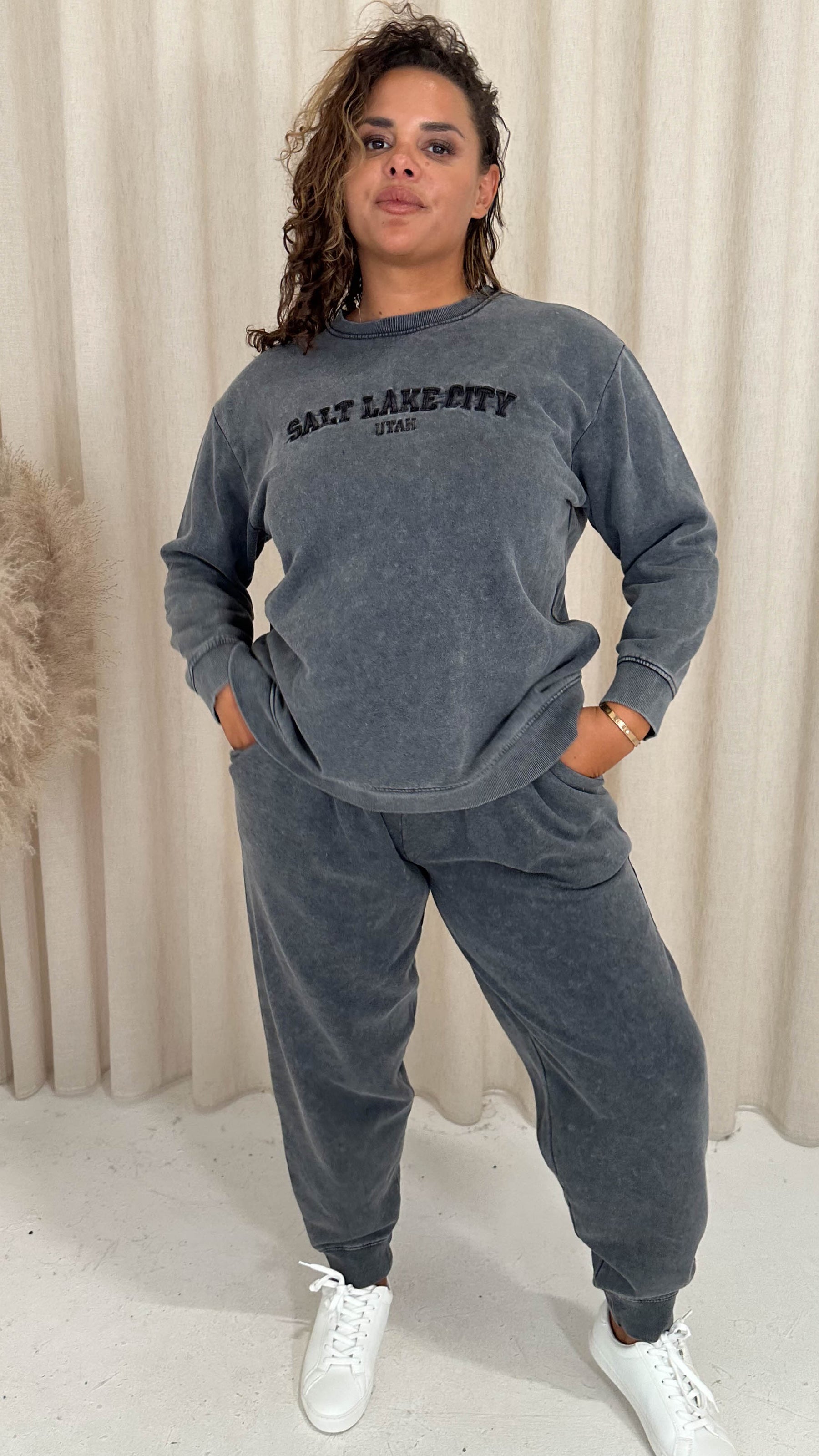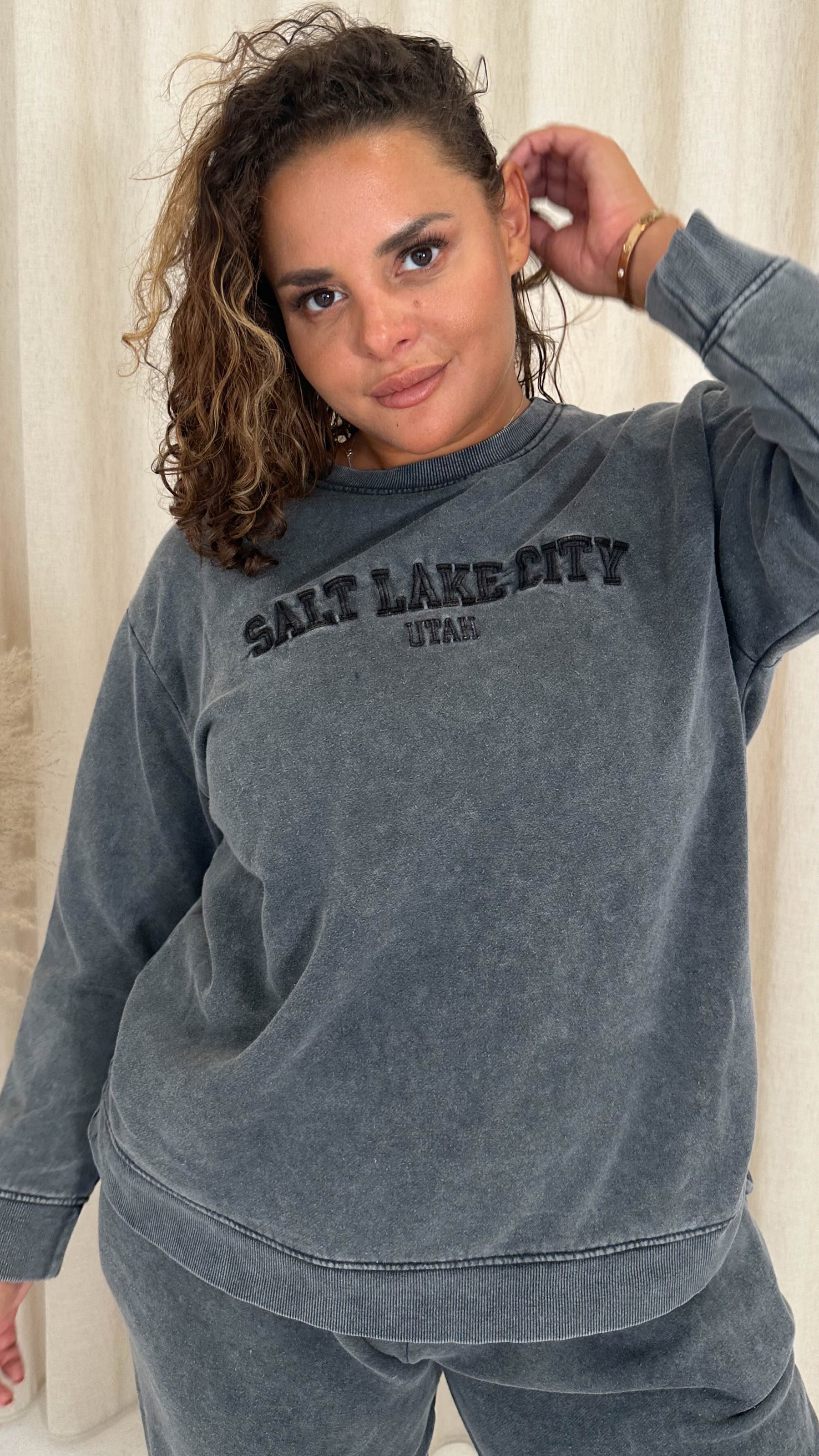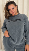 CurveWow Acid Wash Embroidered Sweater Charcoal Grey