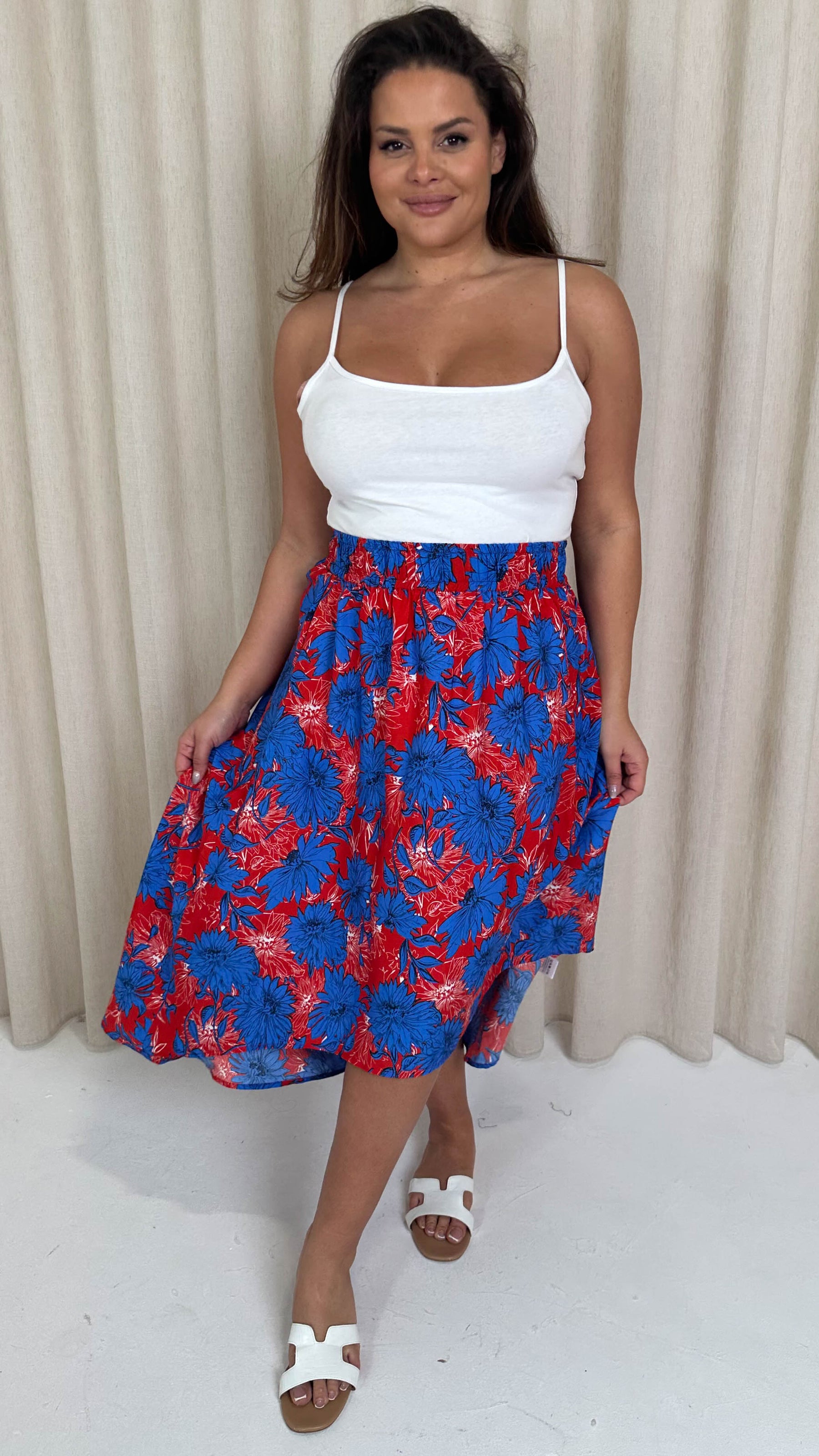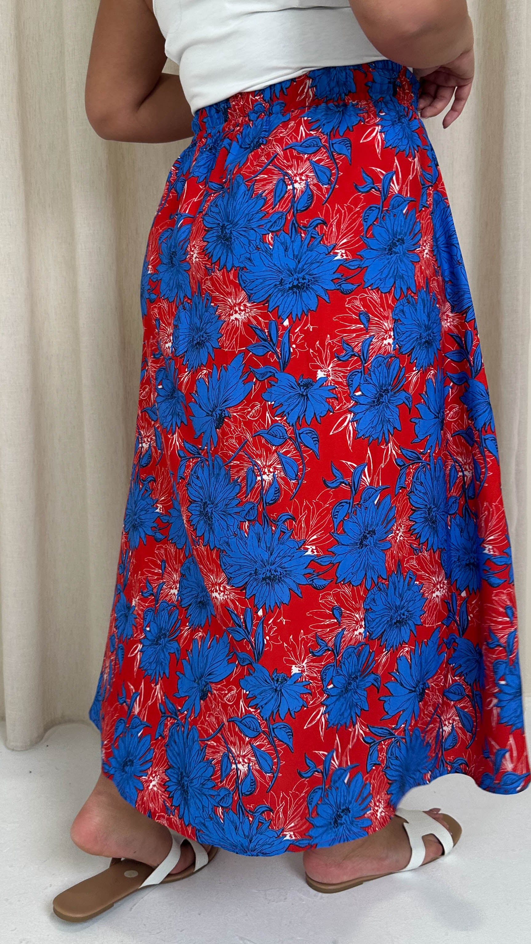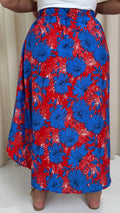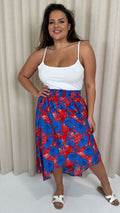 CurveWow Dipped Hem Midi Skirt Blue and Red Floral