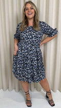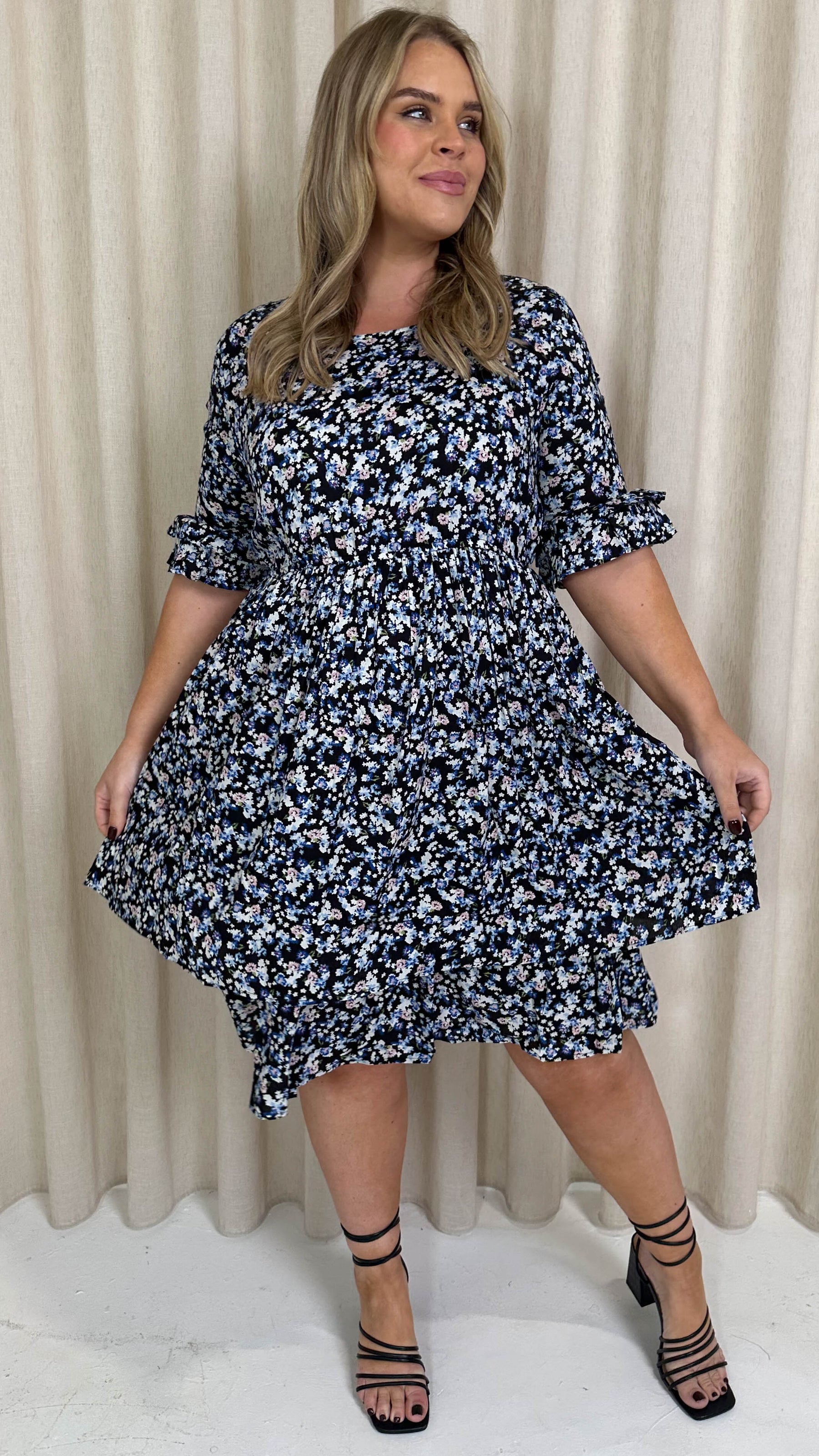 CurveWow Double Layer Tea Dress Blue Black Floral
