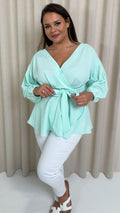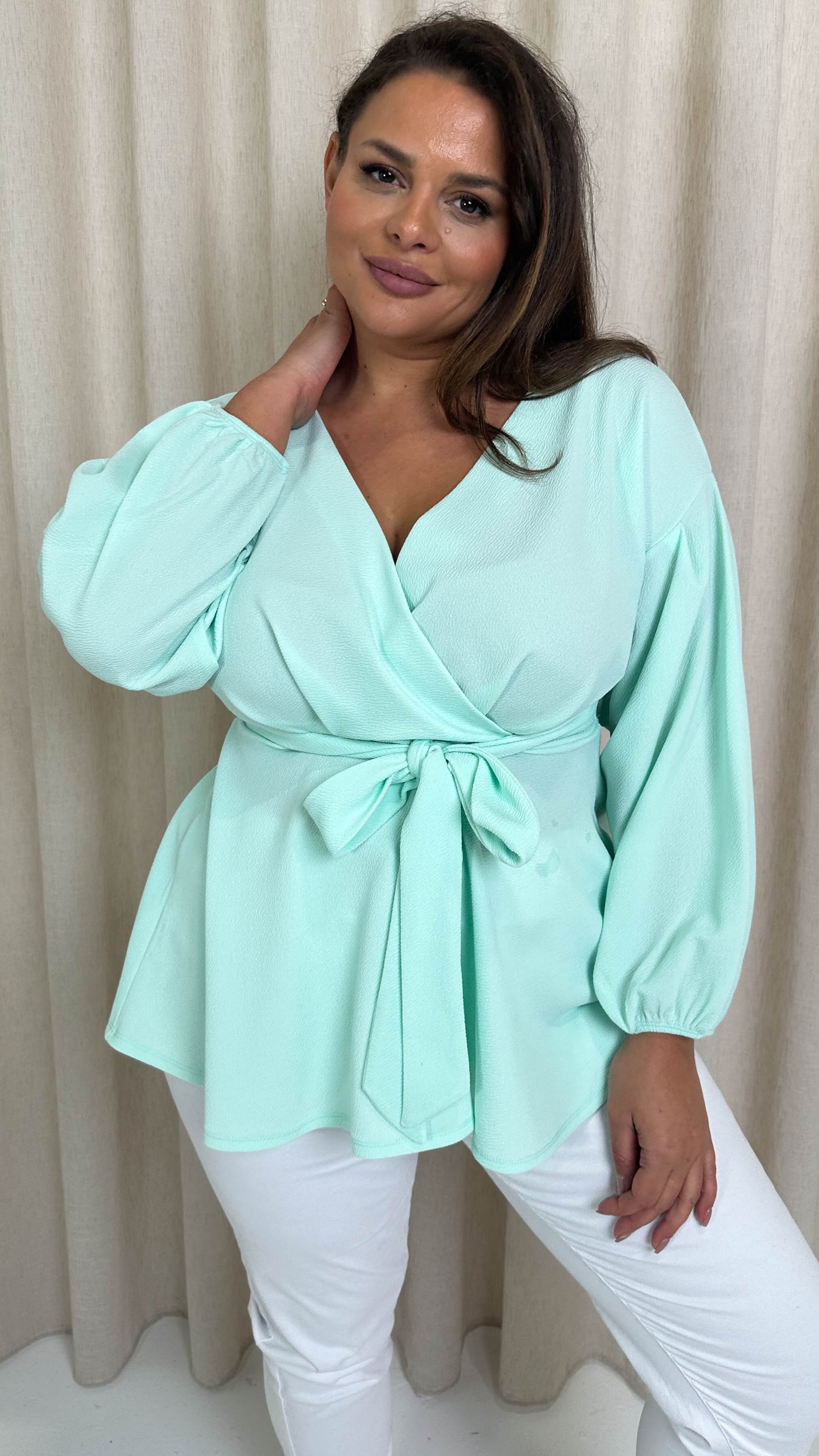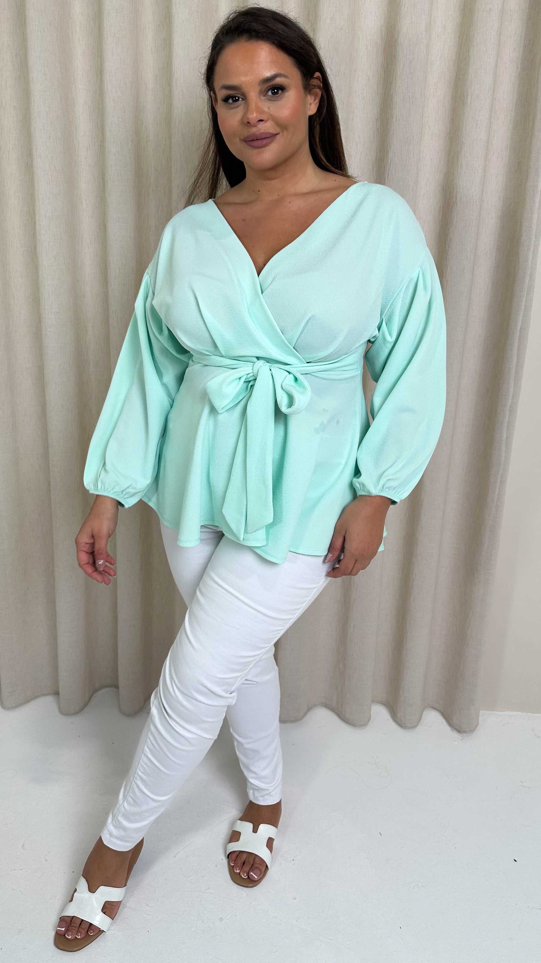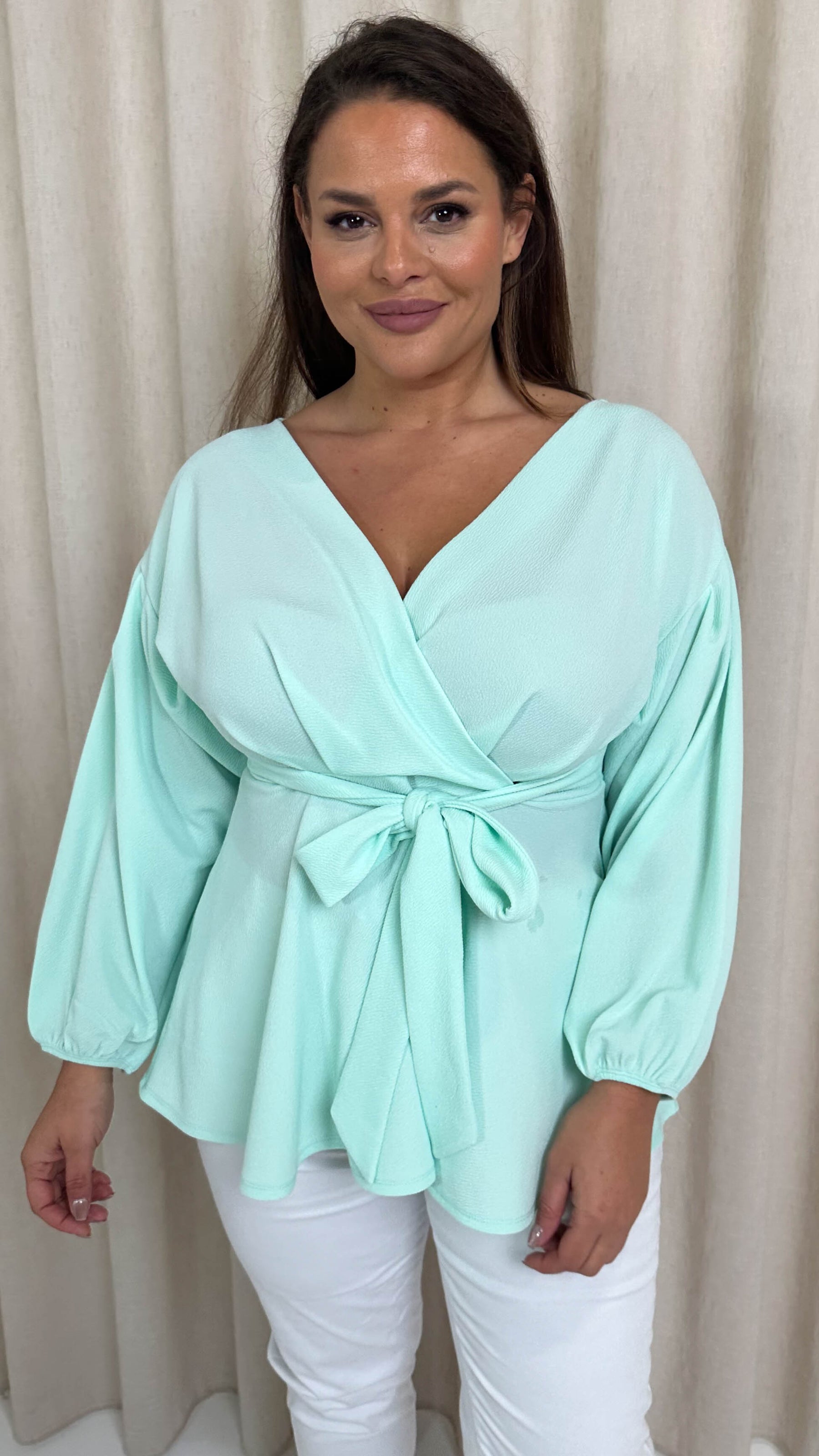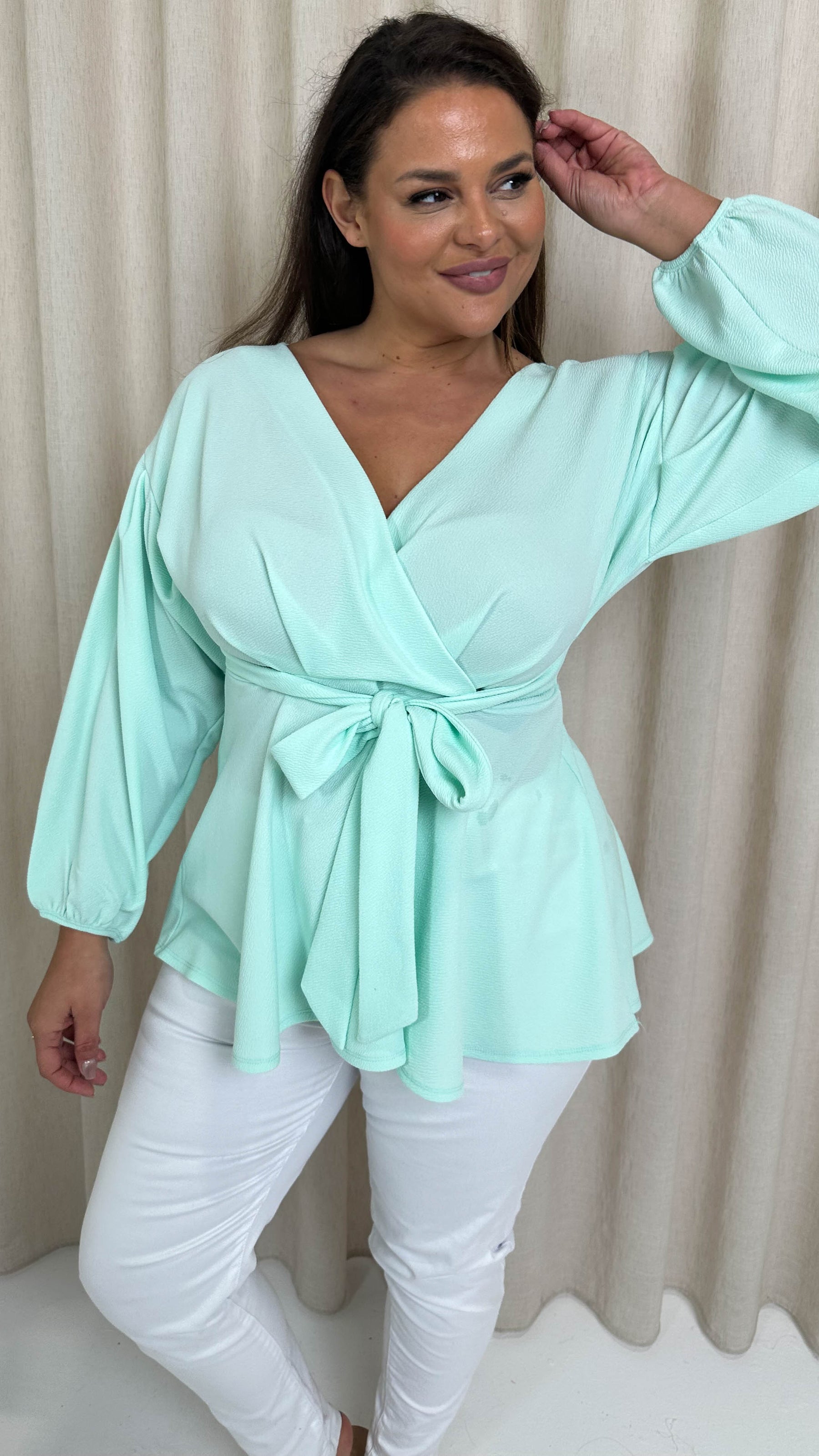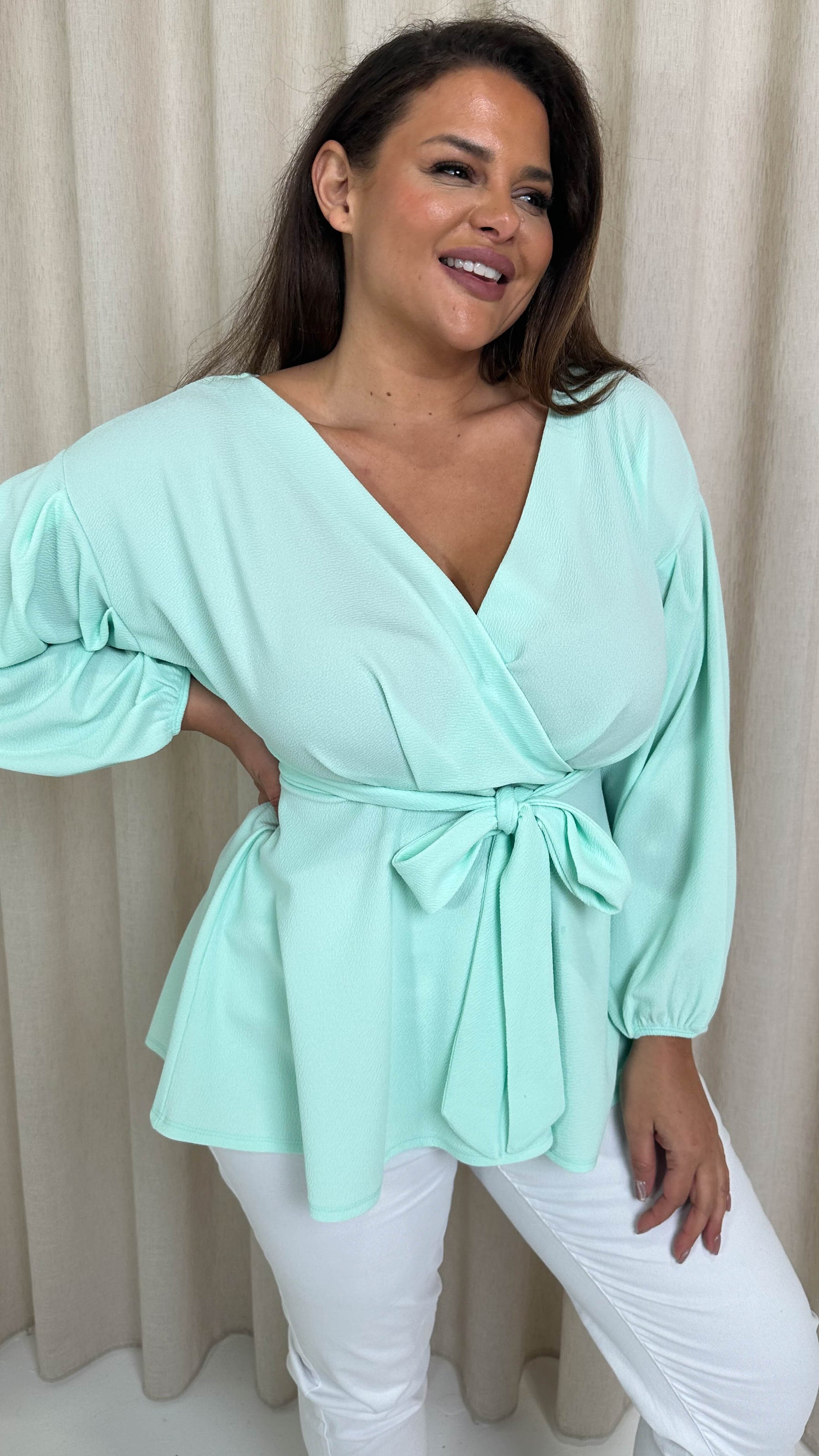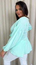 CurveWow Drop Shoulder Tie Waist Peplum Top Mint Green