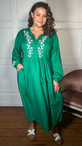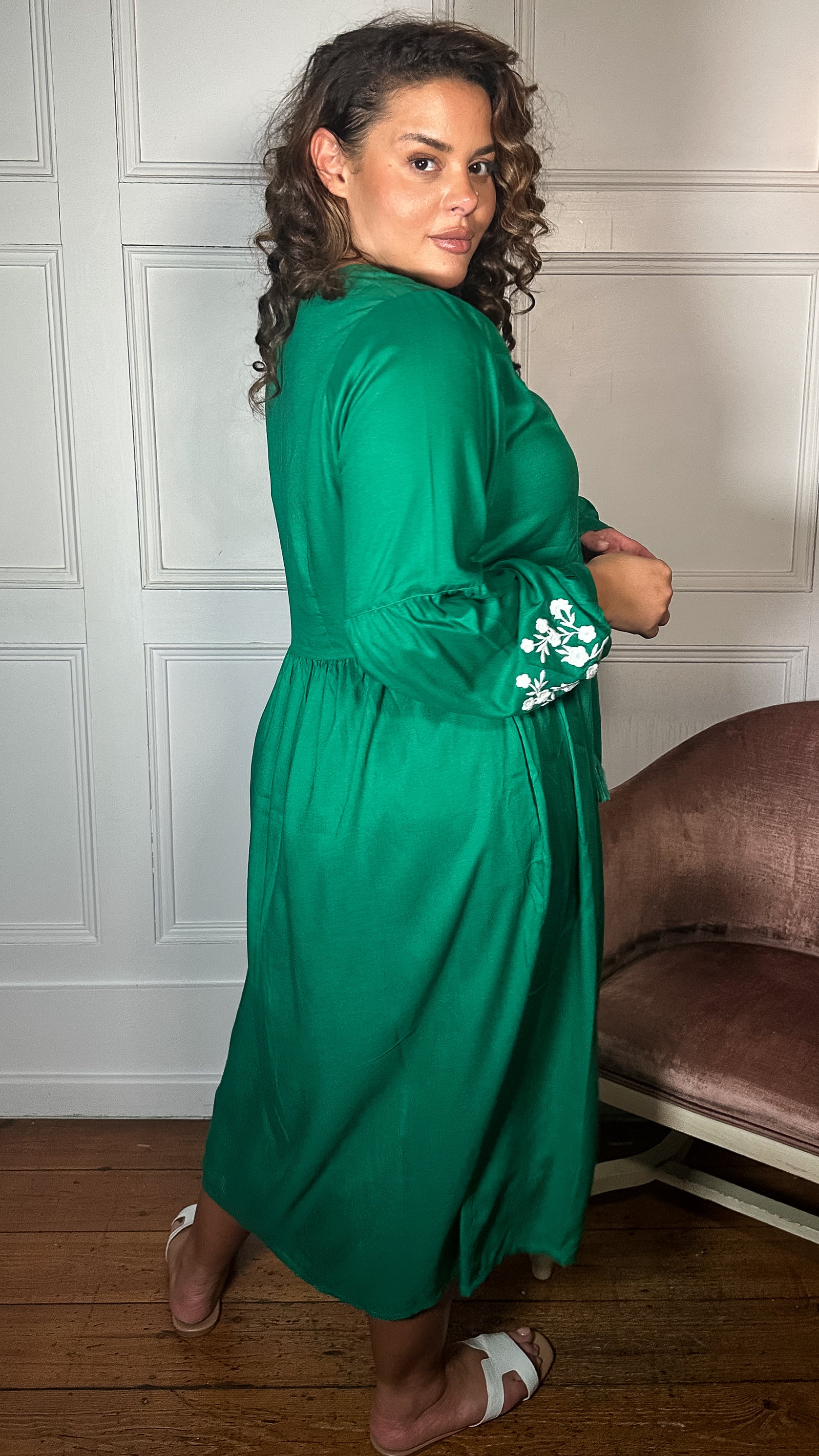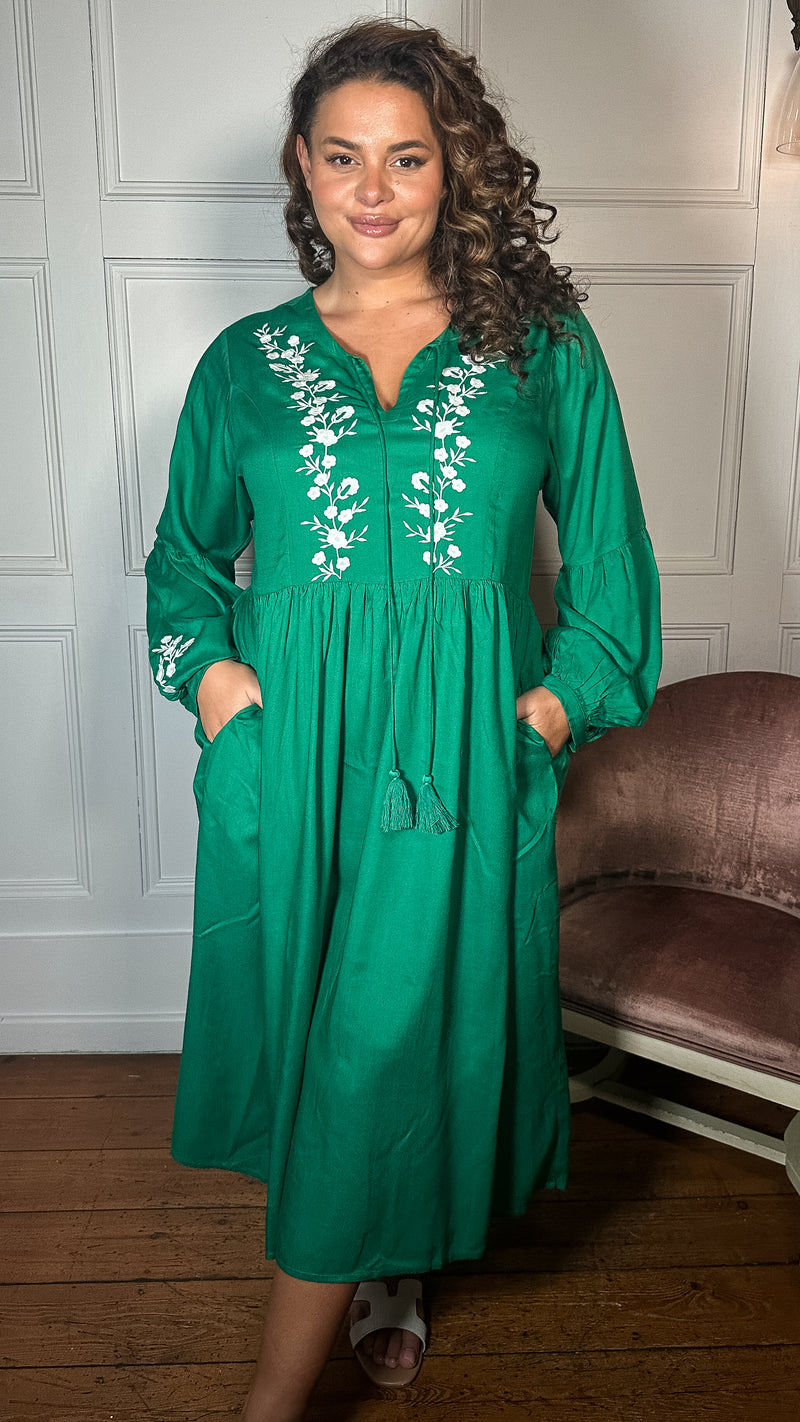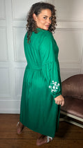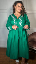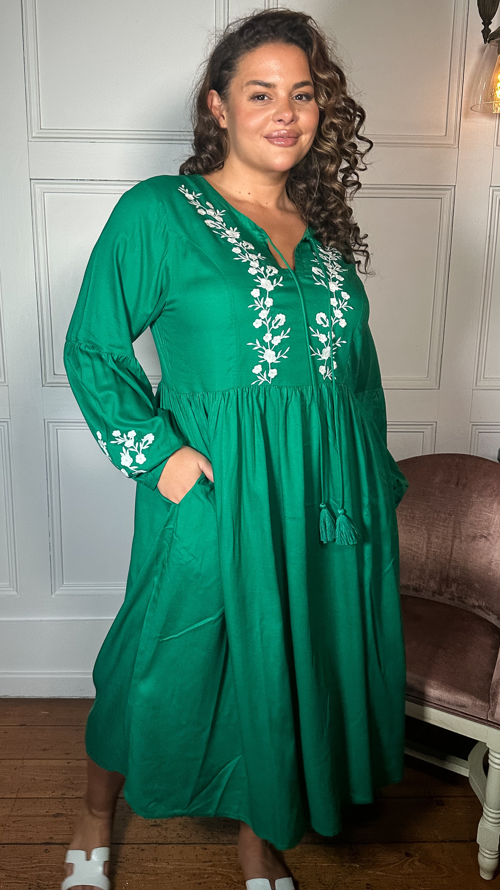 Curvewow Embroidered Tassel Tie Midi Dress Green
