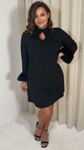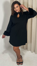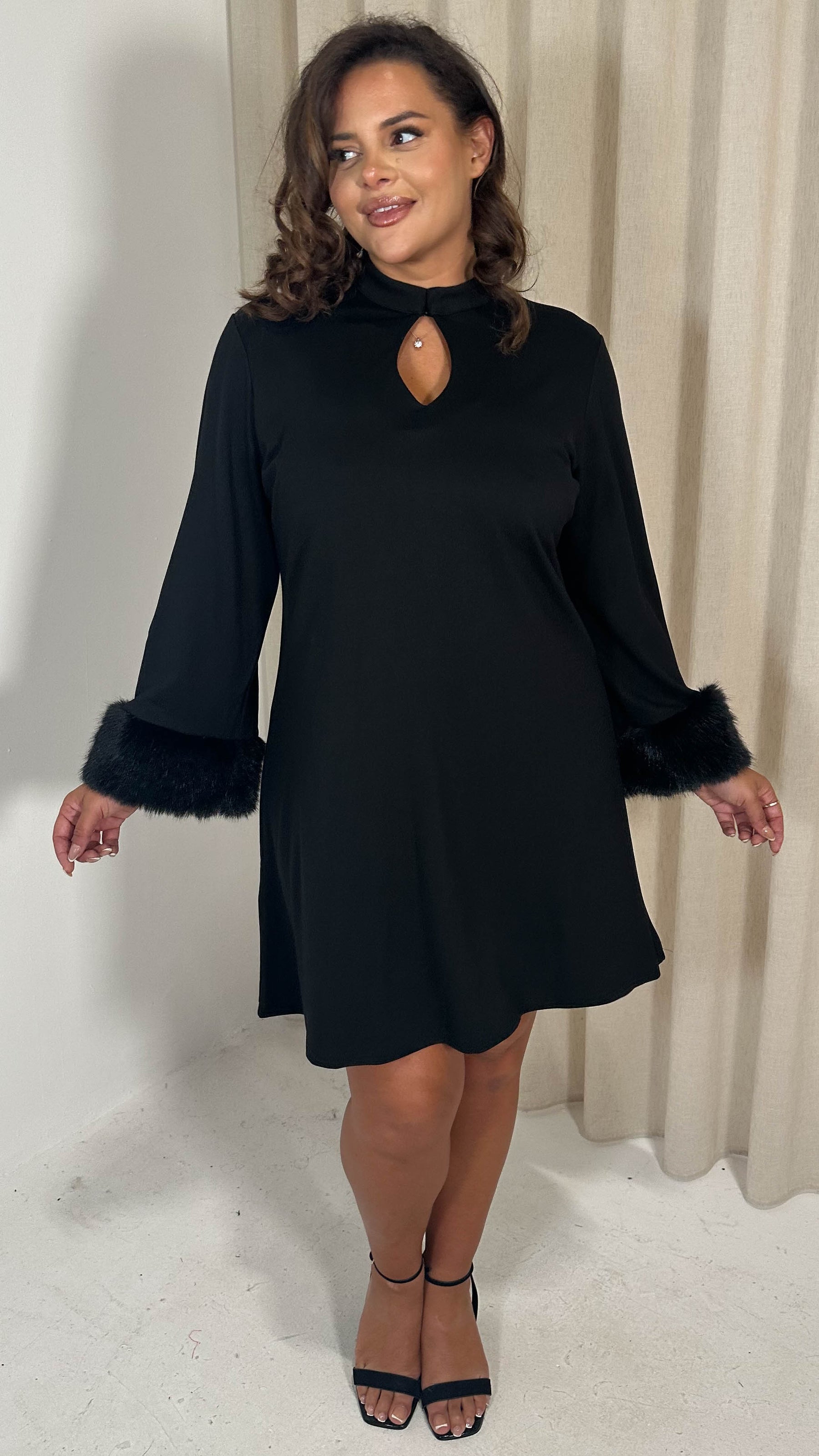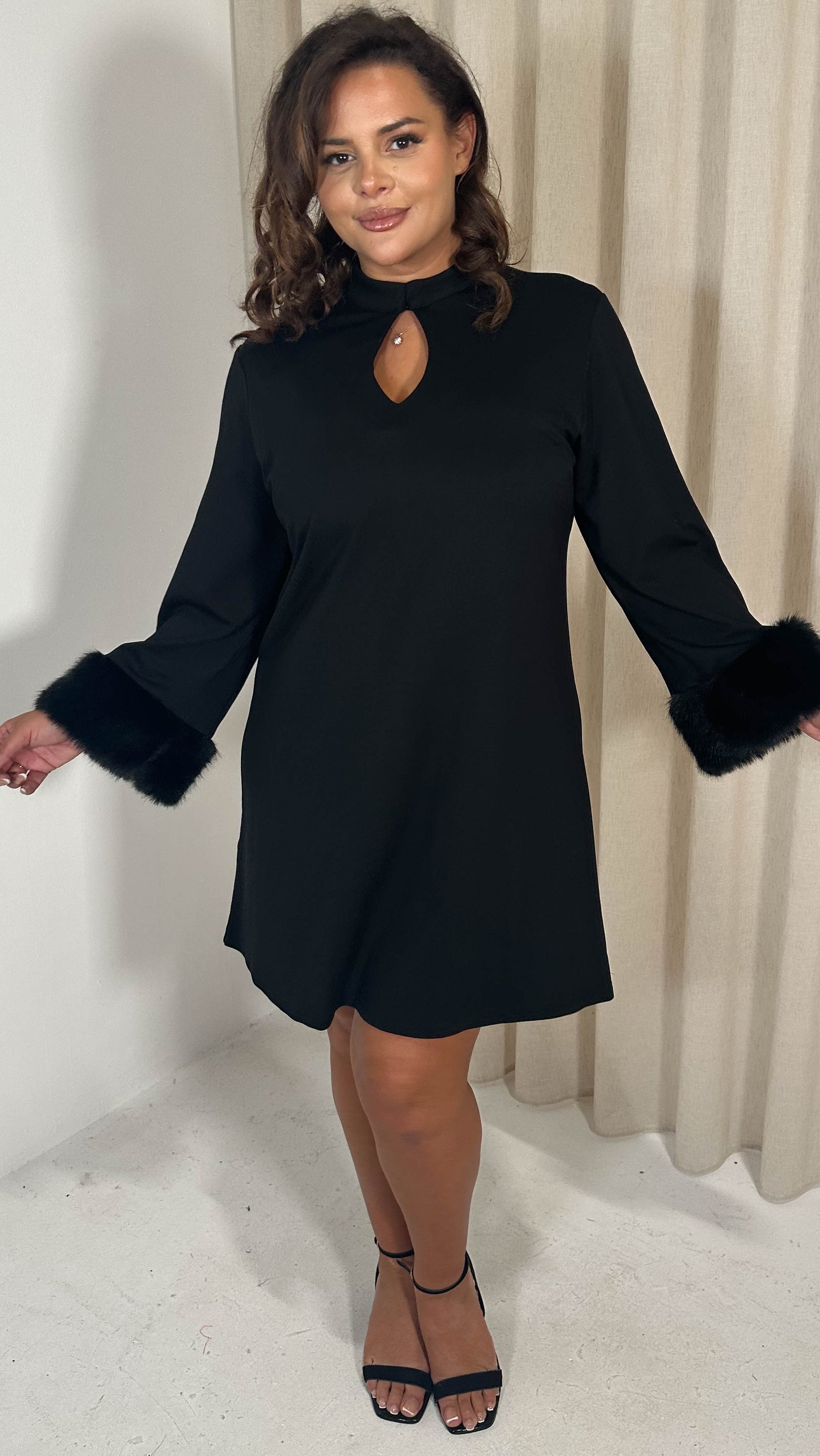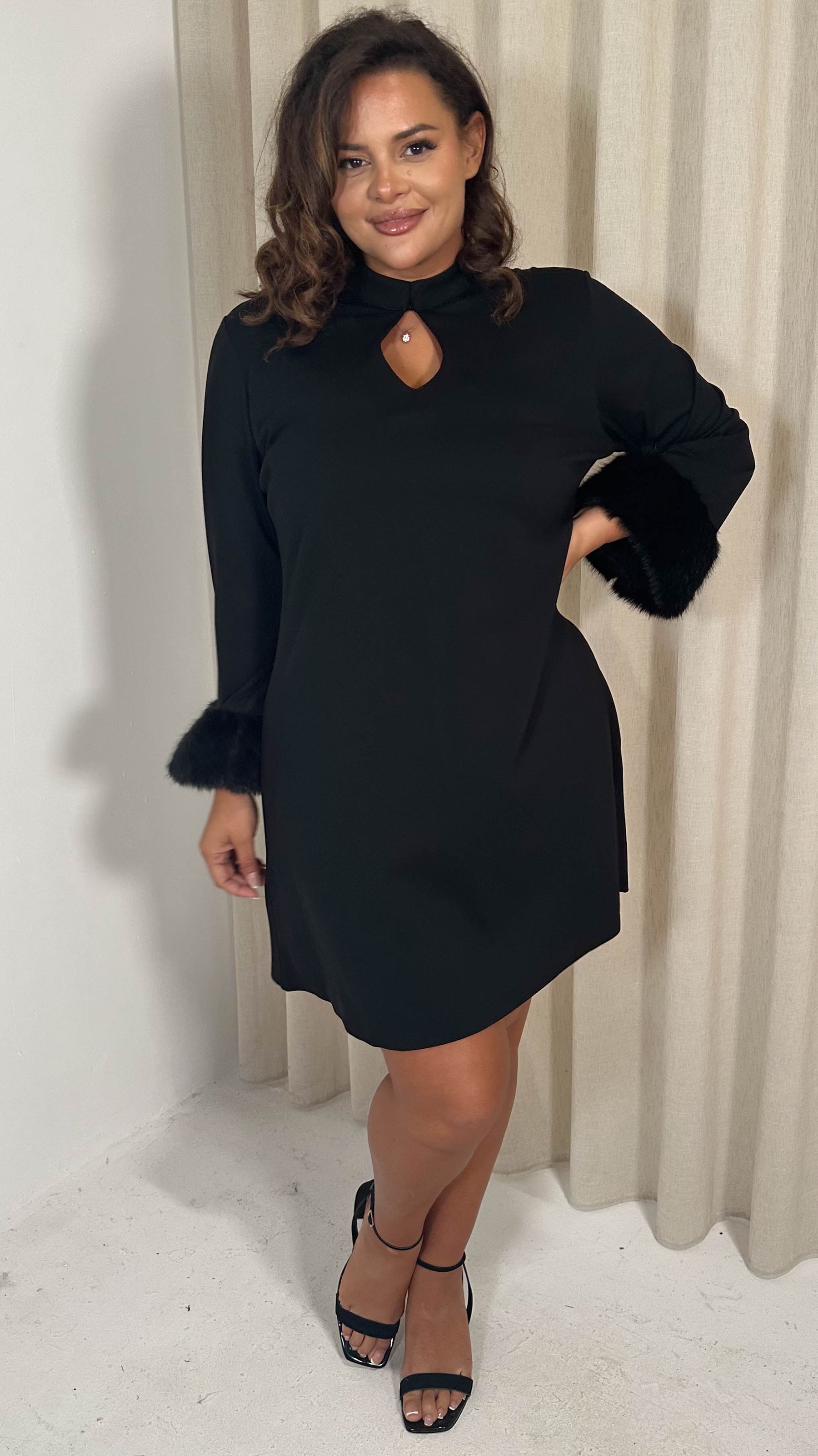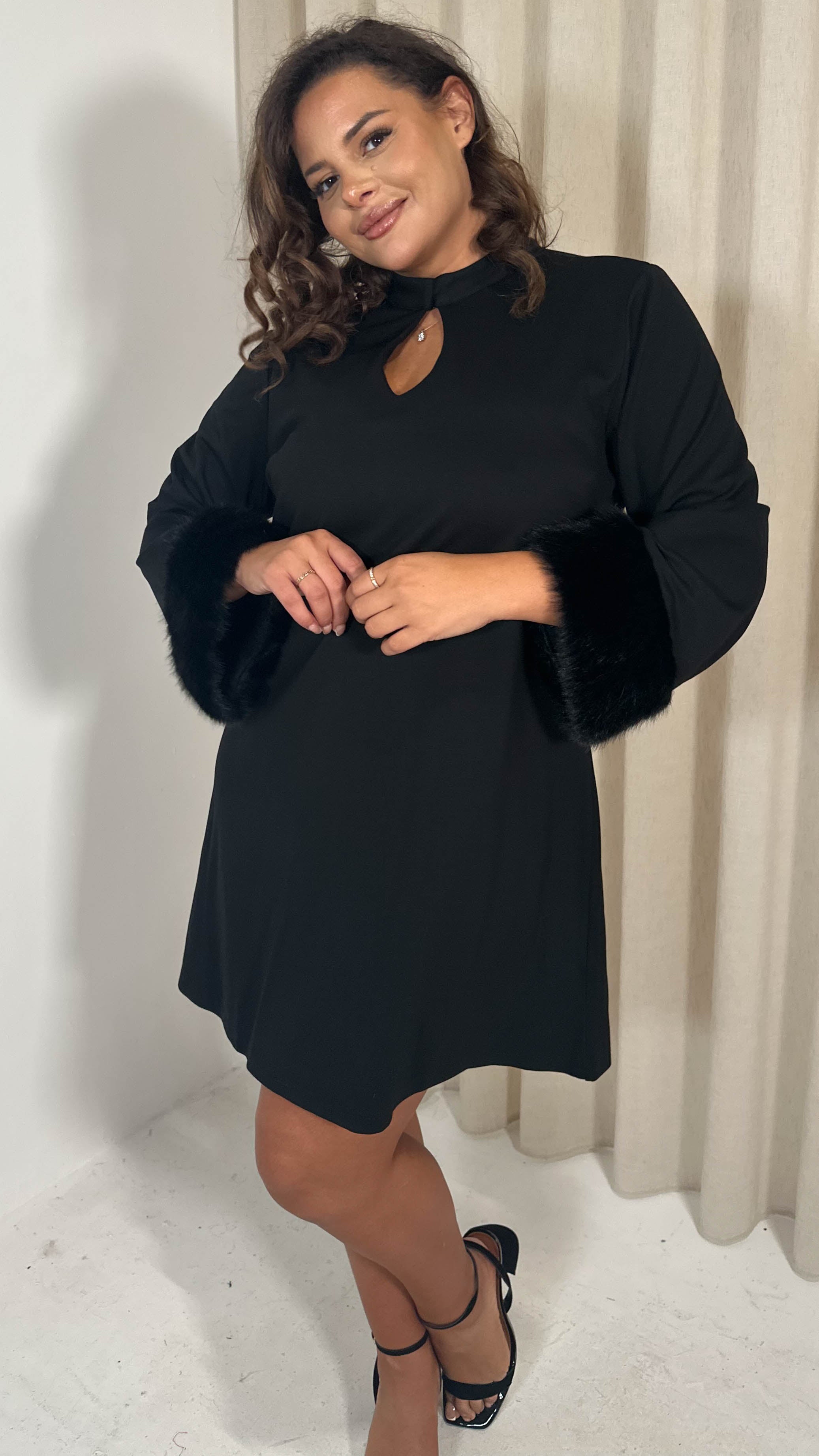 CurveWow Faux Fur Cuff Keyhole Shift Dress Black