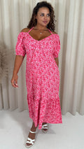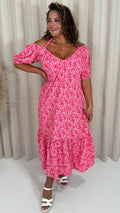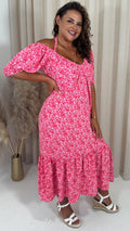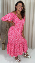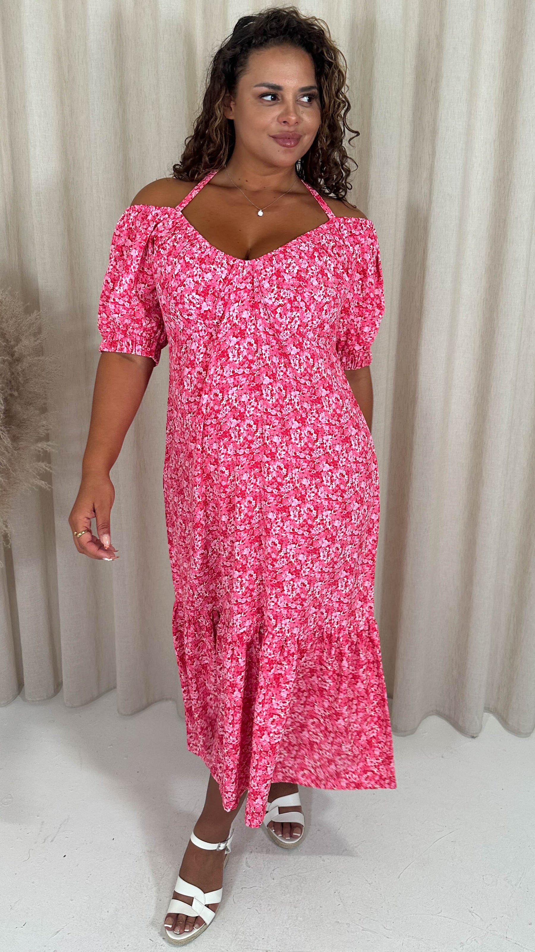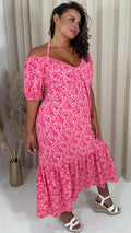CurveWow Frill Hem Halter Tie Midi Dress Red/Pink Floral