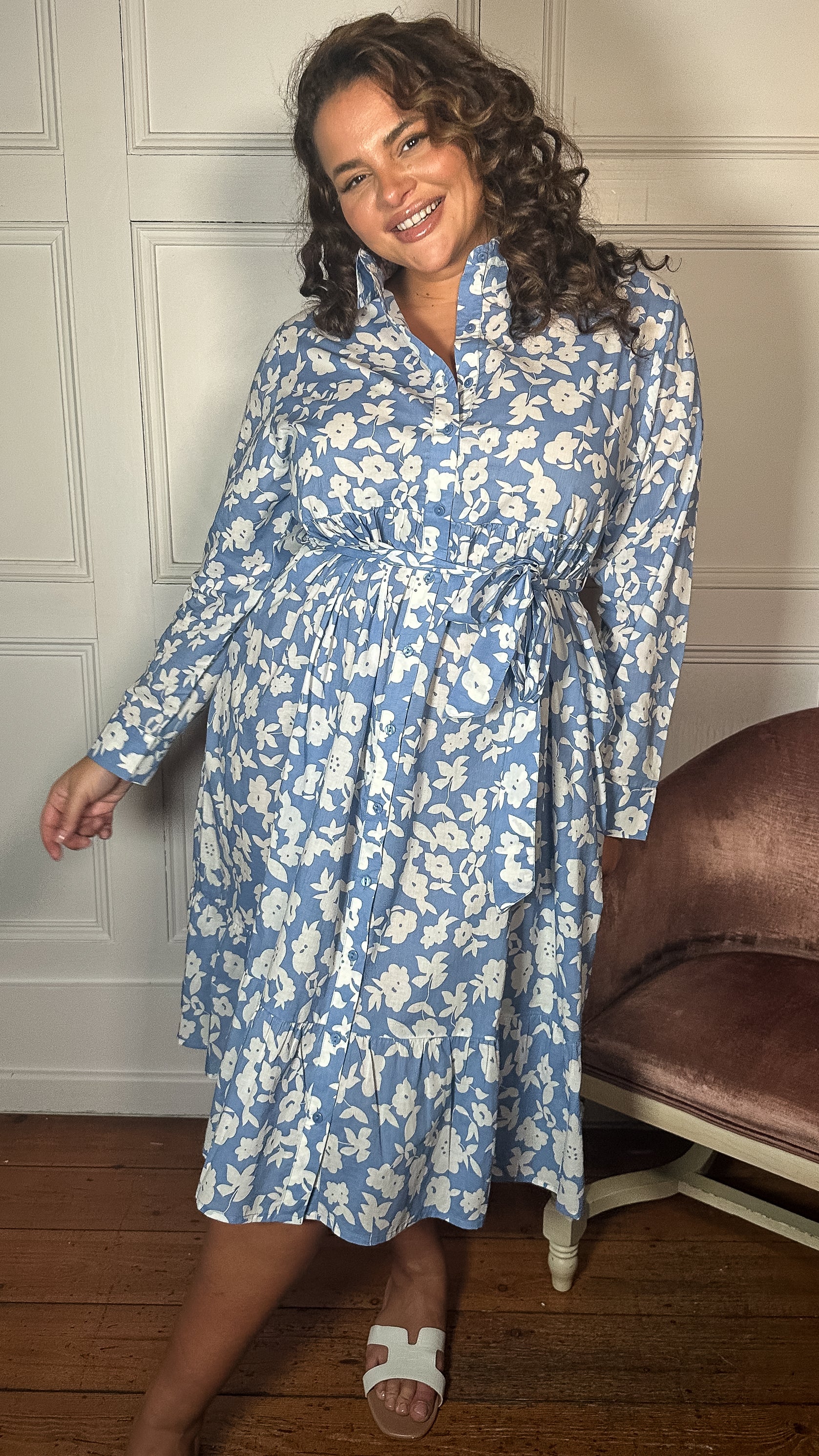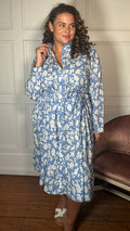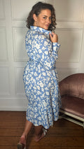 CurveWow Frill Hem Tie Waist Shirt Dress Blue Floral