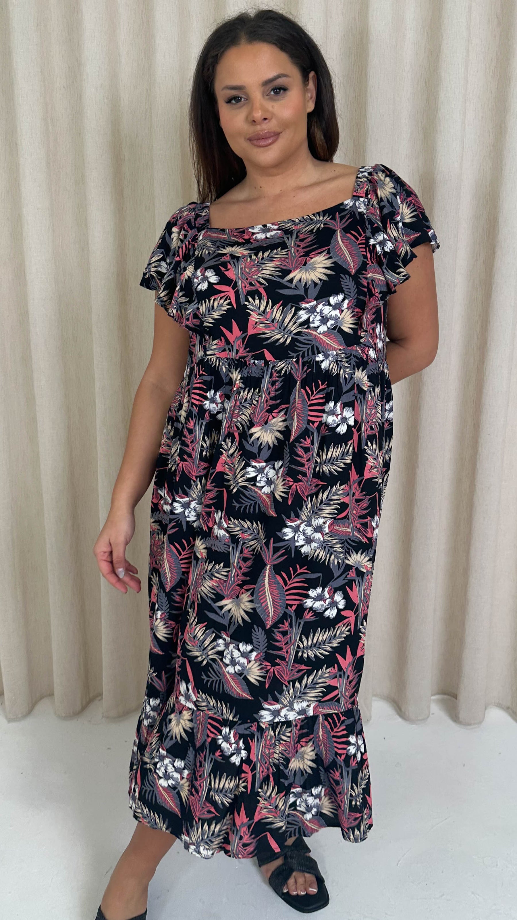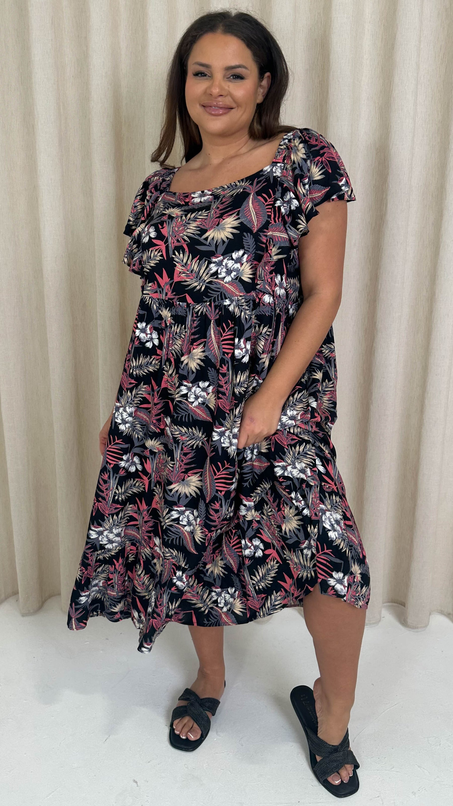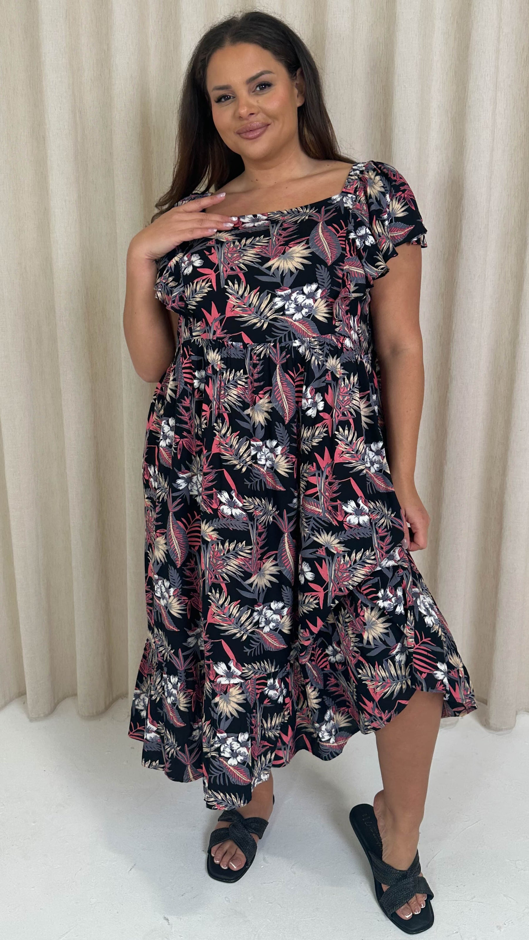 CurveWow Frill Shoulder Midi Dress Tropical Flowers