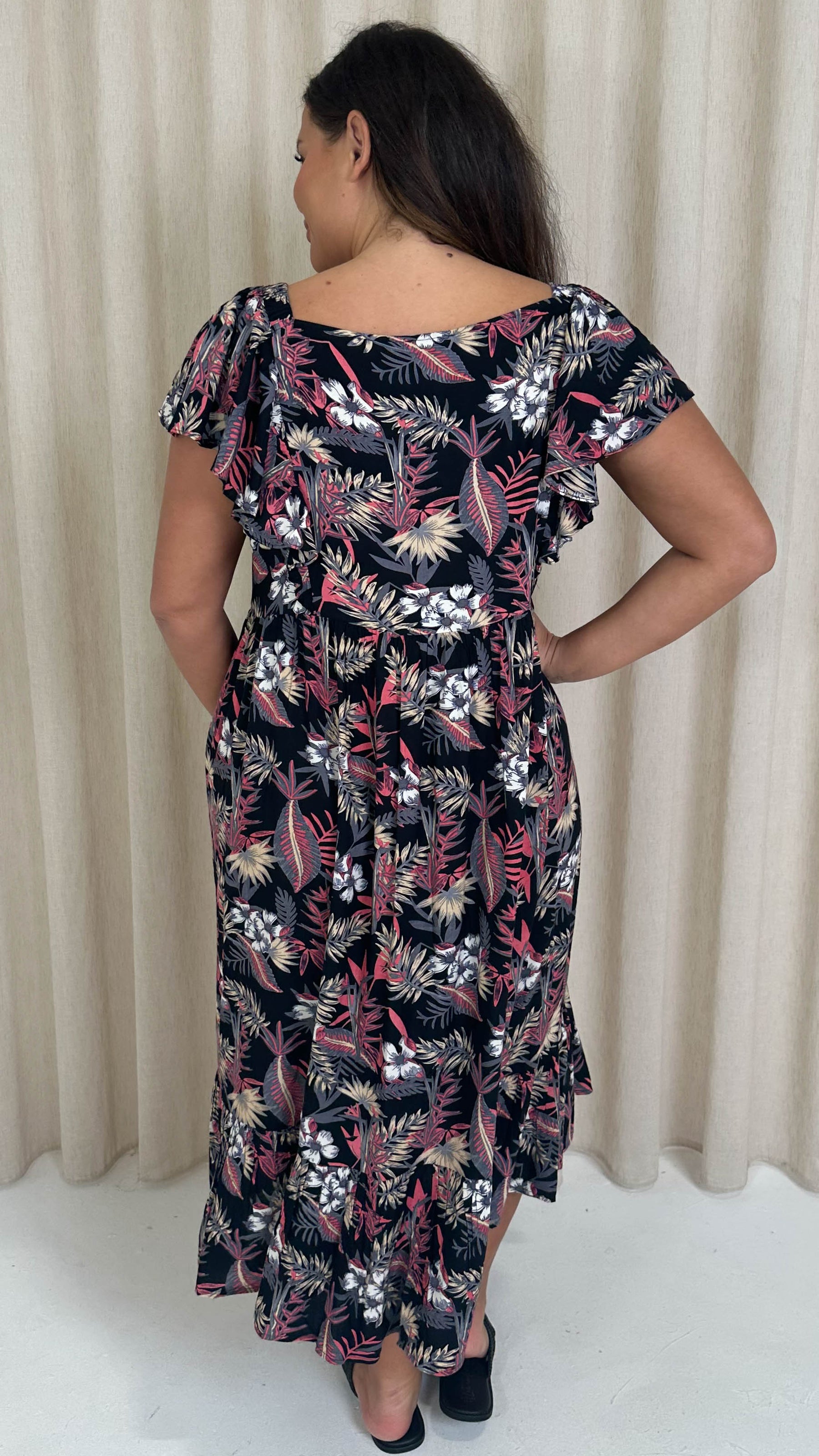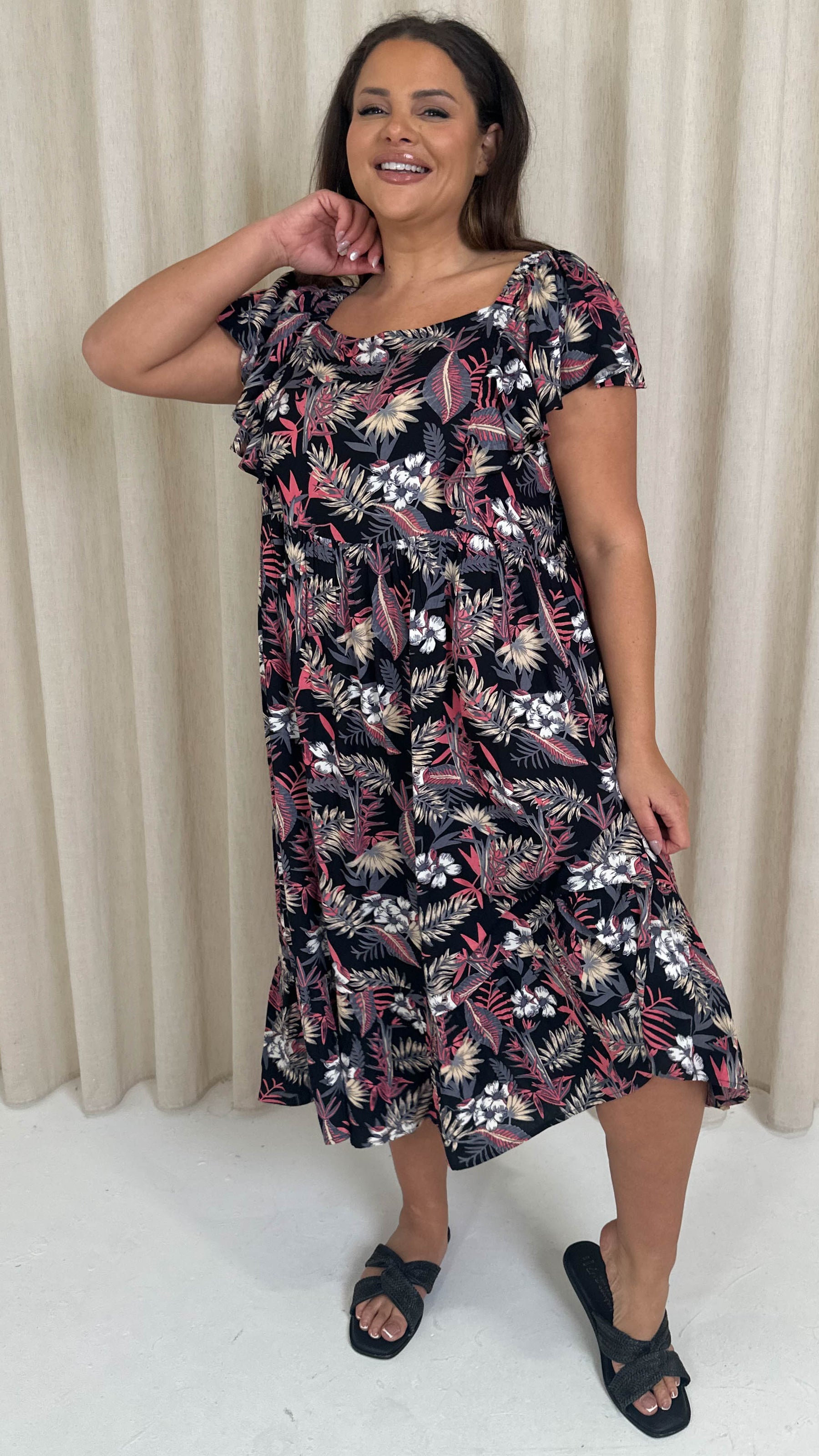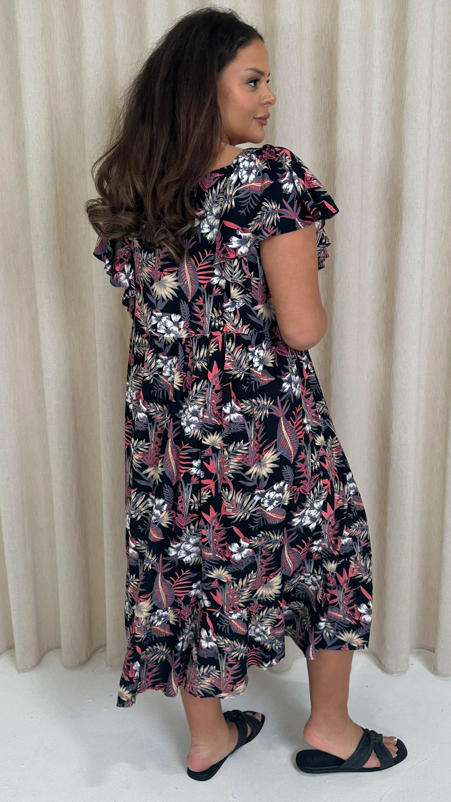 CurveWow Frill Shoulder Midi Dress Tropical Flowers