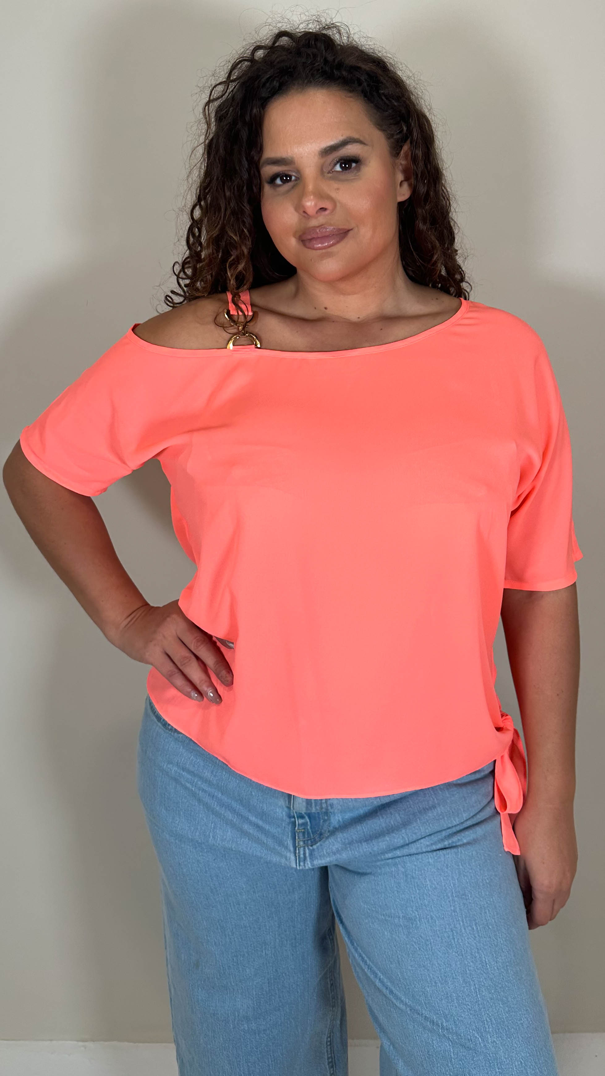 CurveWow Gold Shoulder Trim Tie Hem Top Neon Coral