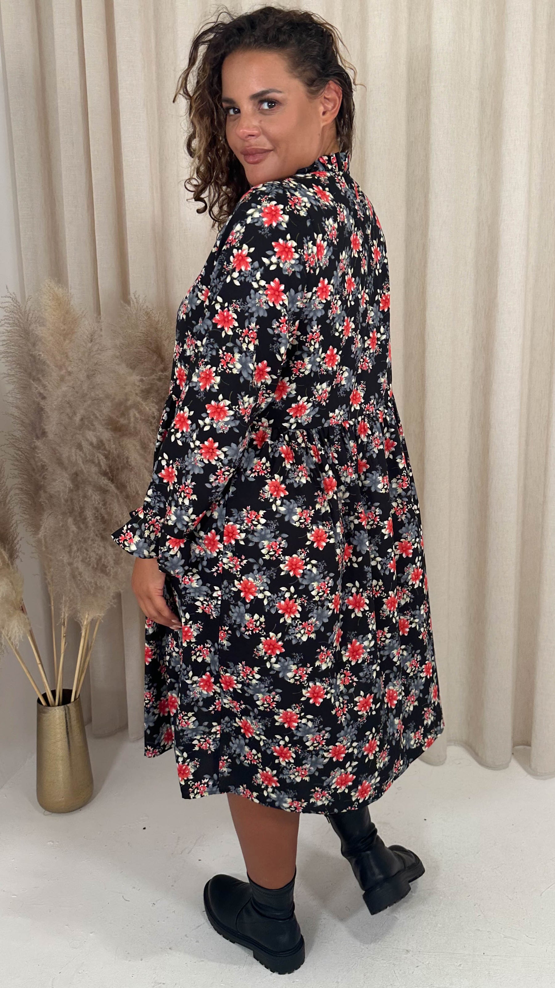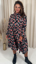 CurveWow High Neck Smock Dress Black Floral