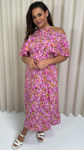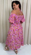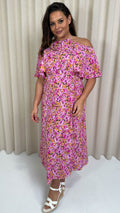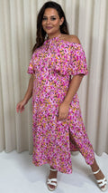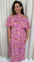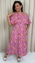 CurveWow Keyhole Cold Shoulder Midi Dress Pink Floral