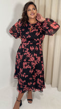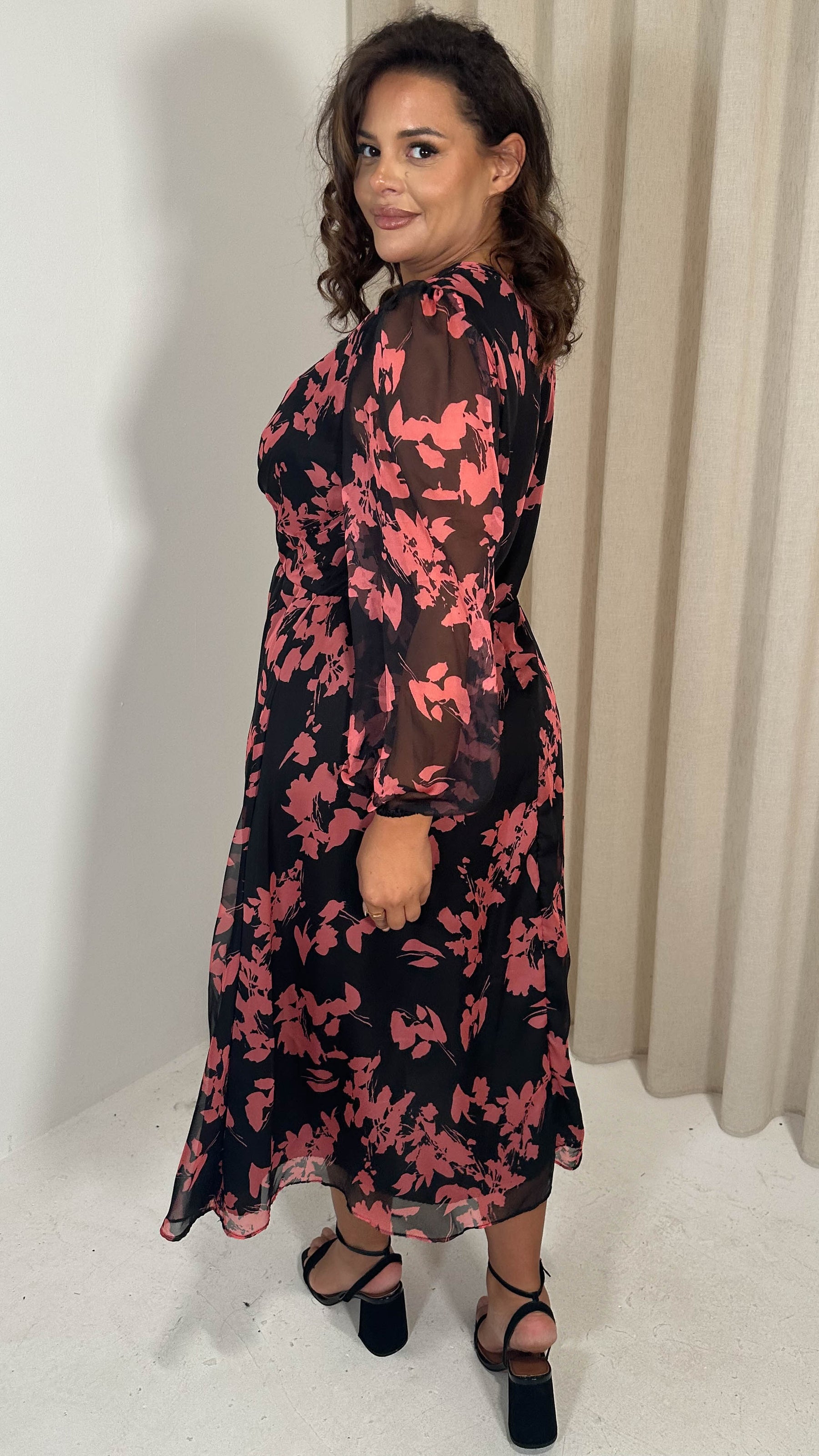 CurveWow Keyhole Midi Dress Black Pink Floral