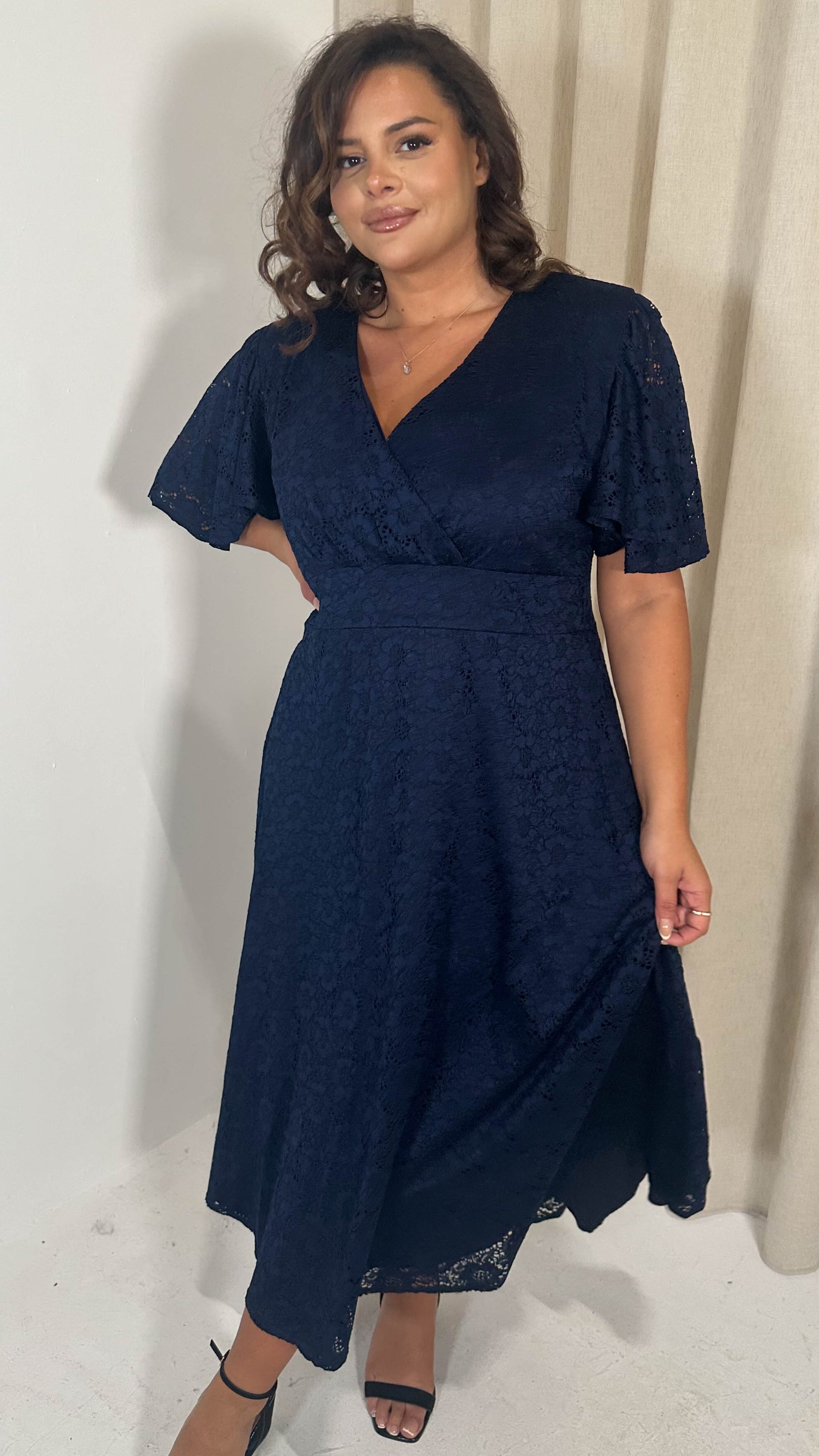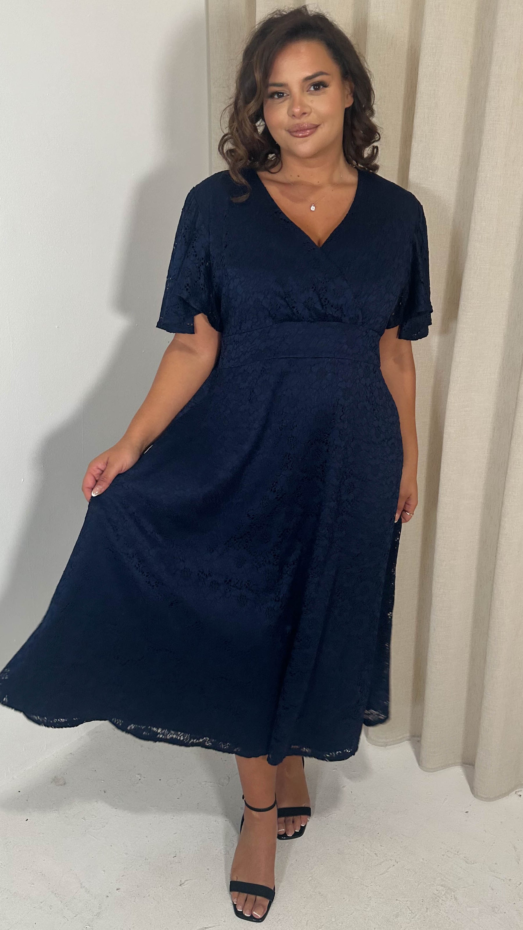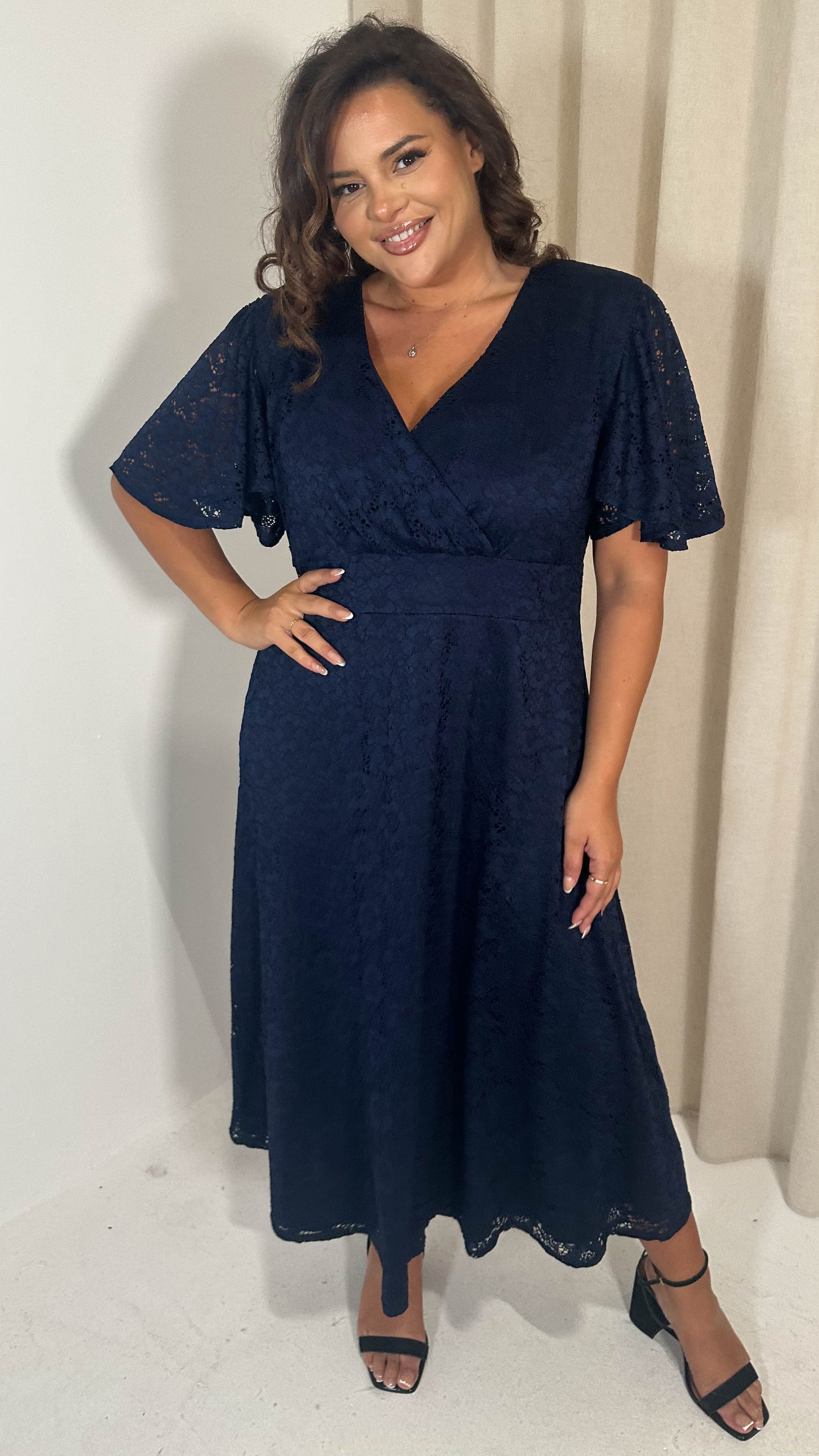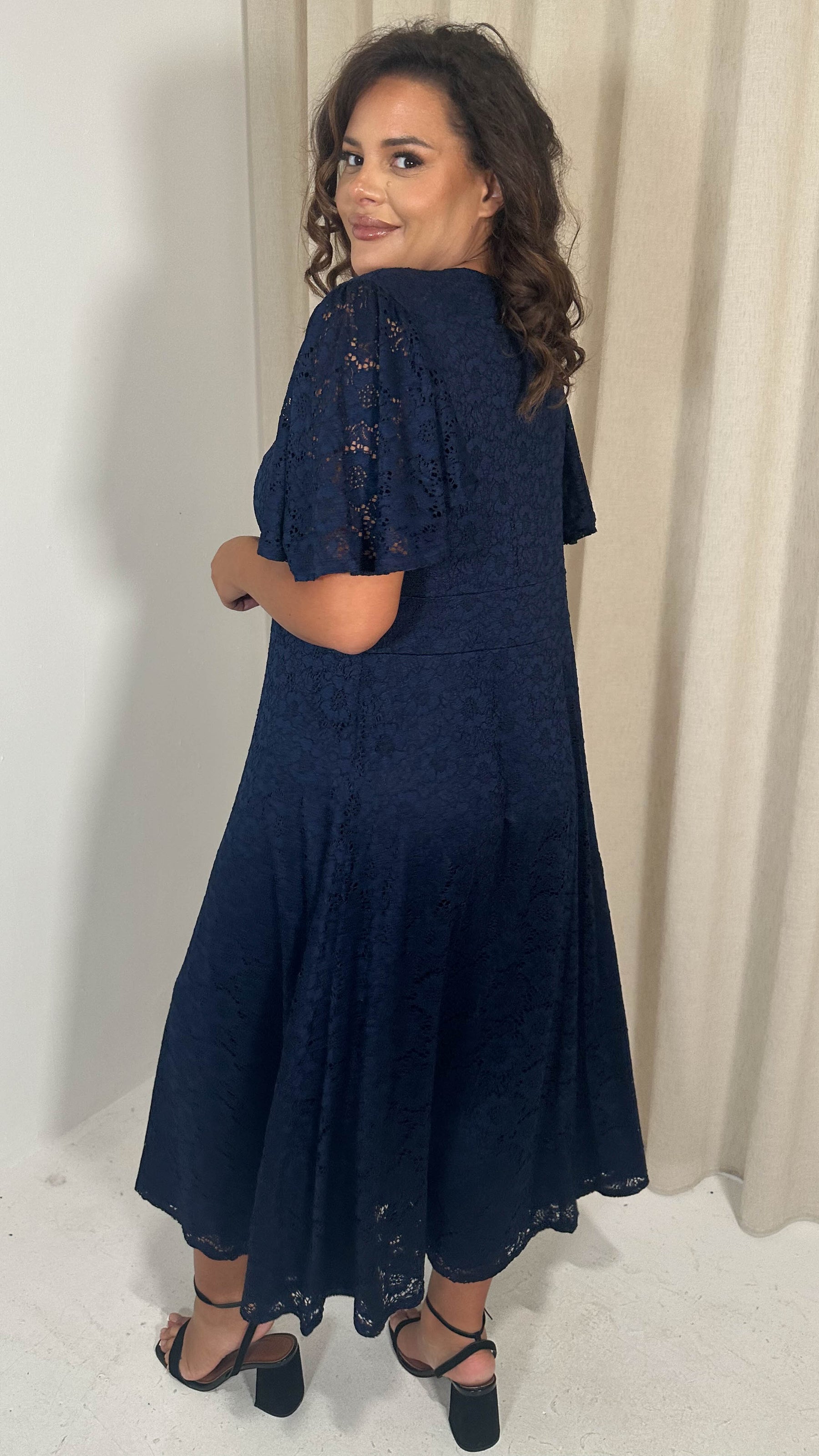 CurveWow Lace Angel Sleeve Dress Navy