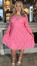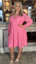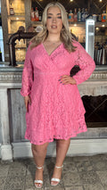 CurveWow Lace Plunge Ruffle Skater Dress Pink