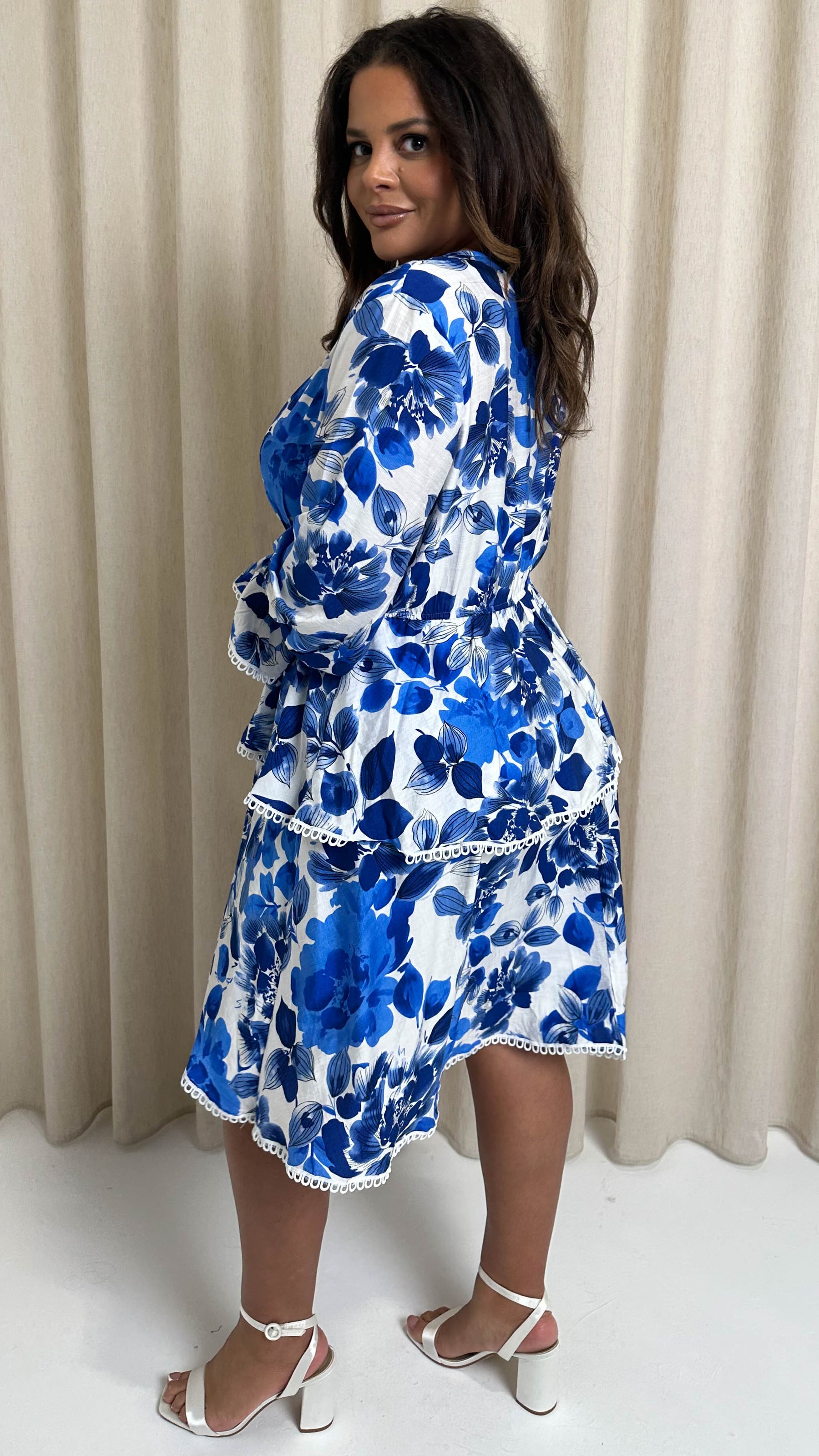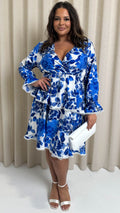CurveWow Lace Trim Wrap Tiered Dress Blue/White Floral