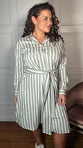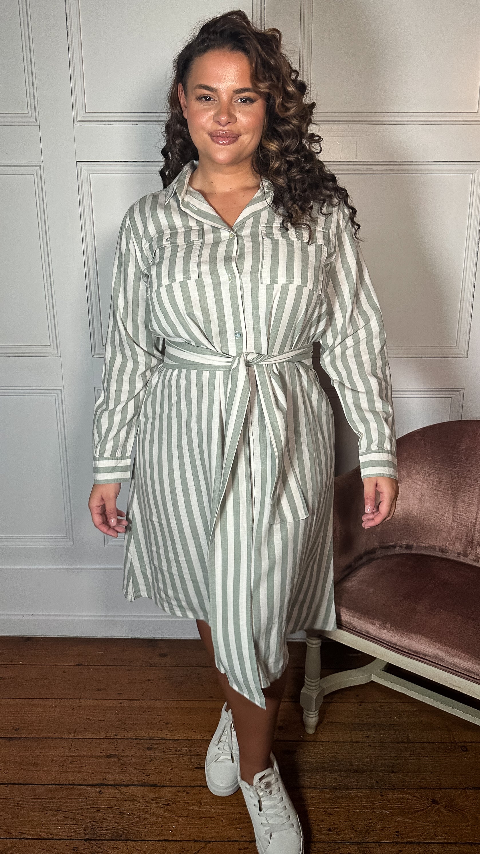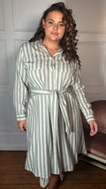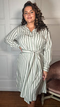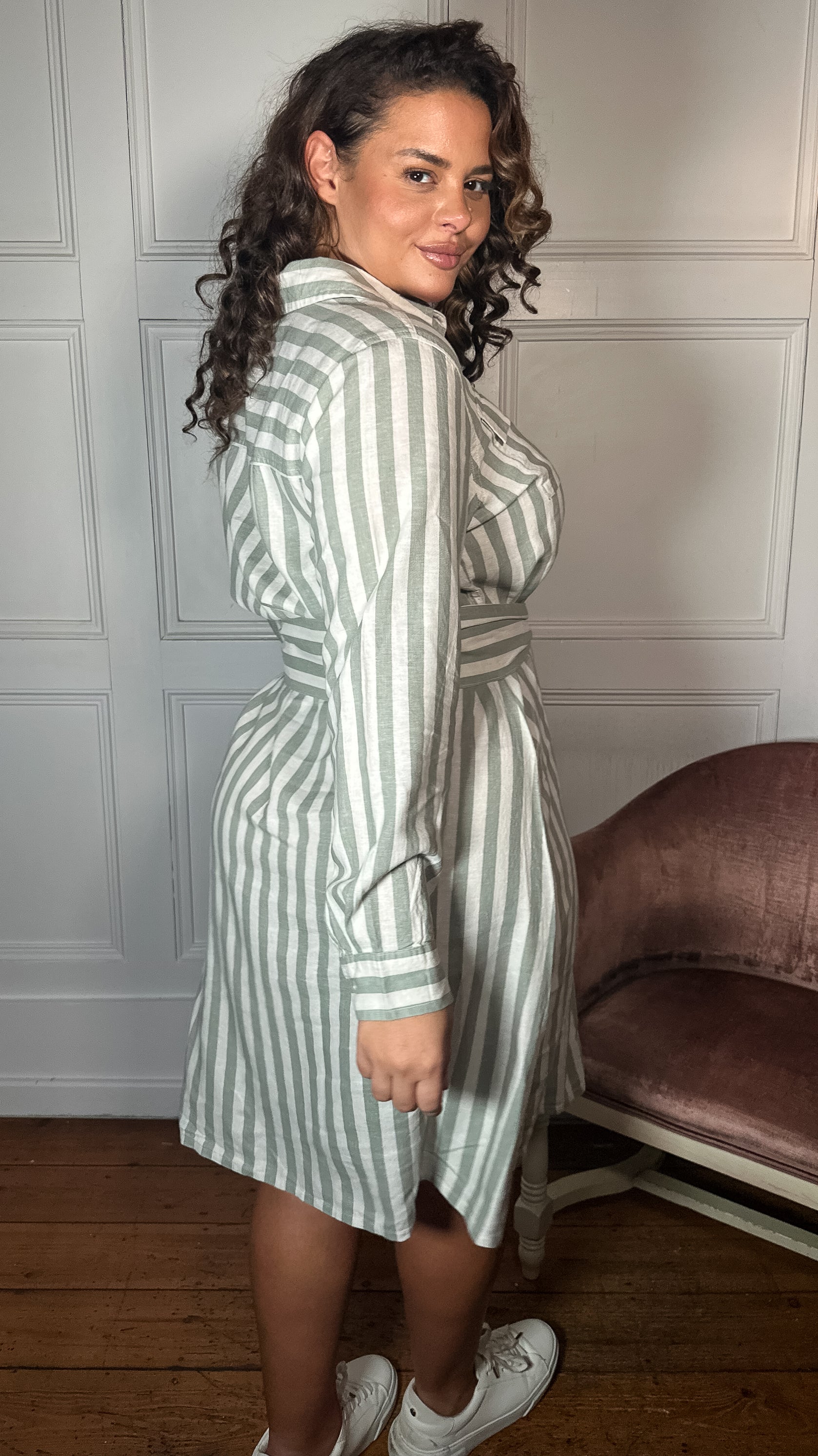 CurveWow Linen Belted Oversized Shirt Dress Green/White Stripe