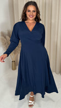 CurveWow Long Pleat Sleeve Wrap Dress Plain Navy