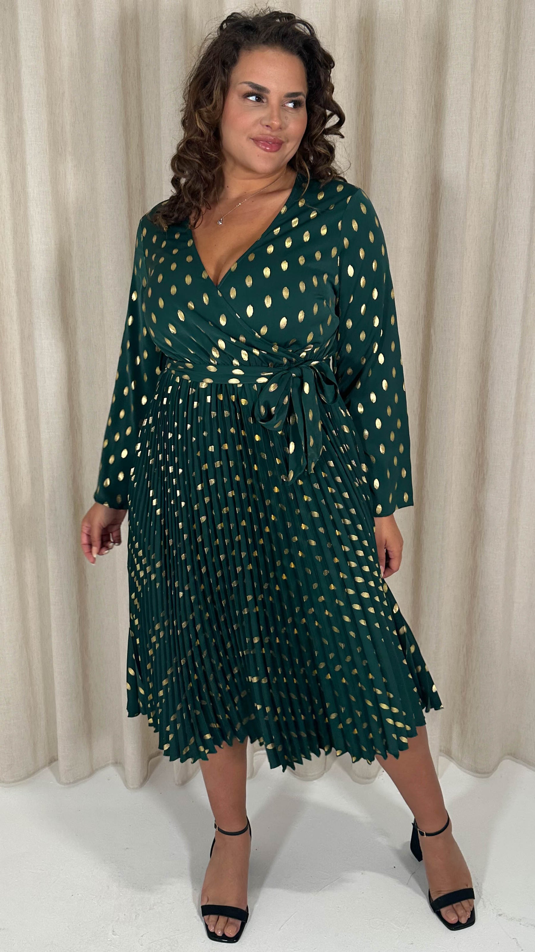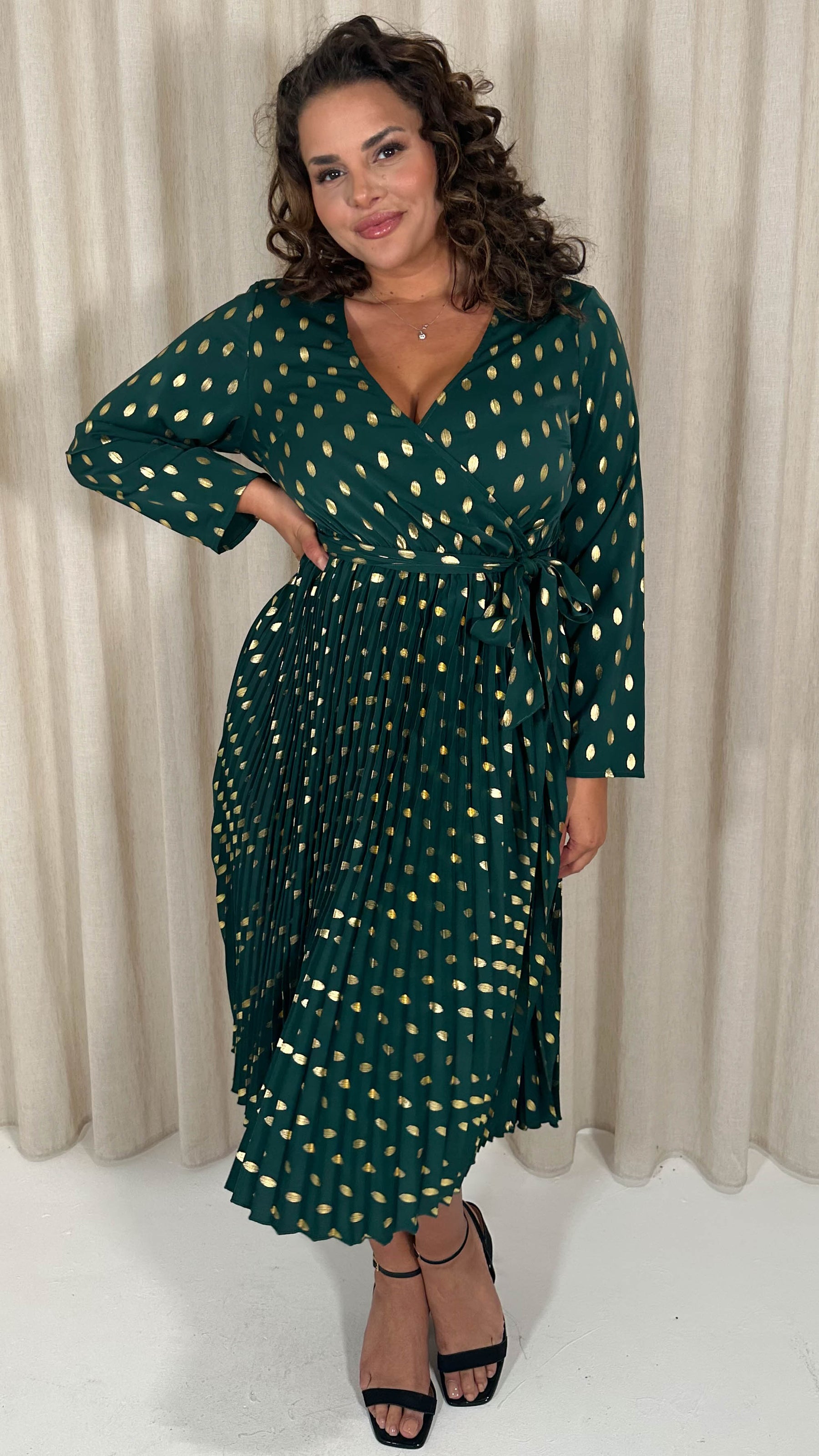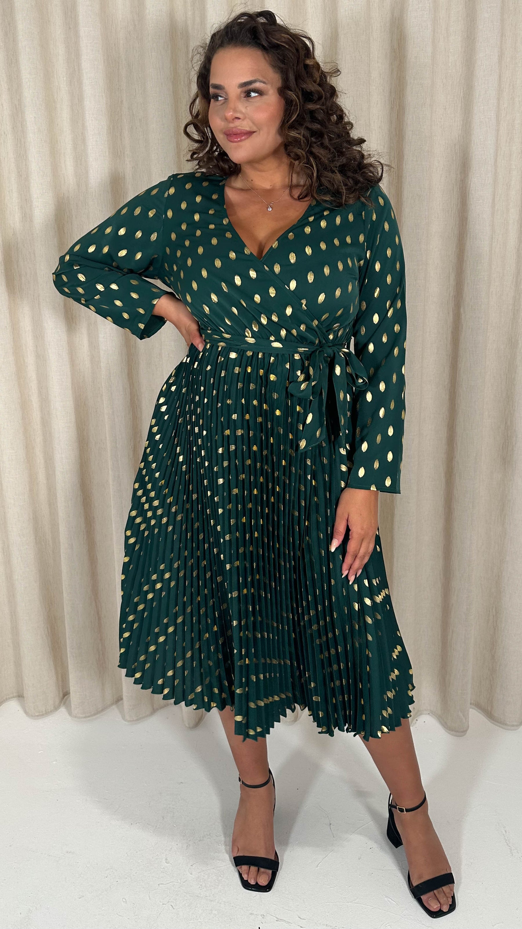 CurveWow Long Sleeve Pleated Wrap Dress Green Spot